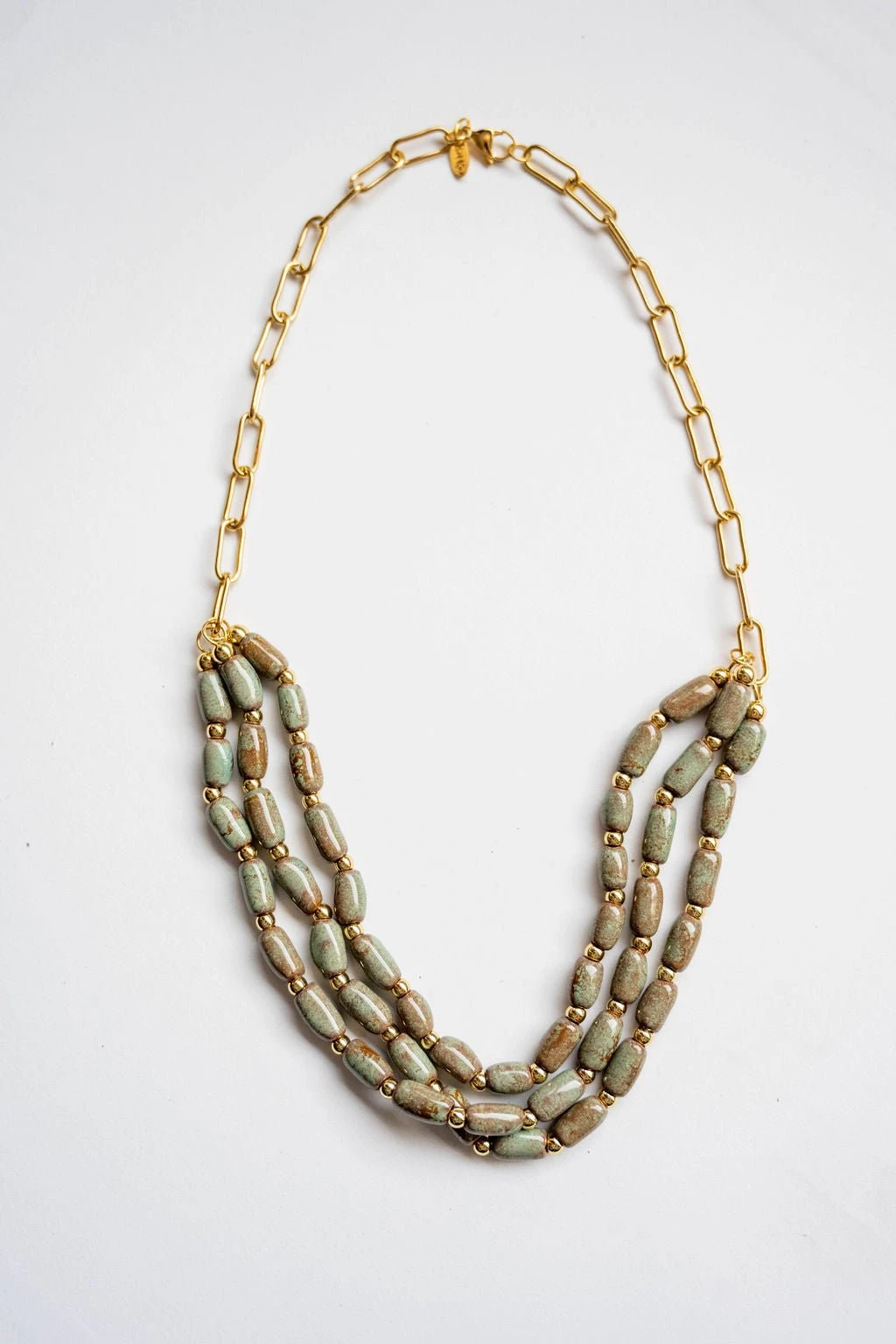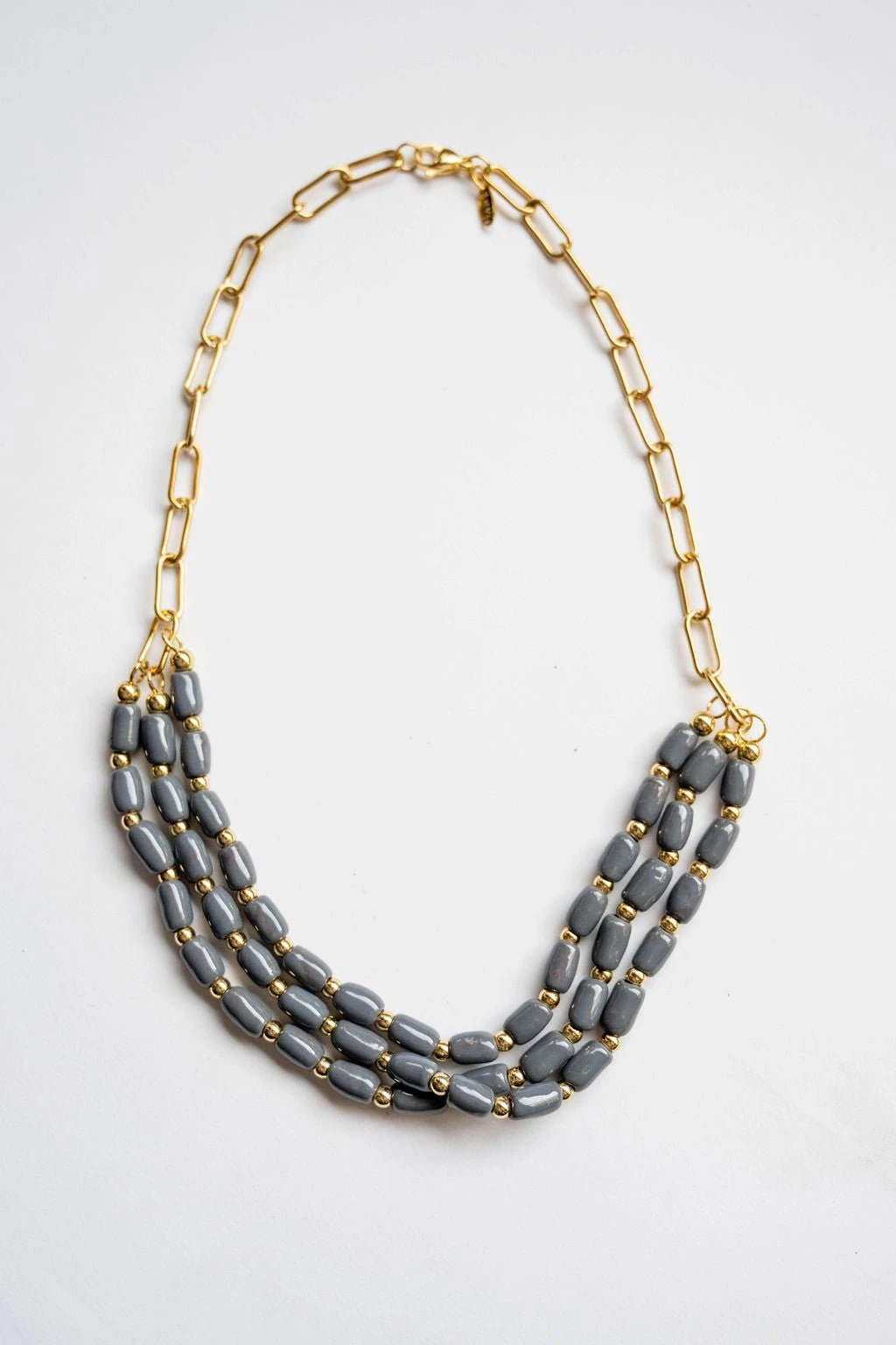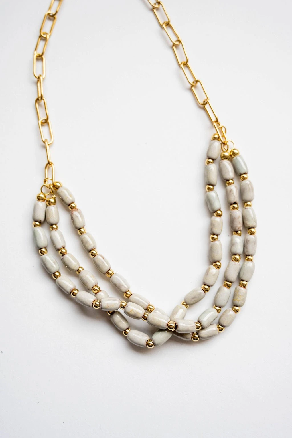 Three strands of clay beads makes this a staple piece to dress up even the most casual of outfits. Pair this with our clay bracelet for a complete look!