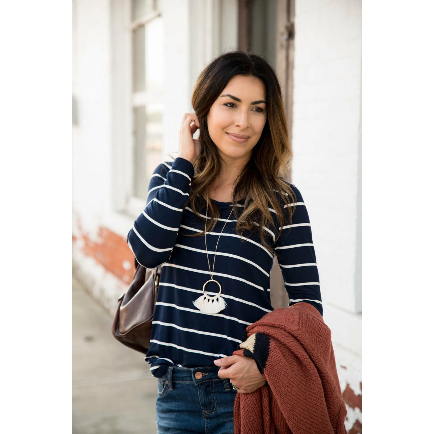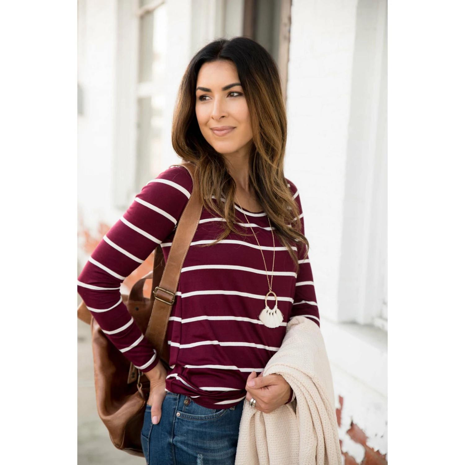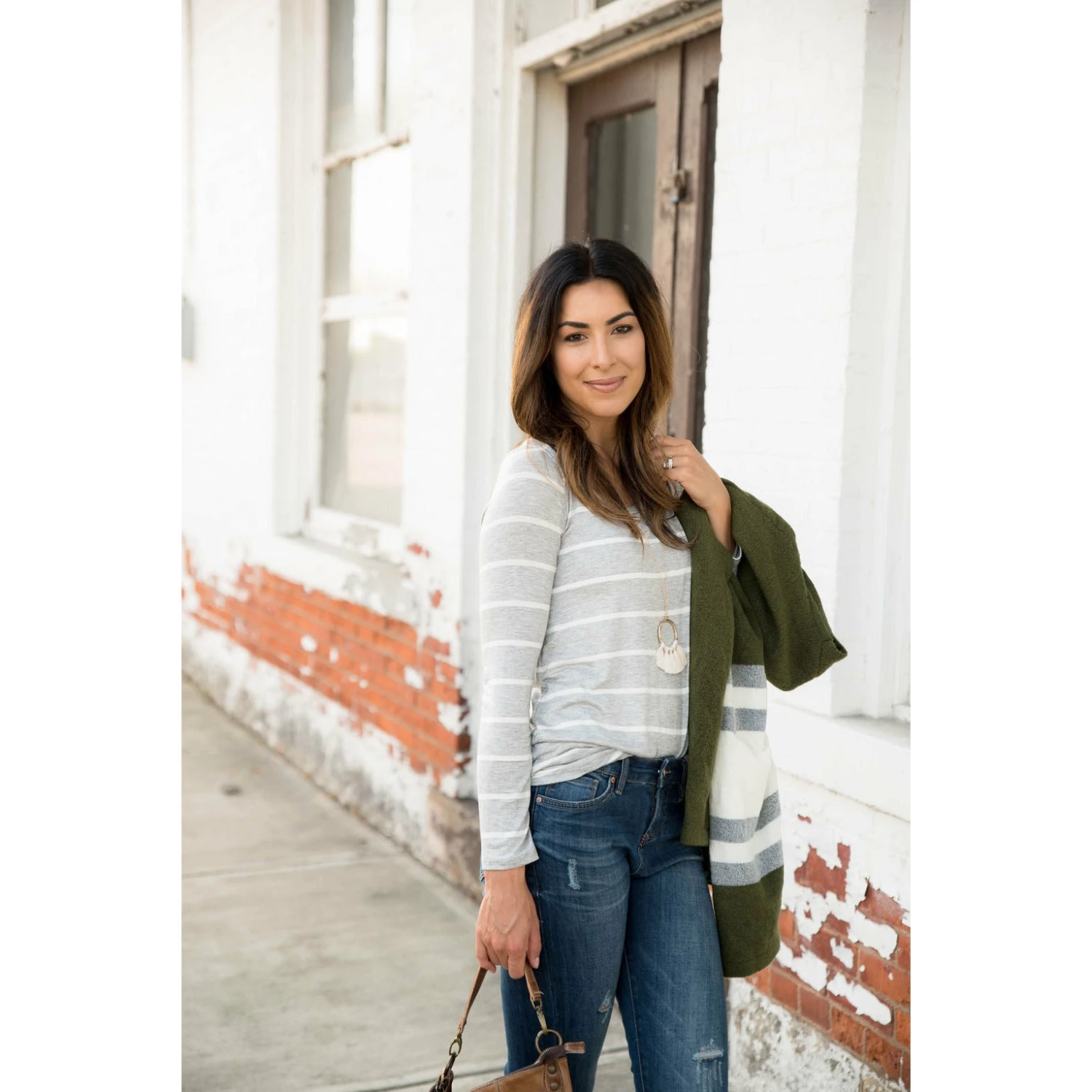 Our basic tees are a favorite around here not to mention it is so soft! It is long enough to wear with leggings for a more relaxed look or paired with jeans and booties for a dressed up look!Â