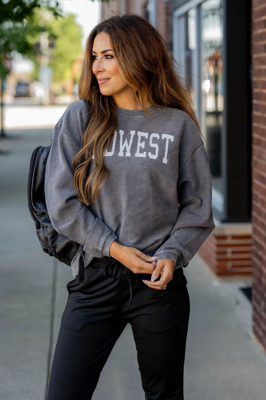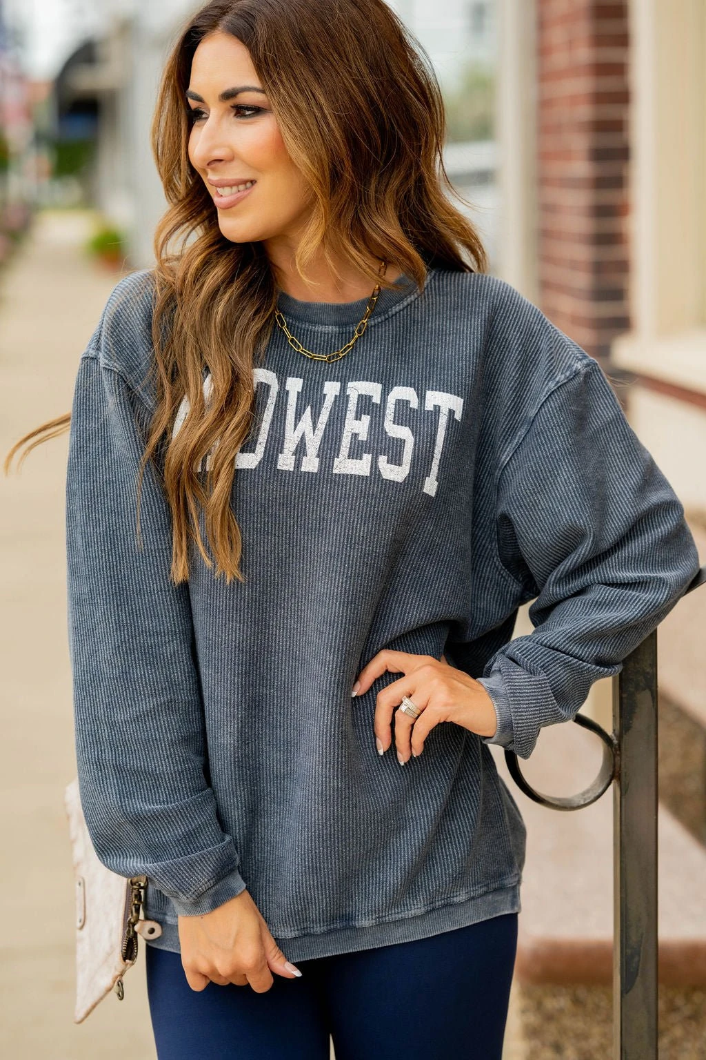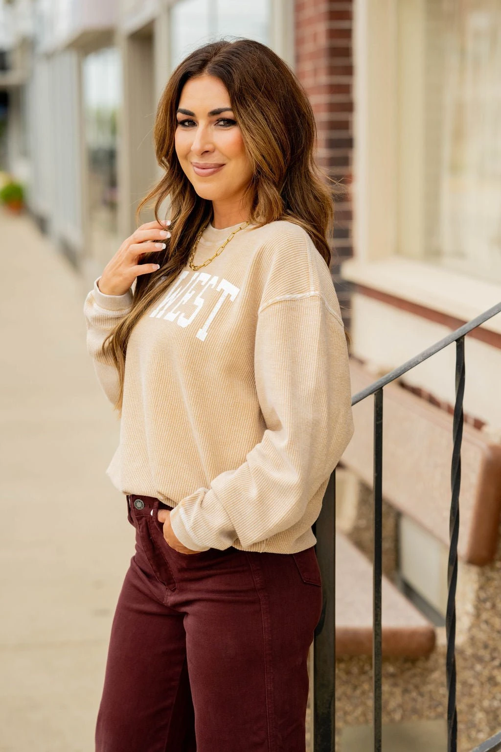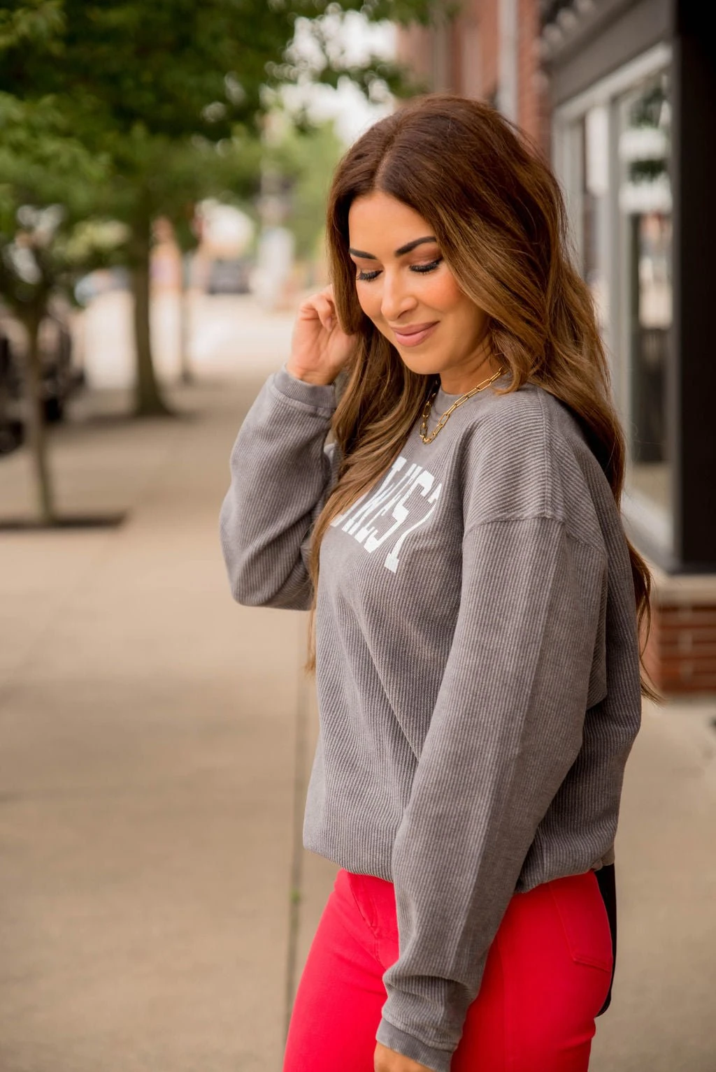 Crewnecks are a cold weather staple, so stock up while you can! Cute and comfortable, these graphic crewnecks look great with jeans and boots! This crewneck is elevated with a ribbed texture to really set it apart from the rest!