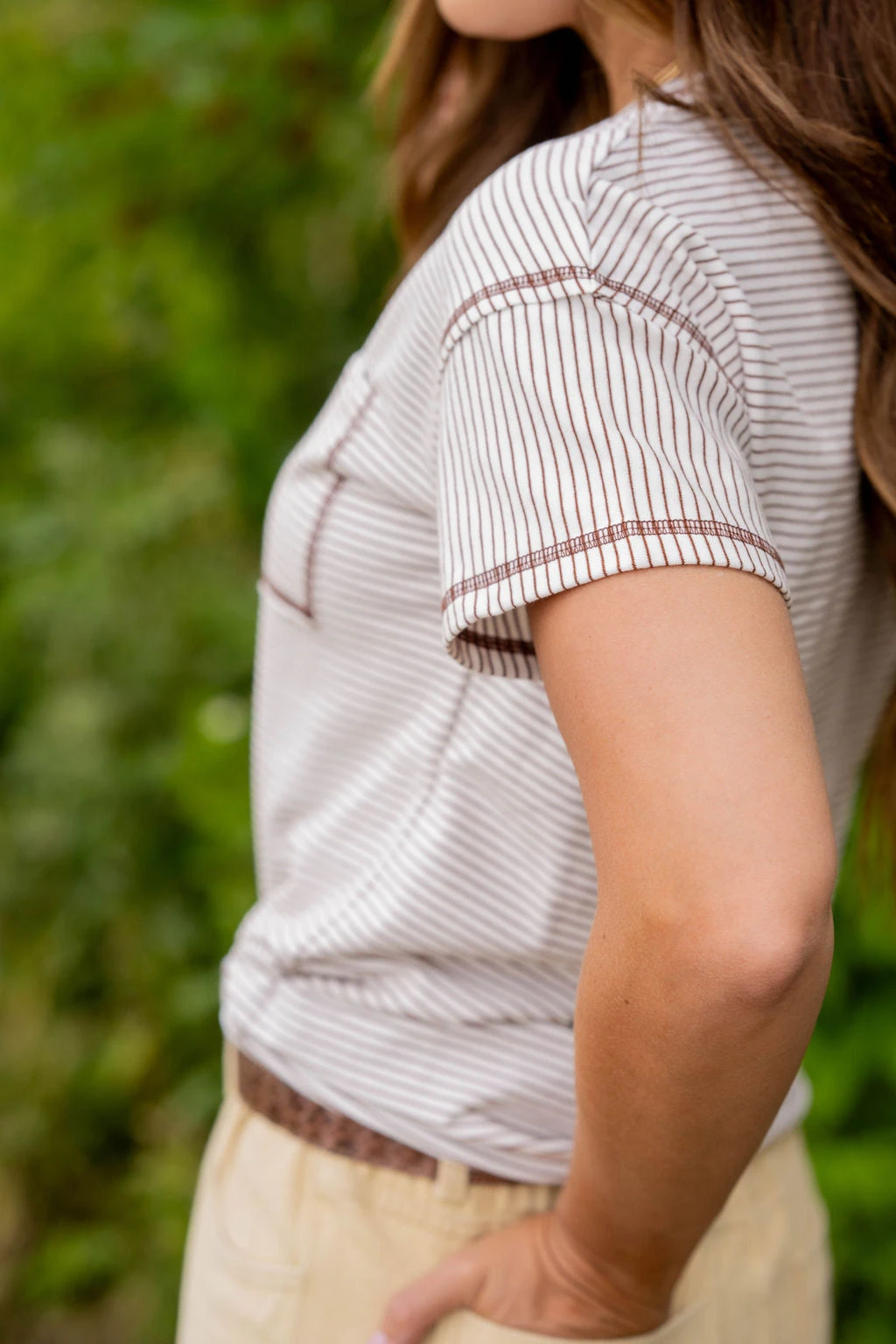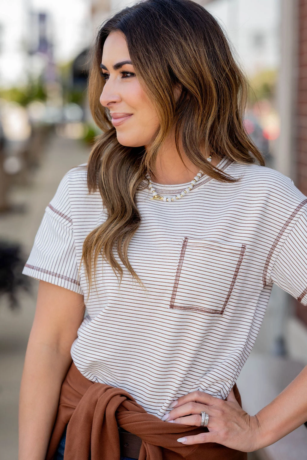A simple tee with stripes, bold raw stitching, and a pocket to give it that extra character! We love that this works for all season with its ease of layering! Dress this up or down for wherever the day takes you!