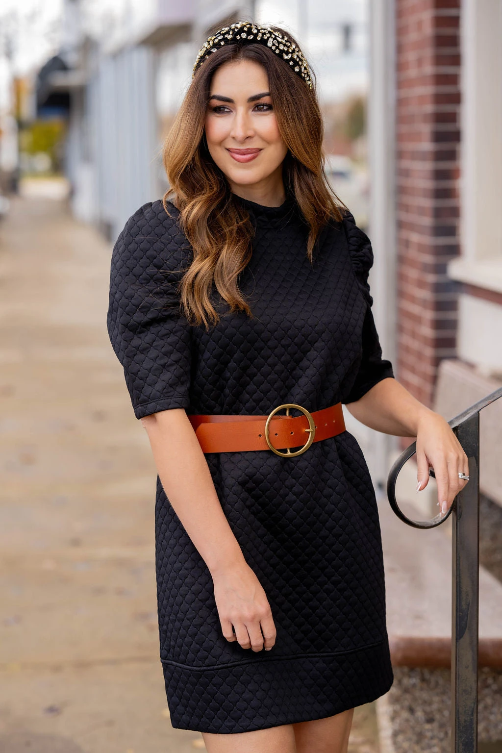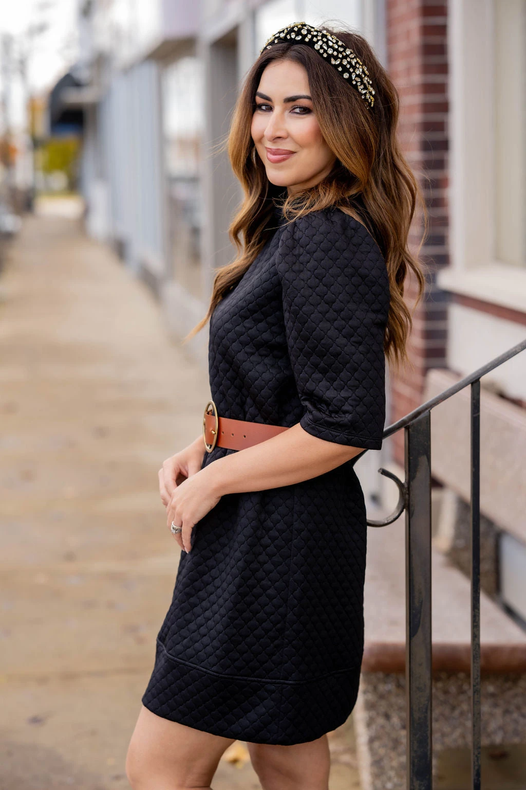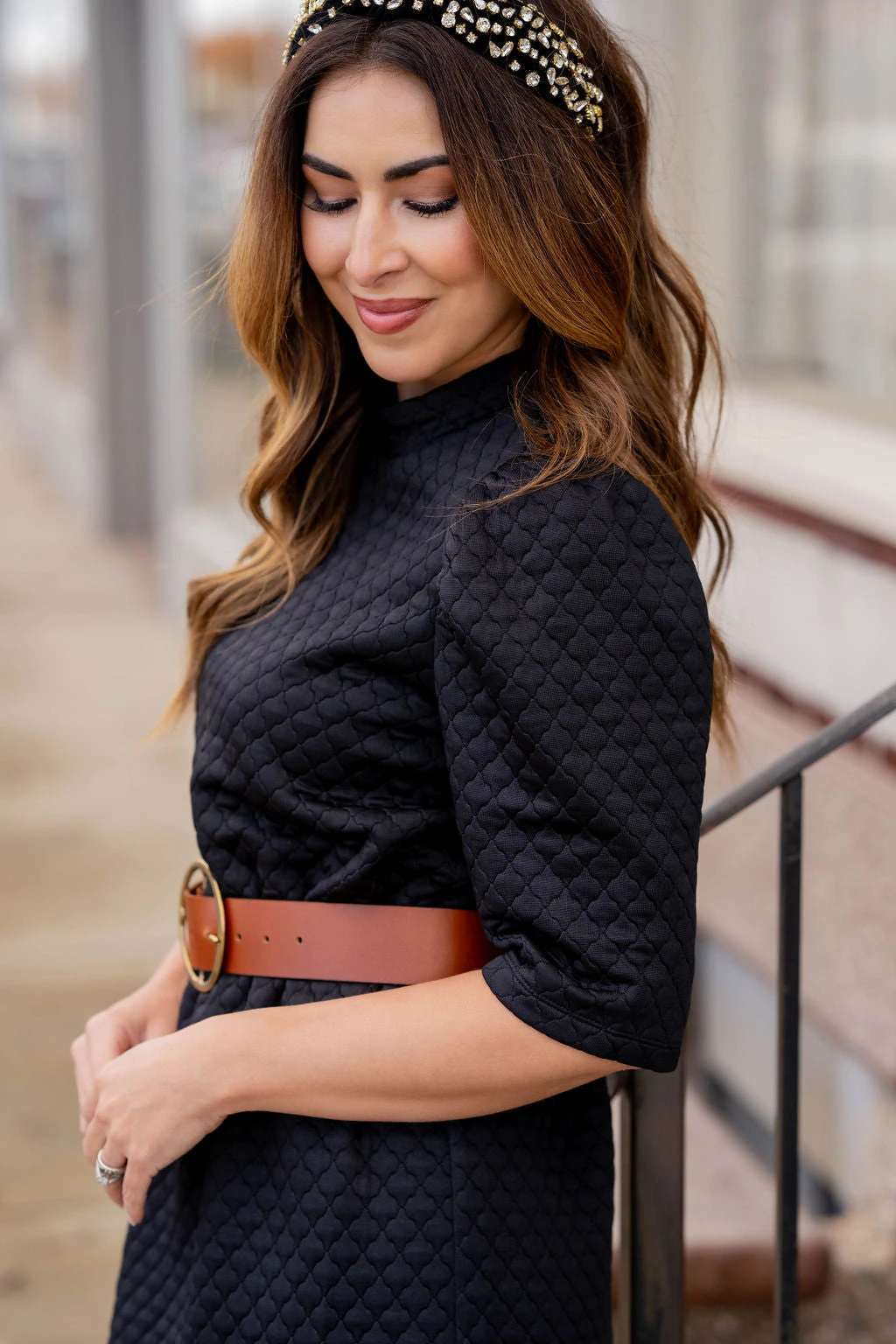 A fun and unique dress that is sure to have you turning heads! With 3/4 sleeves and a lightweight material, this dress can be worn in the warmer months or layered with a cardigan, blazer, or jacket in the cooler ones. The bold texture and gathered shoulder detailing gives this a more elevated look! This will definitely be a go-to for all of your events or occasions!