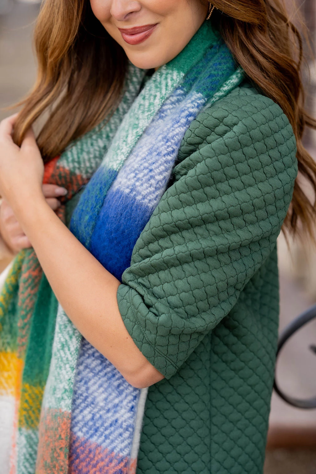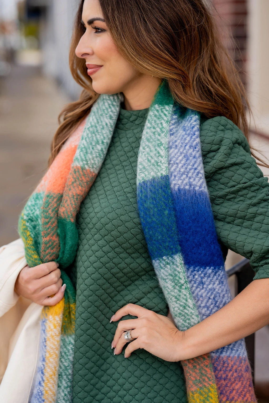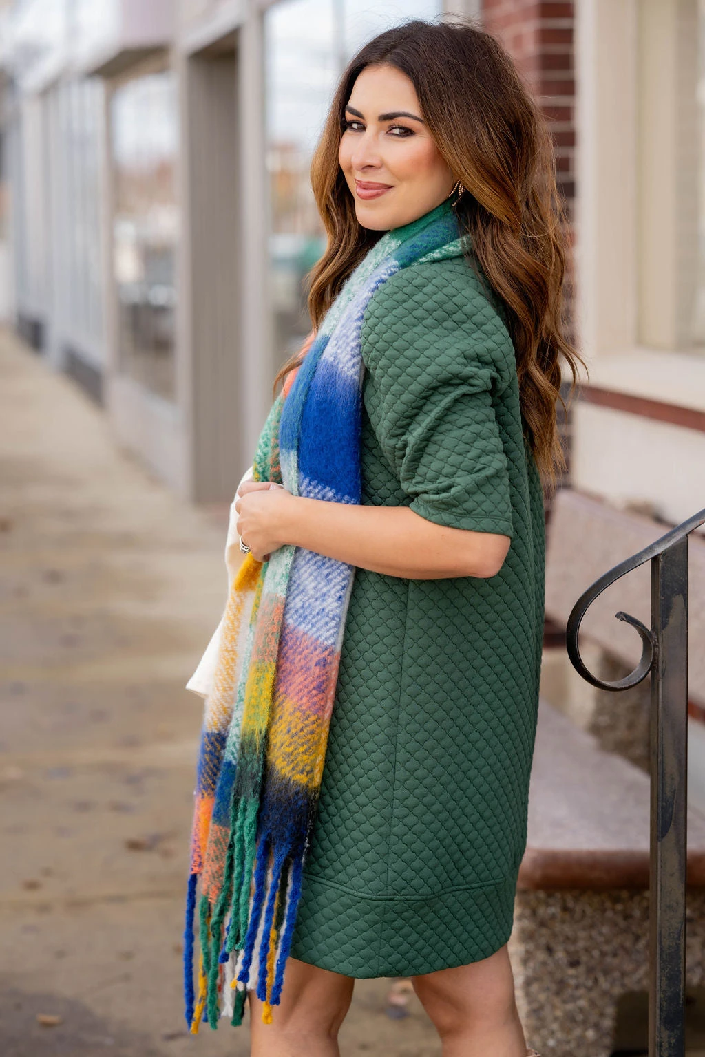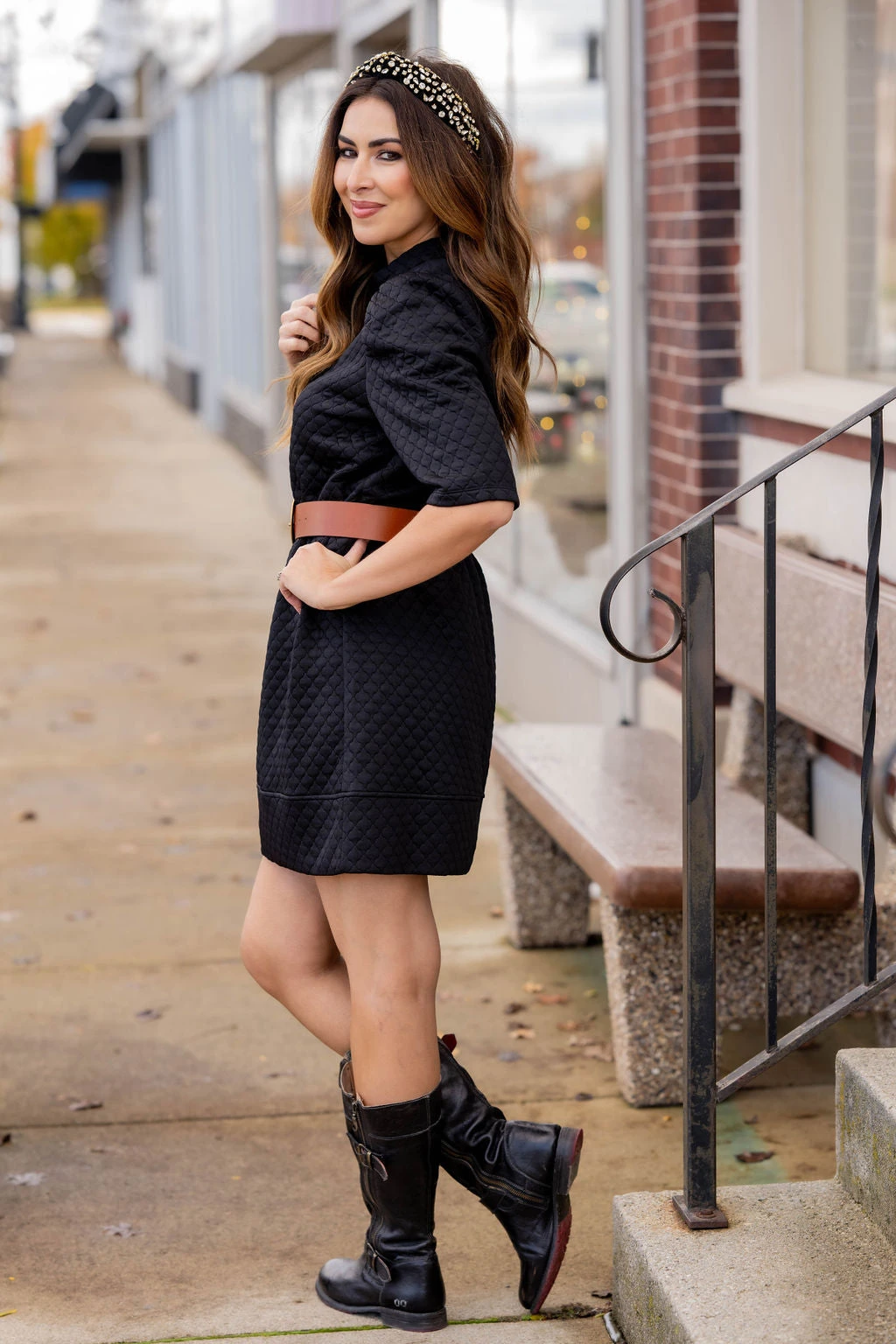 A fun and unique dress that is sure to have you turning heads! With 3/4 sleeves and a lightweight material, this dress can be worn in the warmer months or layered with a cardigan, blazer, or jacket in the cooler ones. The bold texture and gathered shoulder detailing gives this a more elevated look! This will definitely be a go-to for all of your events or occasions!