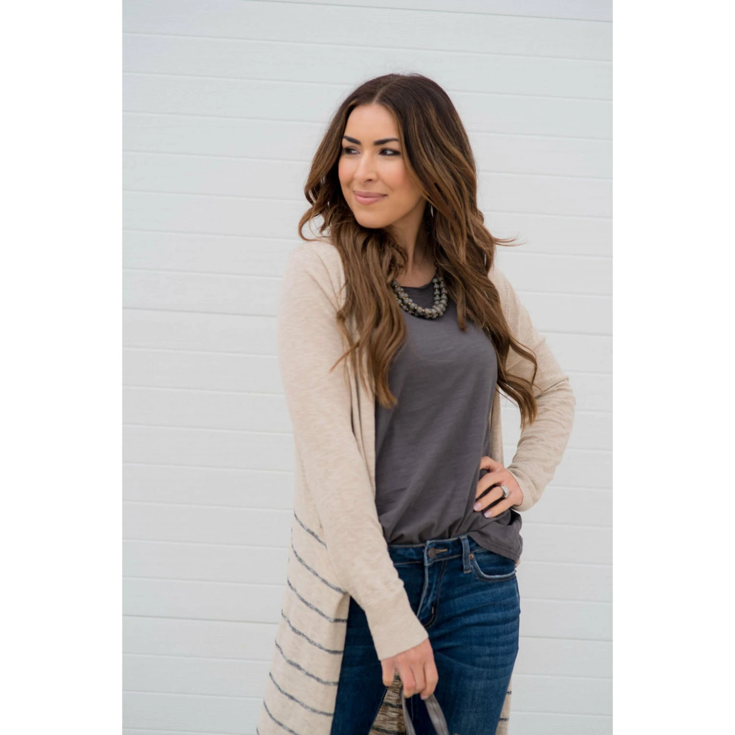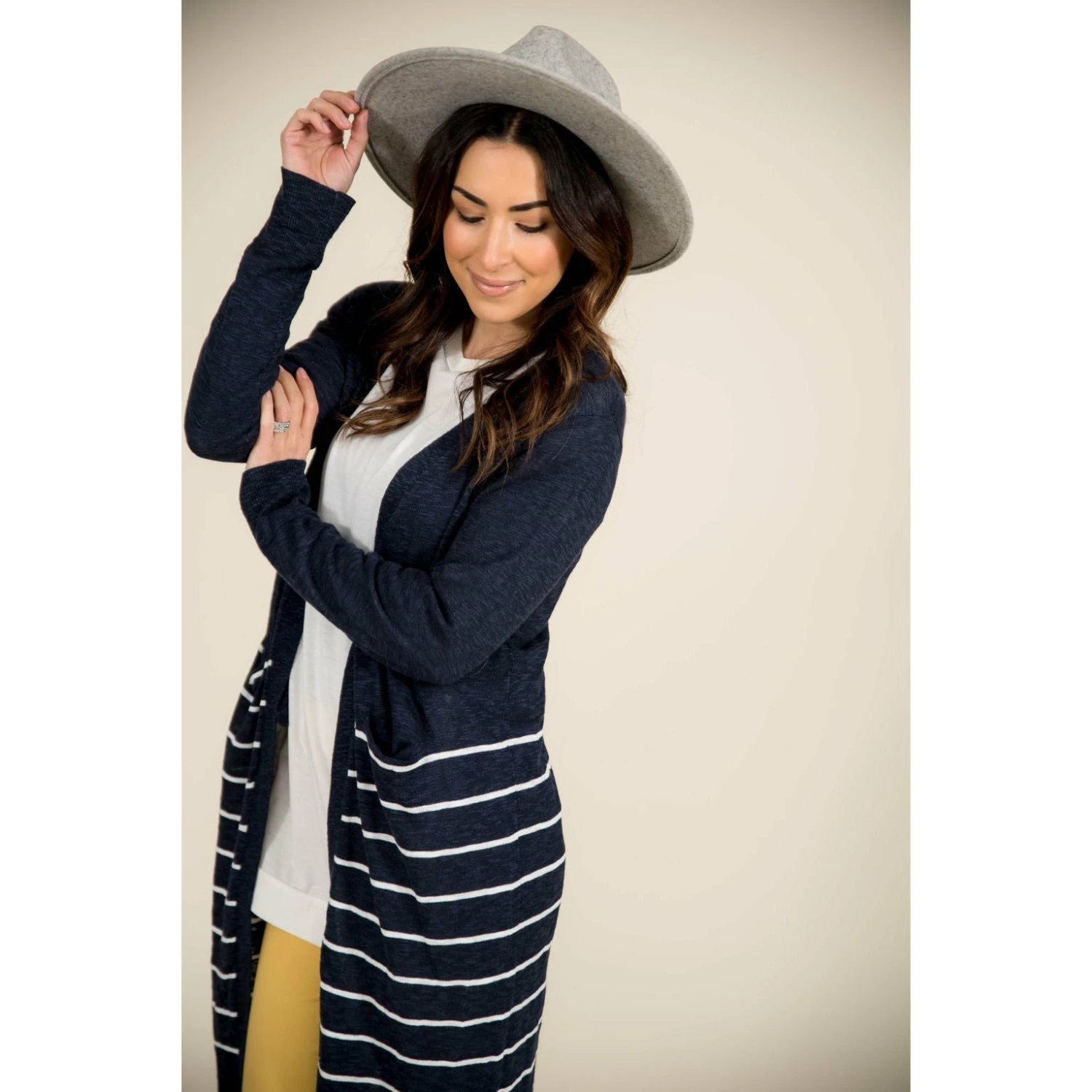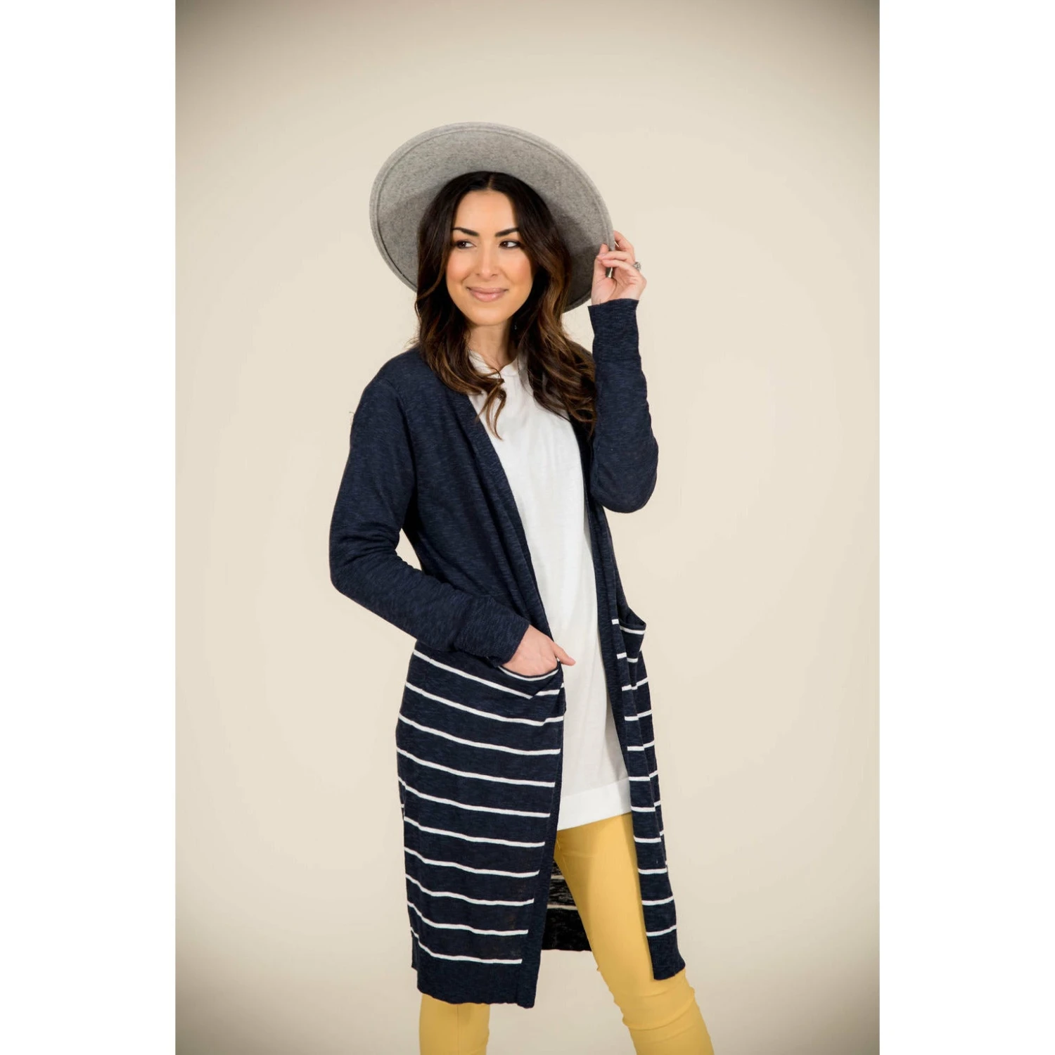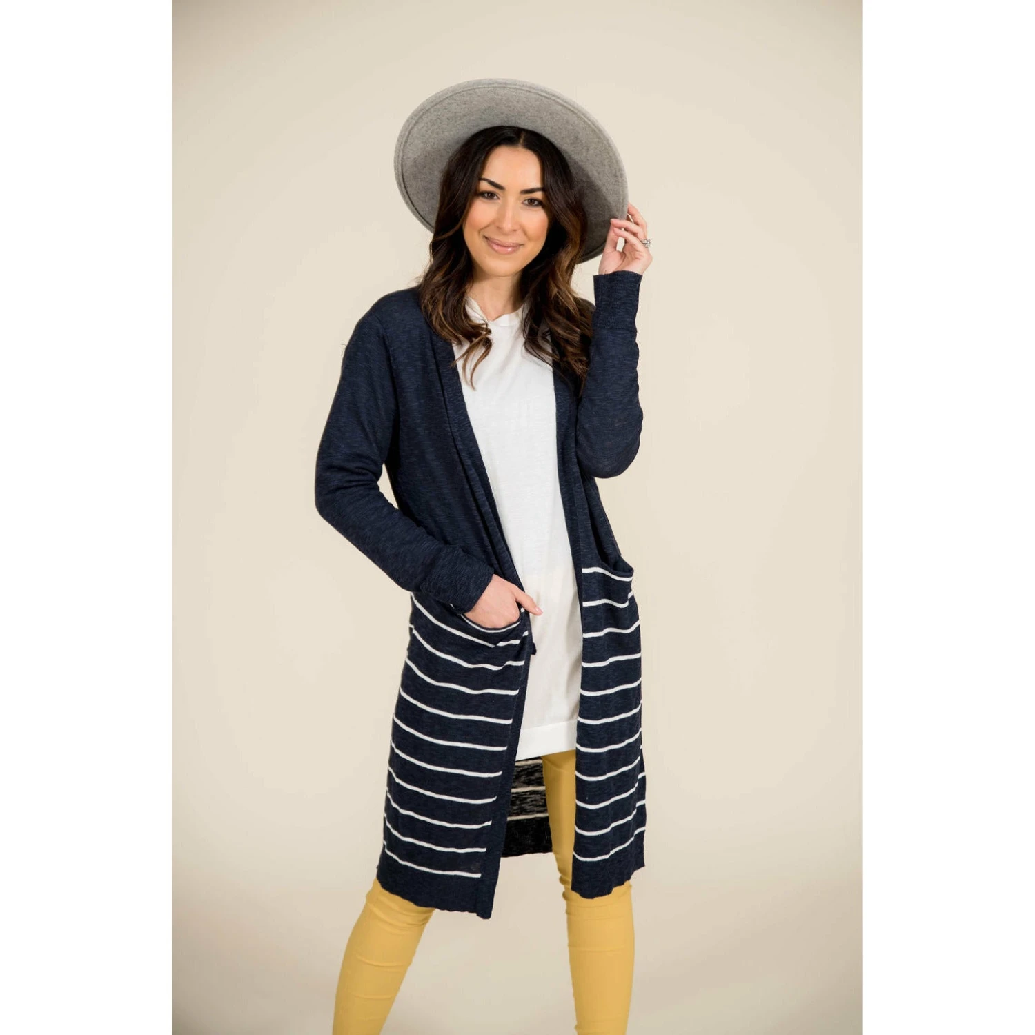 On this cardigan you get both solid and stripes! This cardigan is light weight and is long to keep you comfortable for any day out with friends!