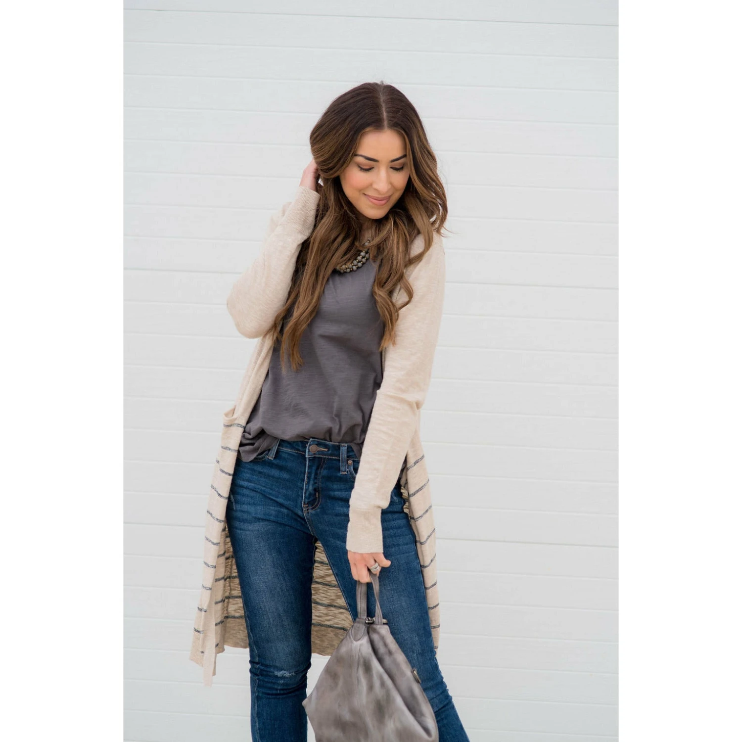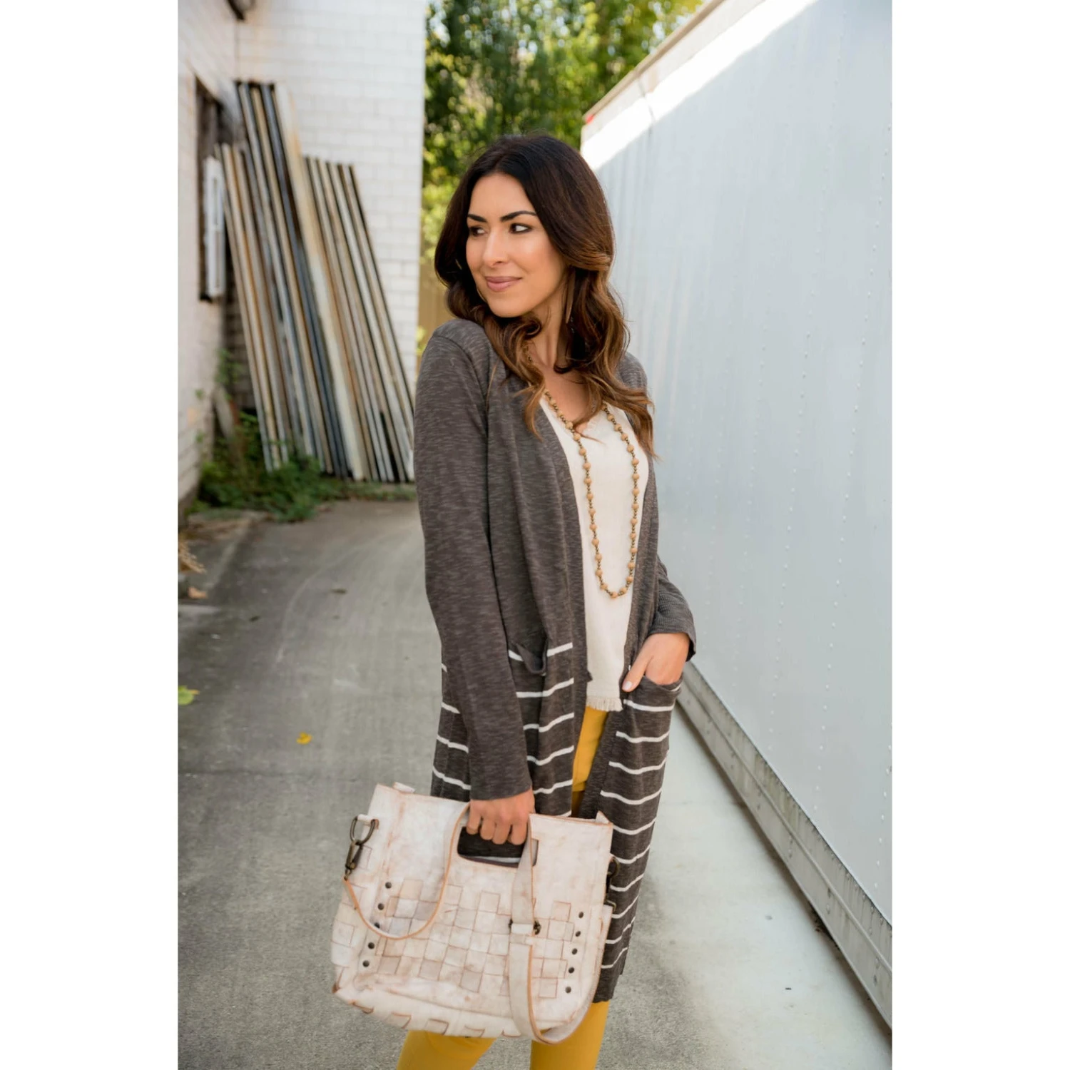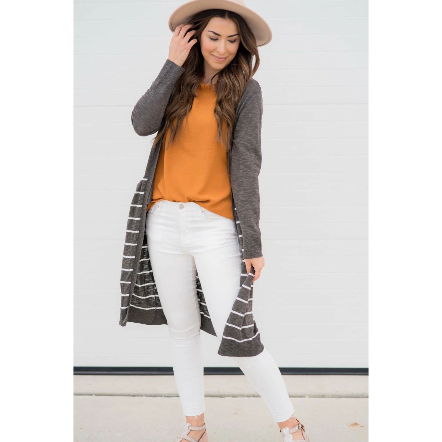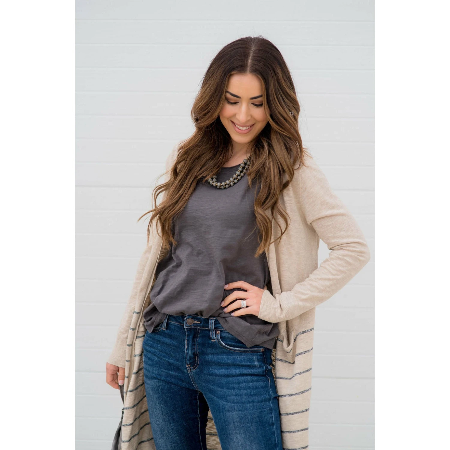 On this cardigan you get both solid and stripes! This cardigan is light weight and is long to keep you comfortable for any day out with friends!