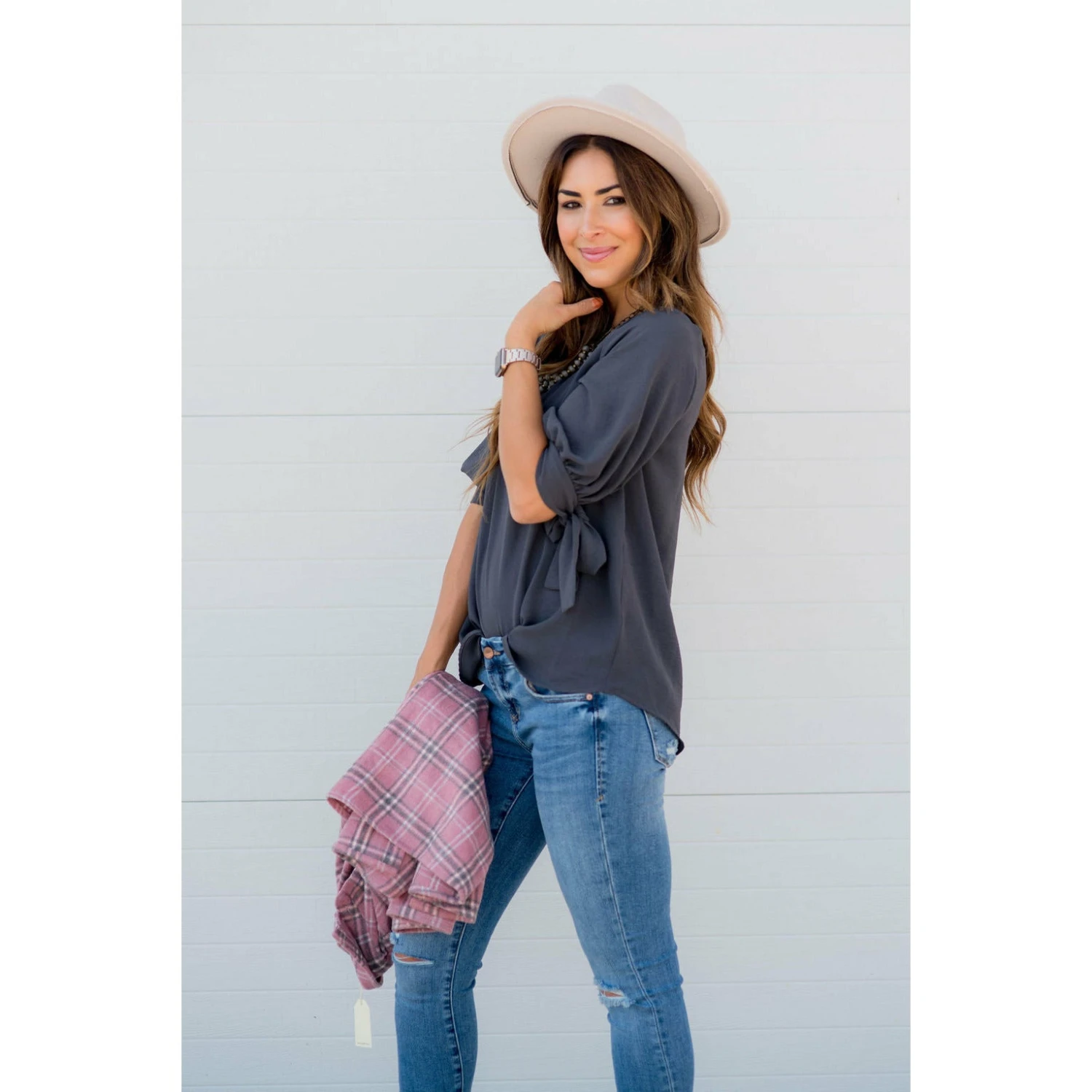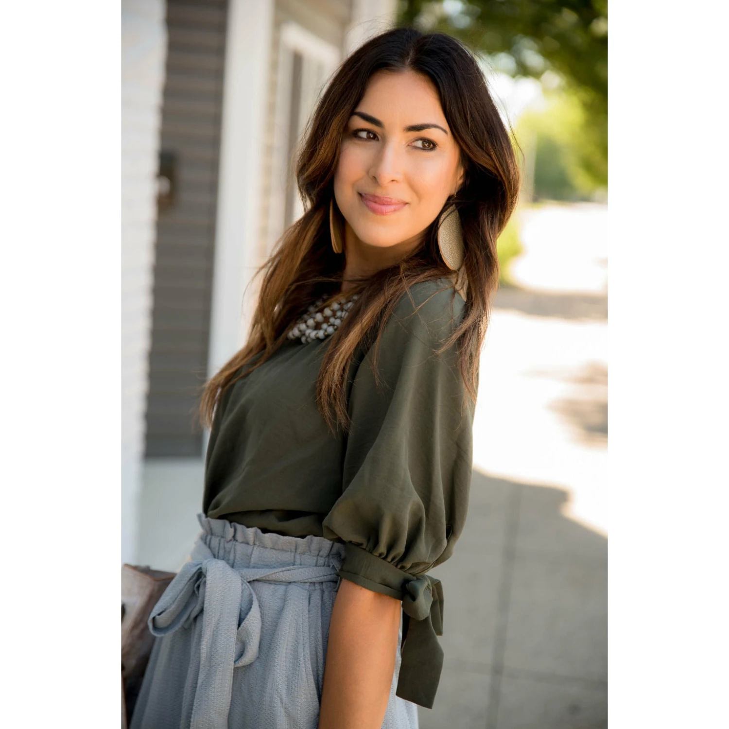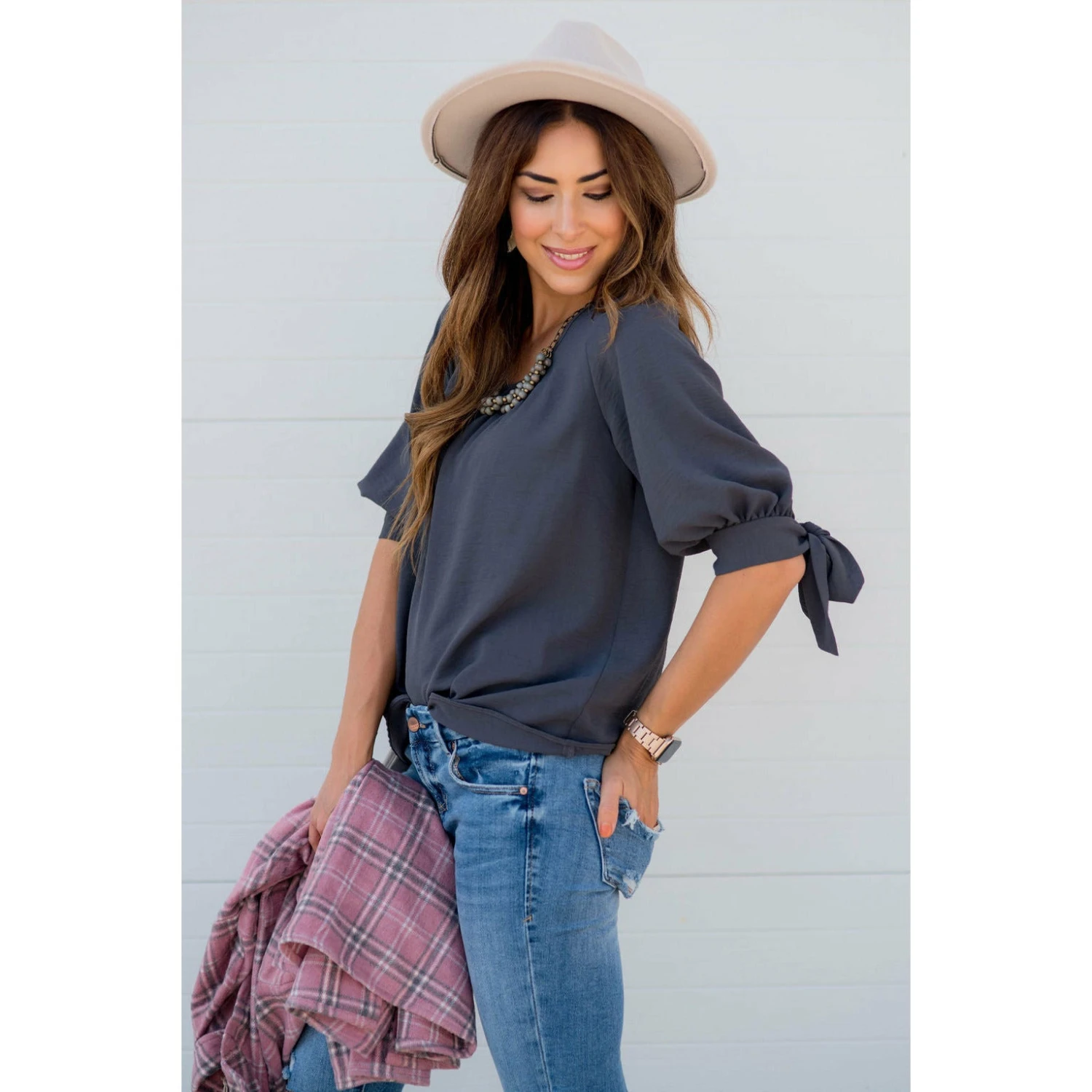 This blouse you need to add to your closet! The bows on the sleeve give this blouse a cute and classy look!