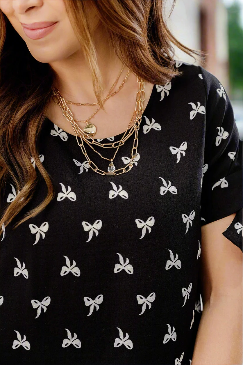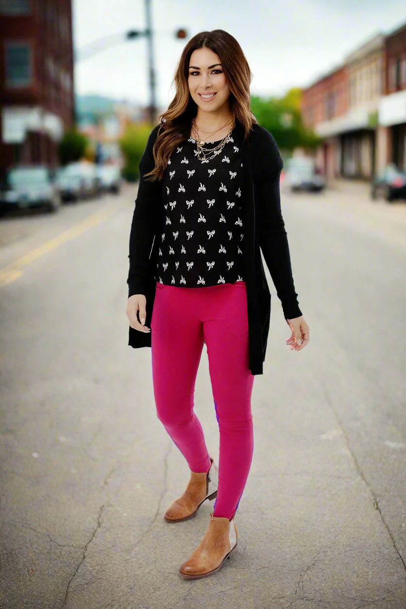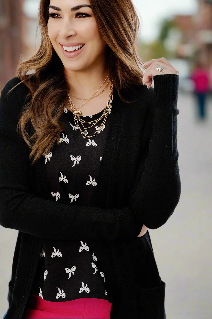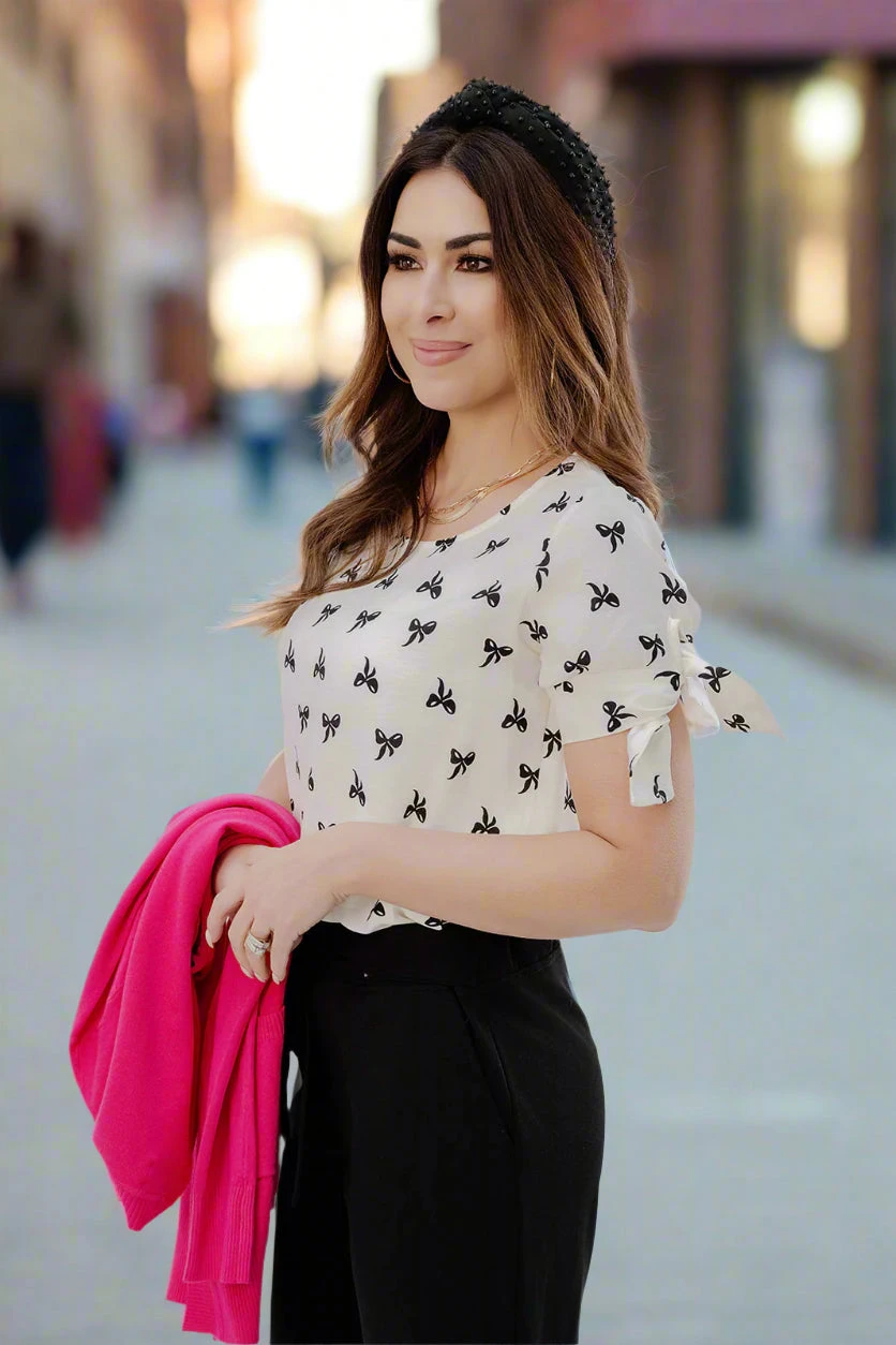 Bows are super trendy right now and we see why! The bow print on this blouse gives it a fun, feminine, and flirty vibe! The tie accented sleeves allow you to wear this in the warmer months or layer with a blazer, cardigan, or jacket in the cooler ones. We love that you can tuck this into a skirt, pair with your favorite denim, throw on with some joggers, or elevate the whole look with a bold-colored Betsey’s Jegging! The possibilities are endless.Â