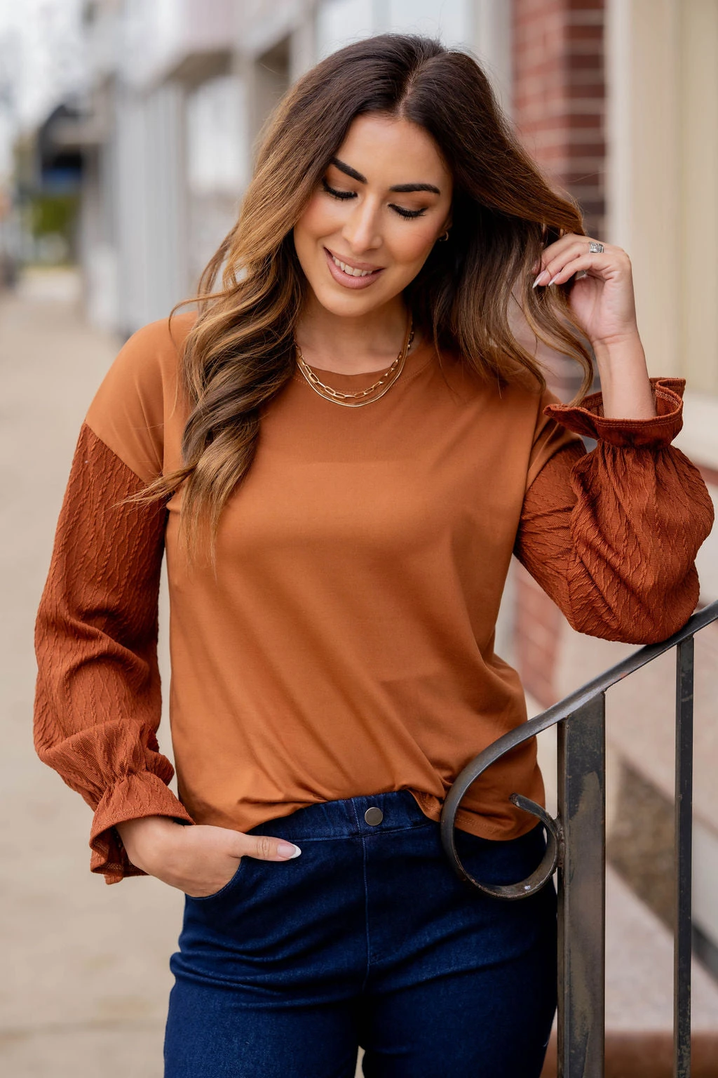 How cute is this blouse? With the braided texture statement sleeves and the solid body, this is a piece that you can dress up or down, depending on what you want! The cinched detailing on the sleeves elevates this top. It also looks great with a cardigan, vest, blazer, or jacket over it!
