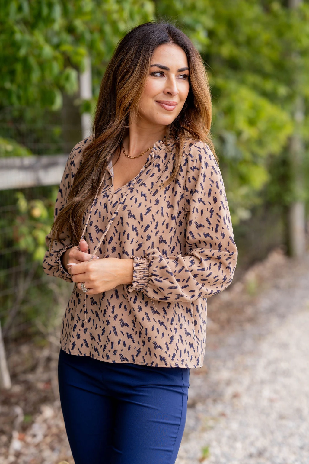 This printed top is perfect for quick, unique outfits! We love the colors, pattern, cinching, and the drawstrings. Wear this blouse more casually with your favorite denim or joggers or dress it up by tucking it into a high-waisted skirt or with a pair of our Betsey’s Jeggings and your favorite accessories. Lightweight enough to wear in the warmer months with shorts or layered in the cooler ones. The possibilities are endless with this one.