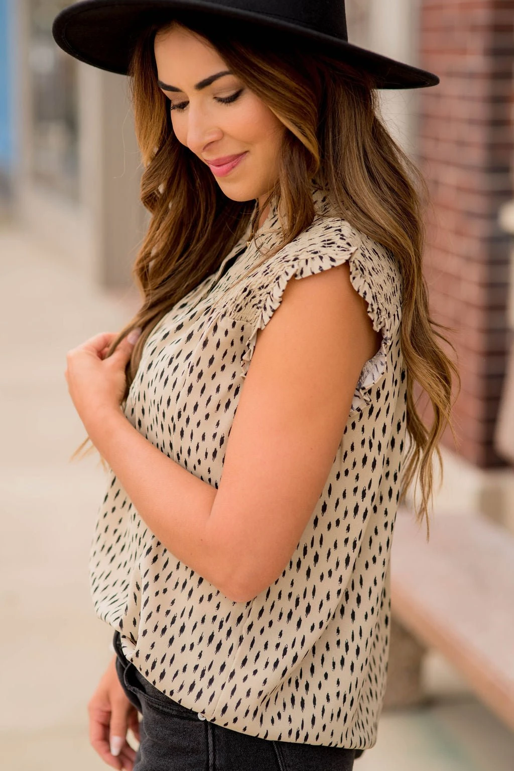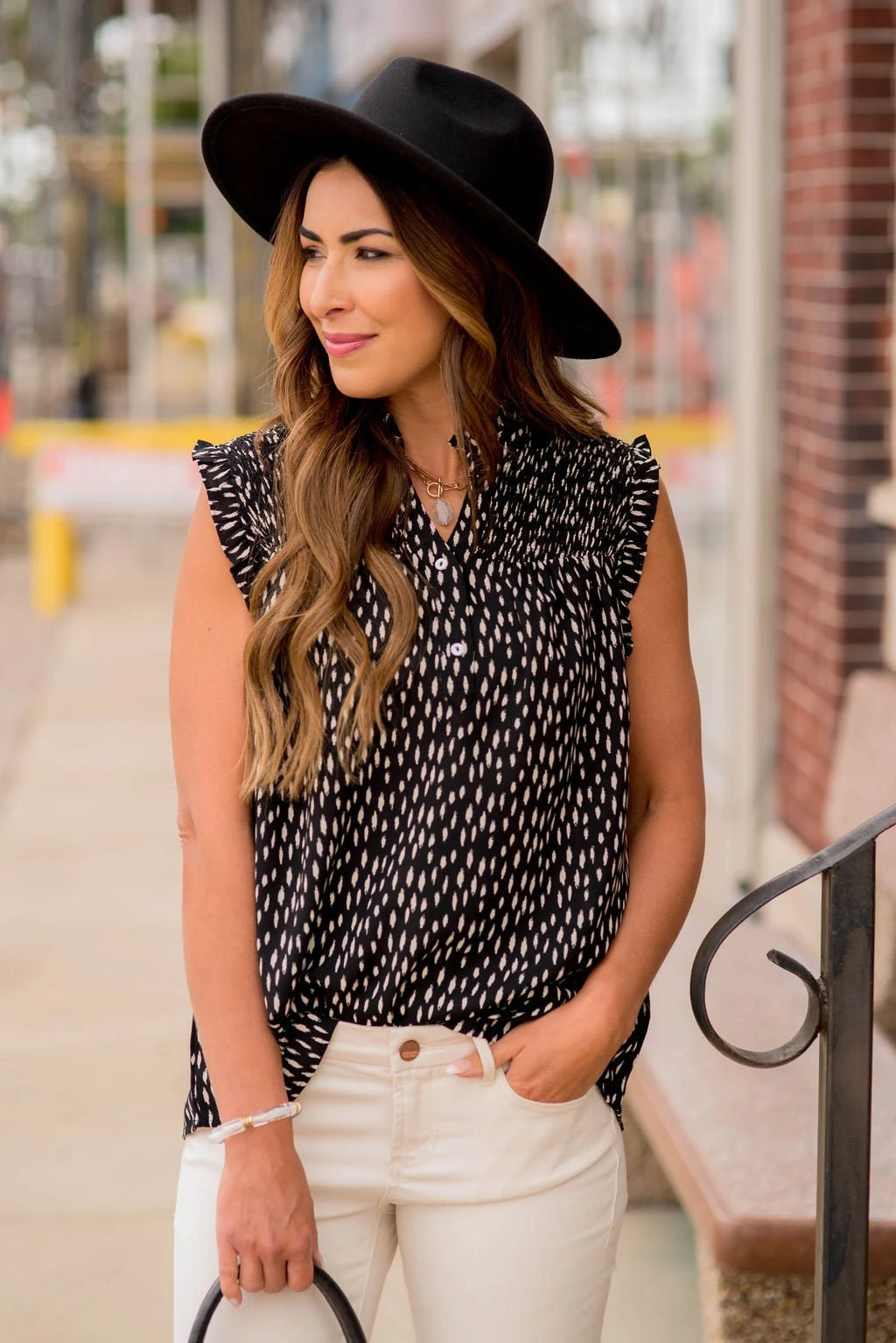 So many things to love about this tank! The brush stroke pattern, the smocked top detailing, the ruffle trim, and the button accents! We love that this can be paired with your favorite shorts or a skirt for the warmer months or with a cardigan or denim jacket for the cooler ones!