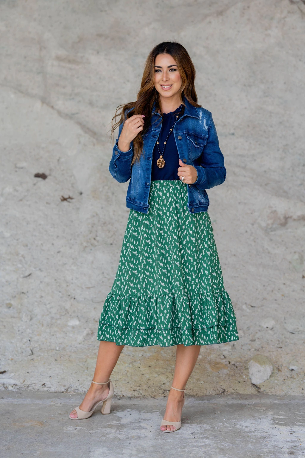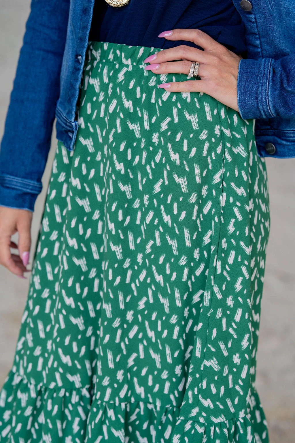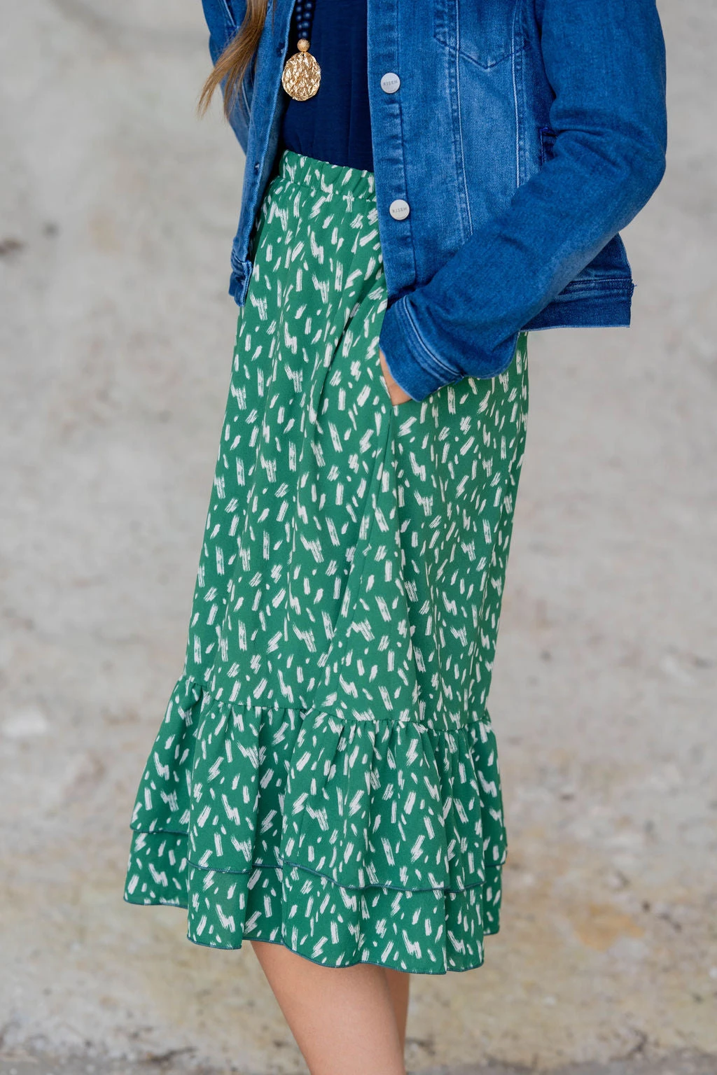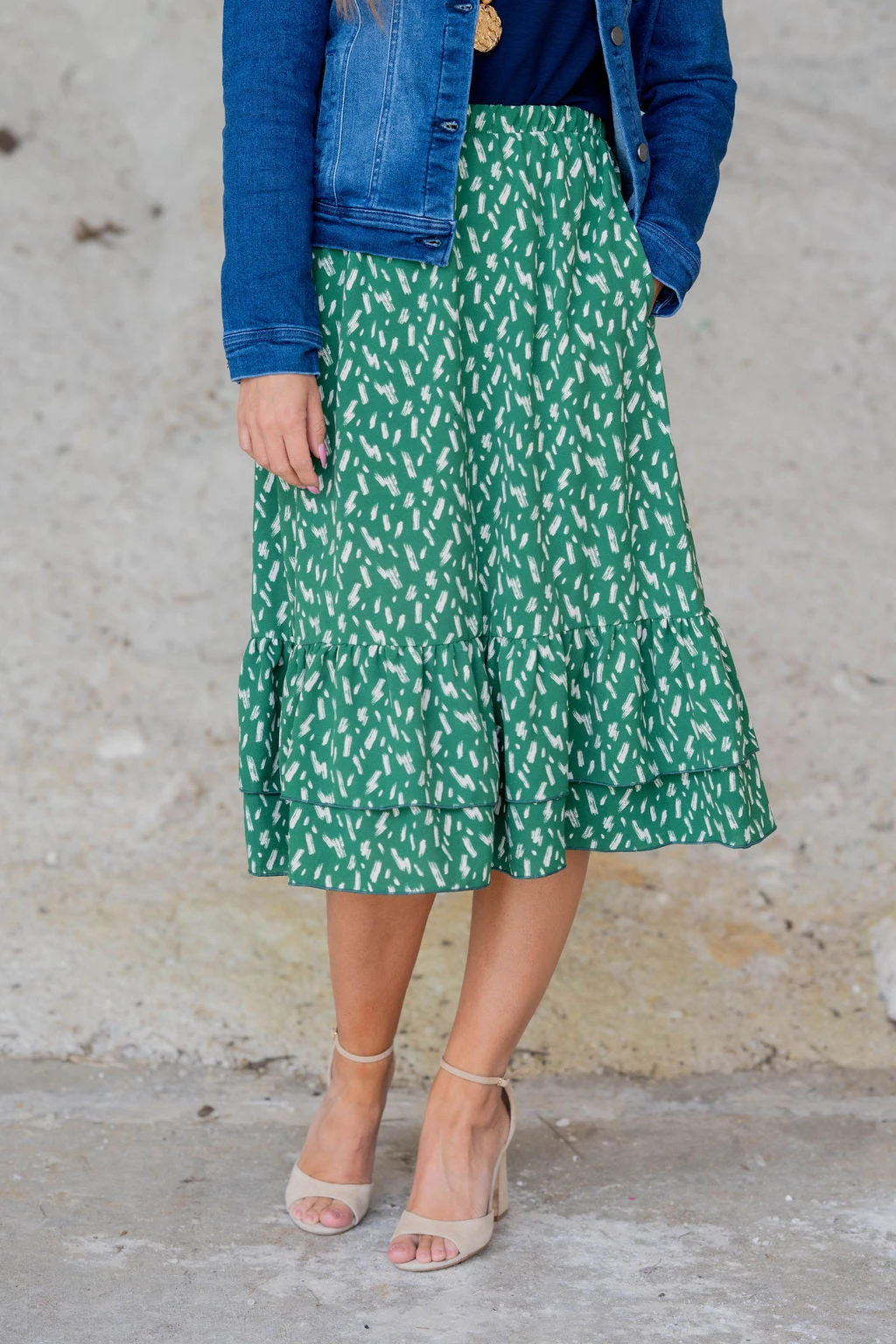 We cannot get over how stylish this skirt is! The fun print and ruffle bottom accents make this such a cute, elegant look! Wear this skirt to any event and you are sure to receive compliments! We love tucking a blouse into this for a more elevated look or a basic or graphic tee for a casual feel!