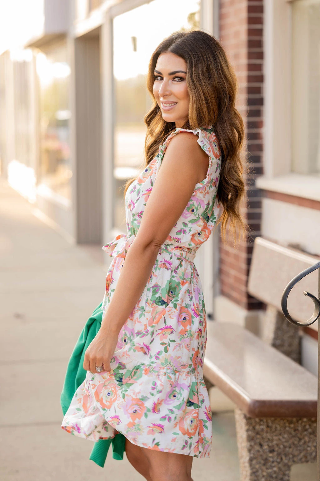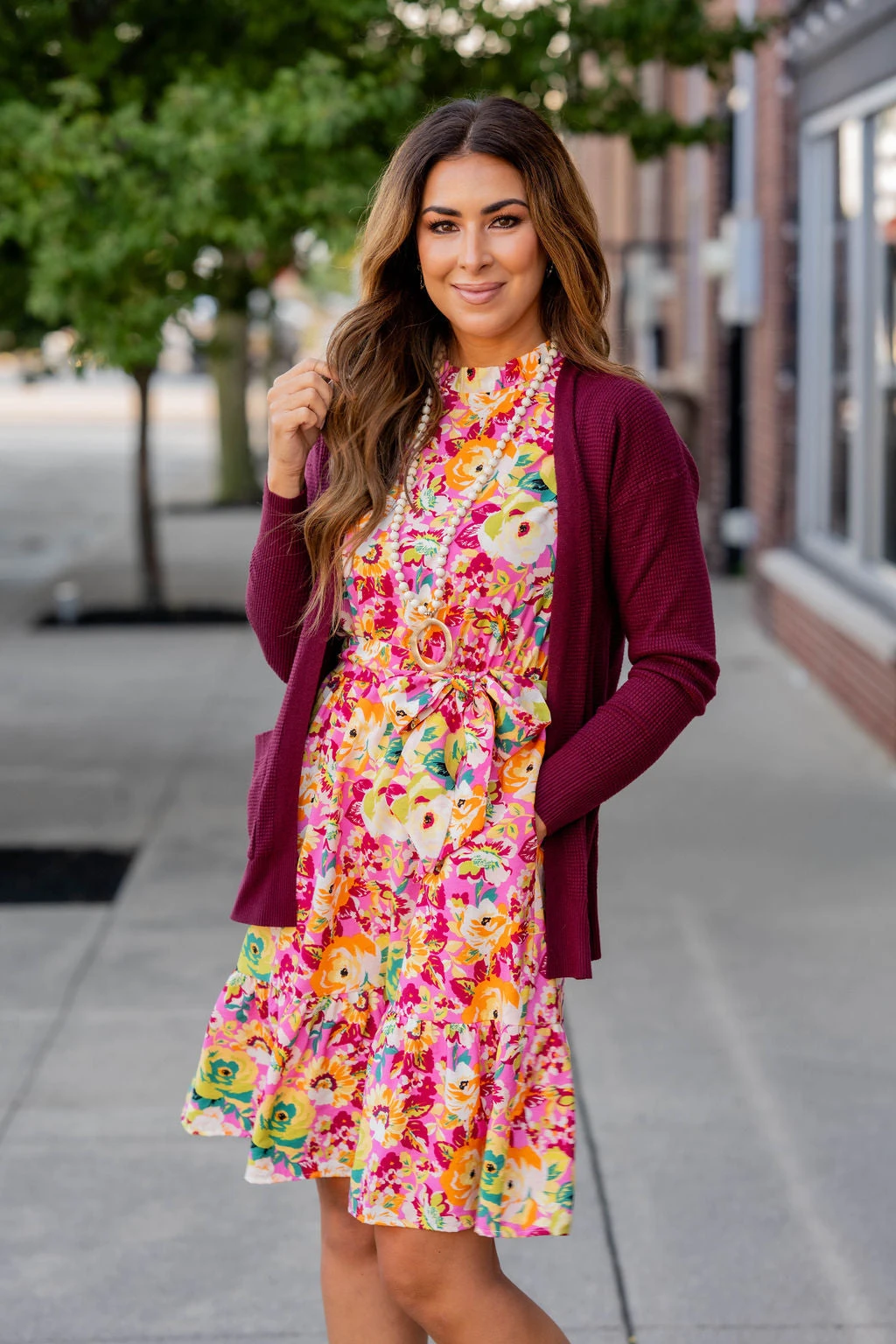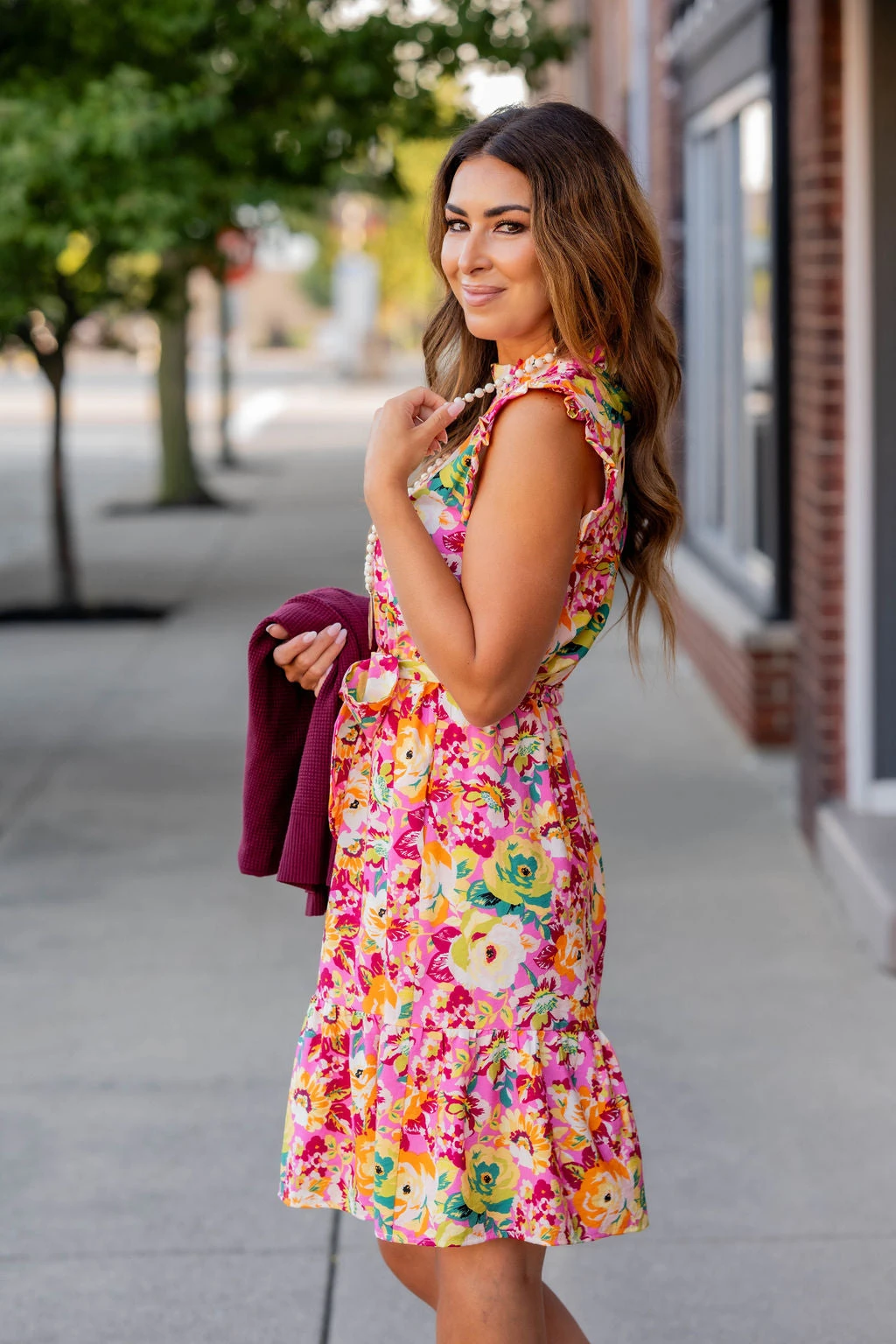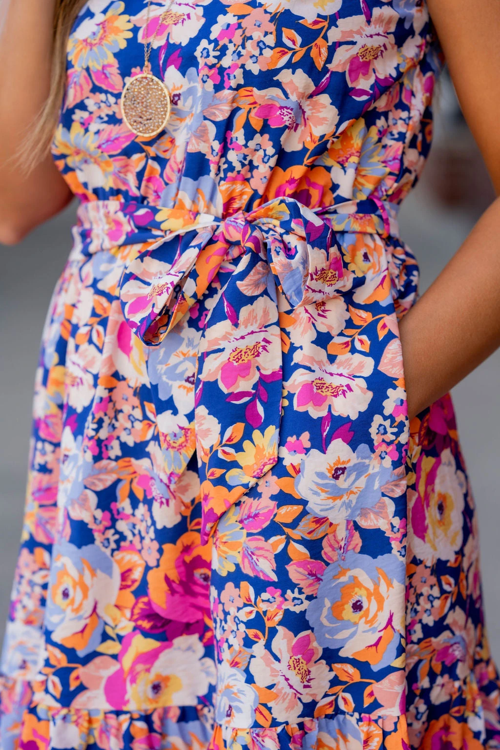 The vibrant and vivid colors really come to life in this dress! This features ruffle trim, and a slimming tie waist to bring it all together! Just add your favorite accessories and footwear for church, a wedding, date night, work, or anywhere! Pair with a blazer, cardigan, or jacket and boots to bring you into those cooler months. This one is sure to go fast!Â