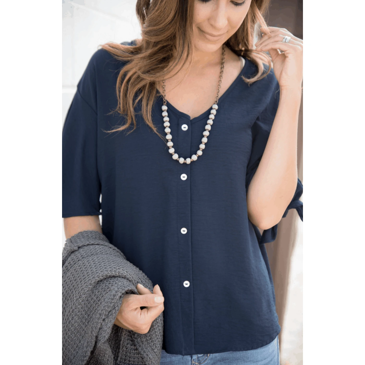 A lightweight blouse with some great details! We love the look of the button accents and tie sleeves!