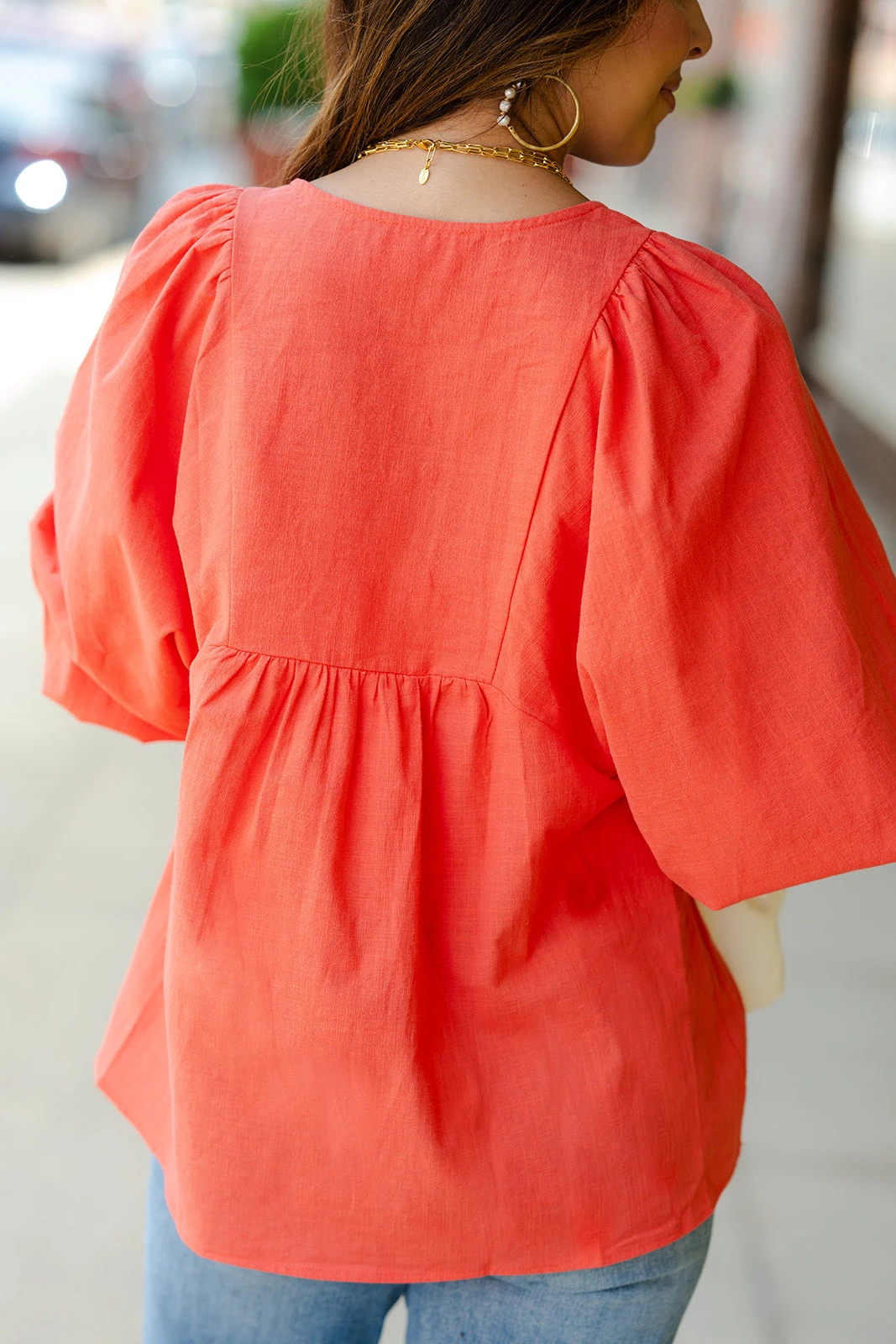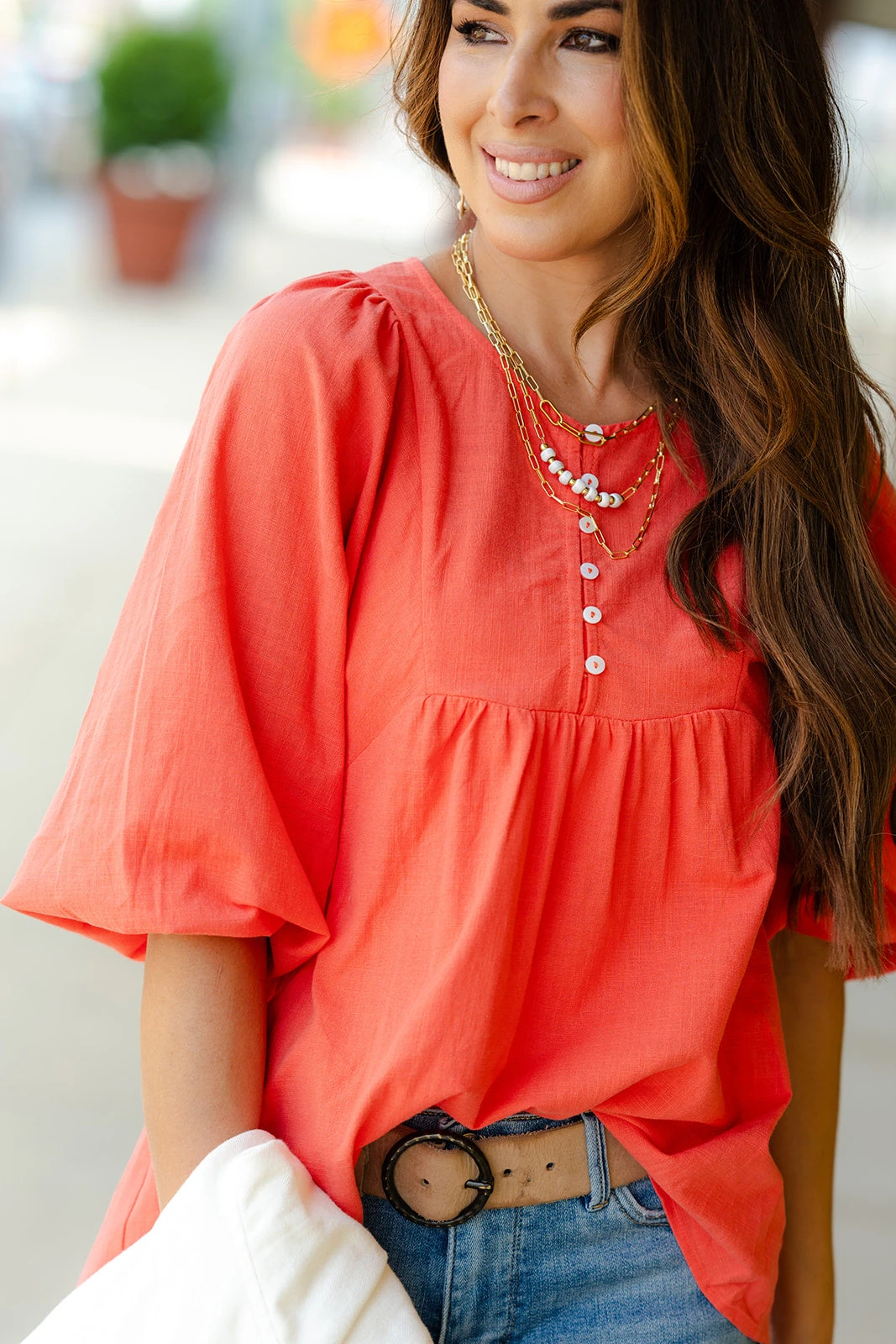 We’re loving the flowy peasant top fit with the puff sleeves and button detailing of this blouse! We suggest pairing with a bold-colored pair of our Betsey’s Jeggings or Betsey’s Exclusive Shorts or tucked into a high-waisted skirt or shorts and don’t forget your favorite accessories for a complete Betsey’s look! The lightweight material allows you to wear this all year round and this can easily be layered with a cardigan, blazer, or jacket!
