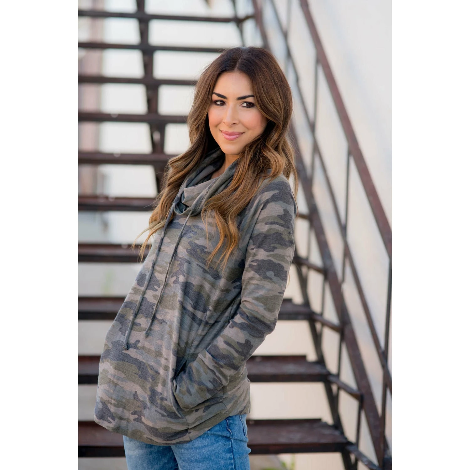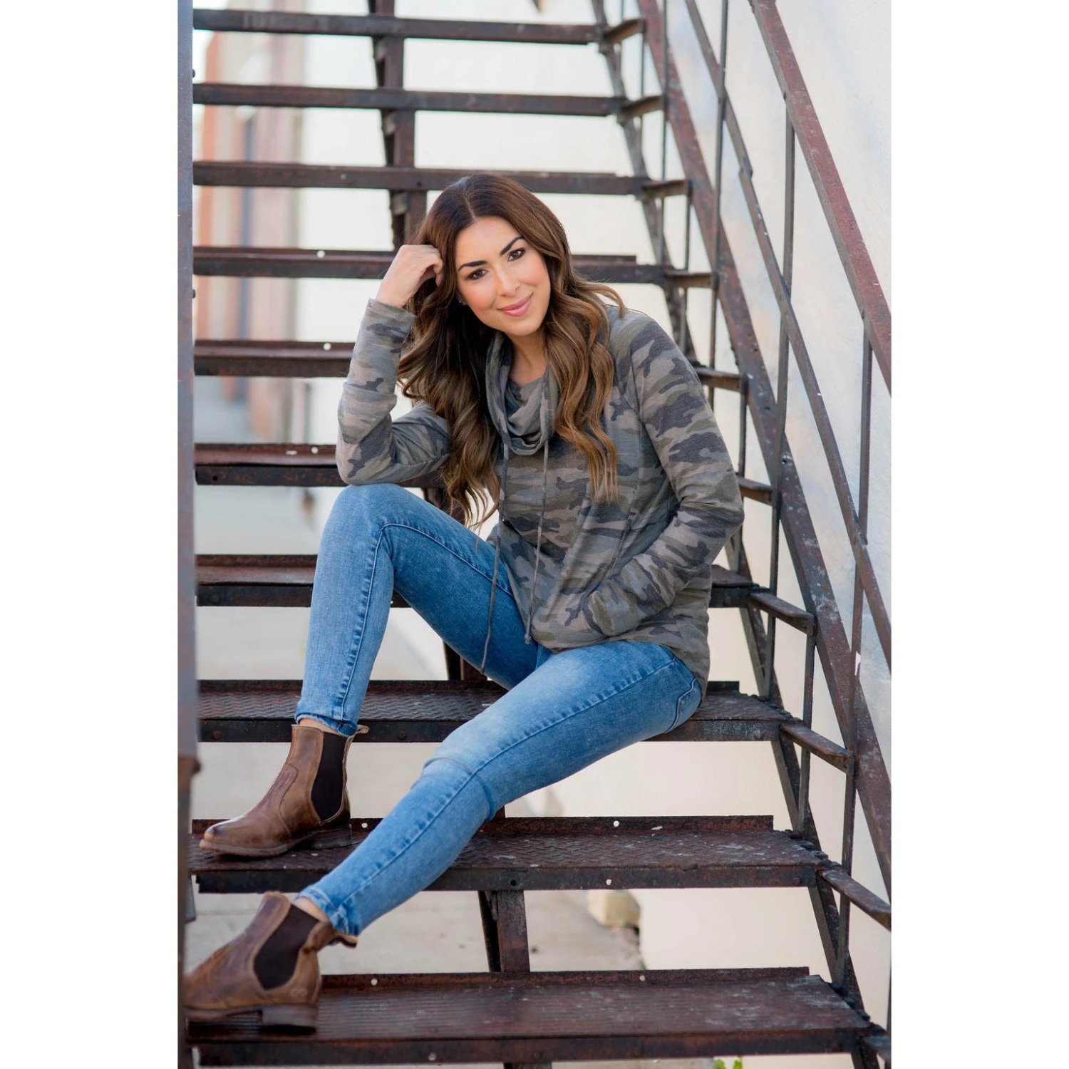 Camo is super cute and this cowl neck is a must have! Wear it with jeans and boots! It is a comfortable piece you will be able to wear again and again!