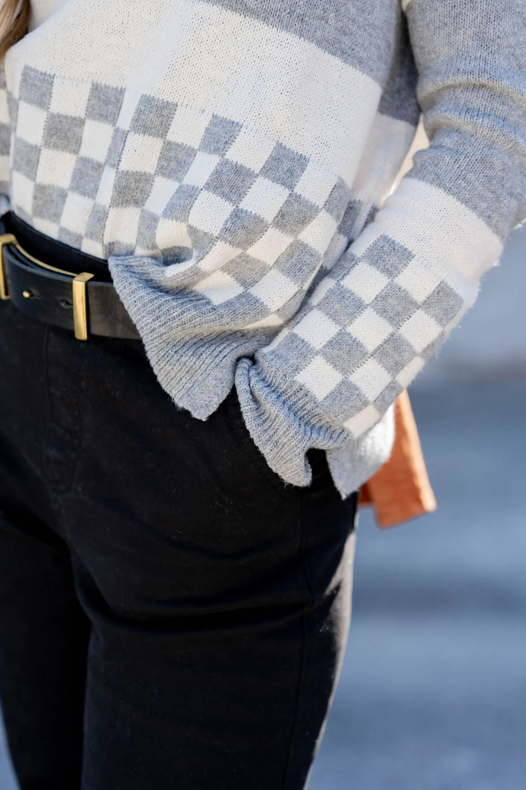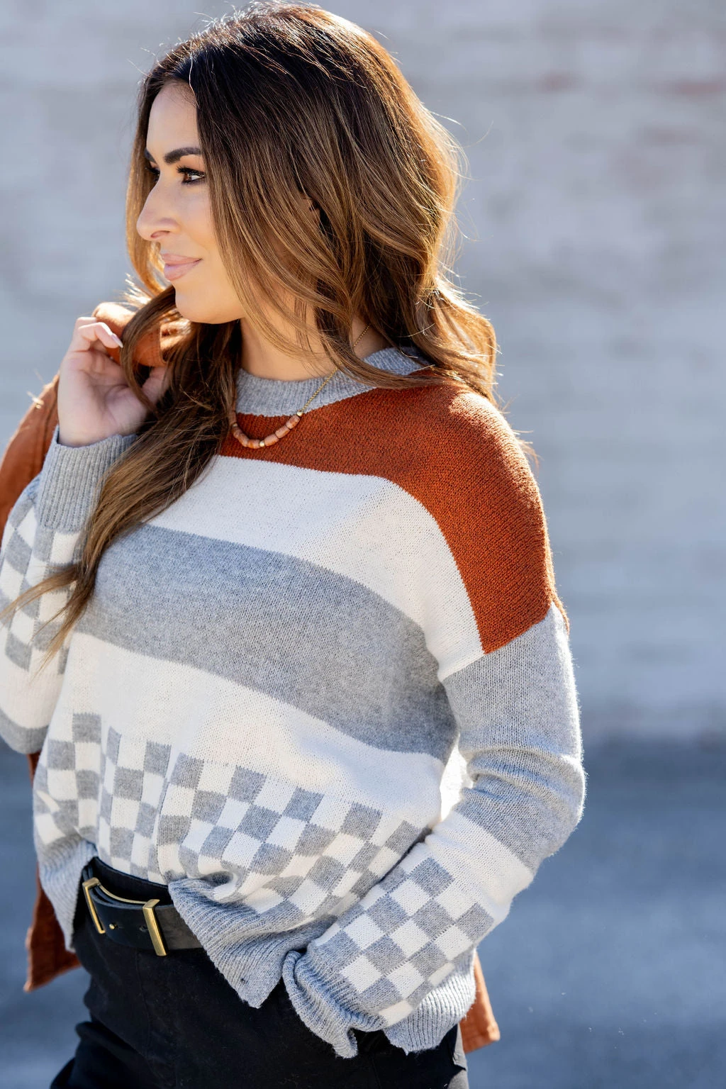 Sweater weather is upon us and we’re in love with this one! The fun stripes and the checkered printed bottom are so simple yet so chic! Pair this sweater with jeans, accessorize and add your favorite pair of shoes for a quick, stylish look! Chilly? Add a vest or jacket with ease!!