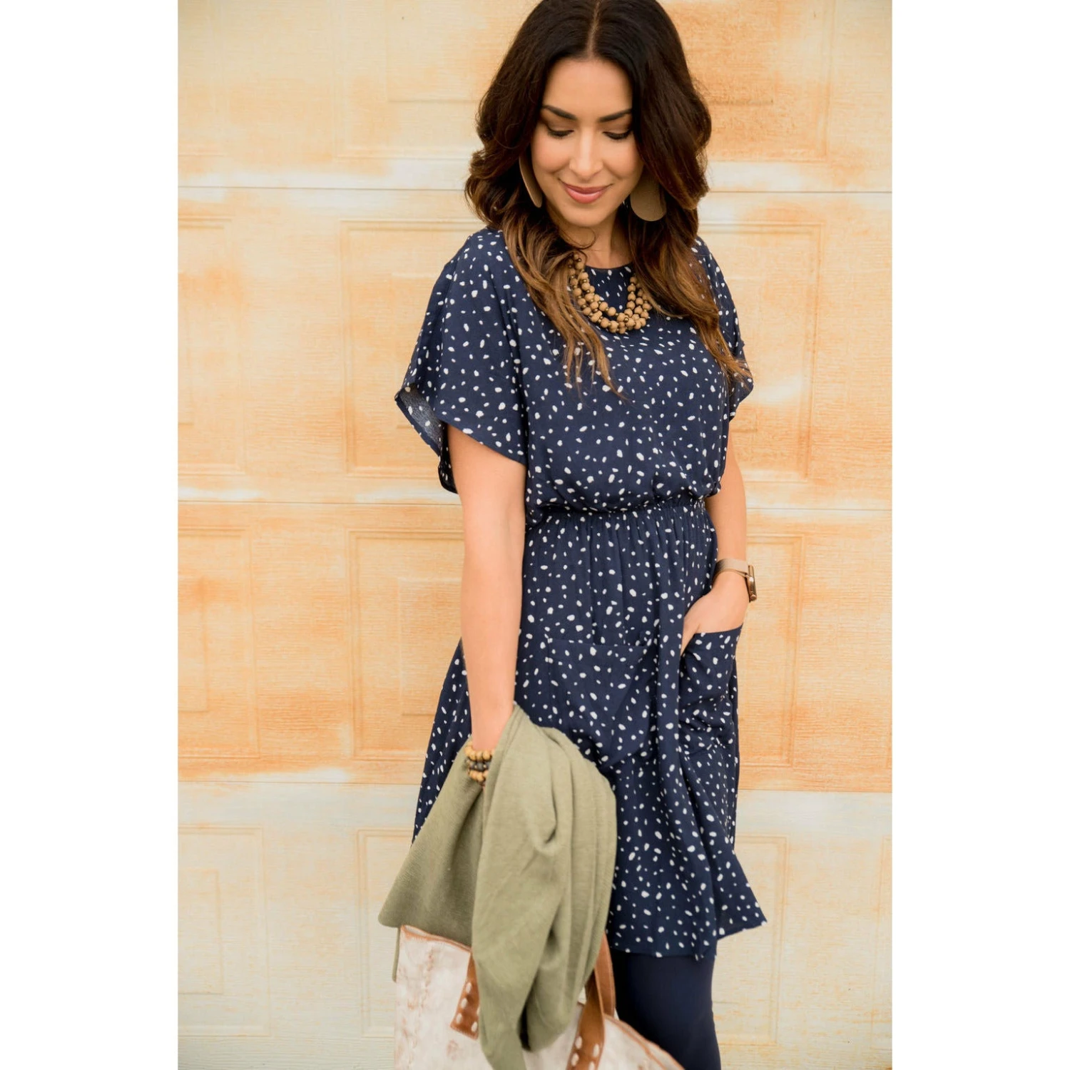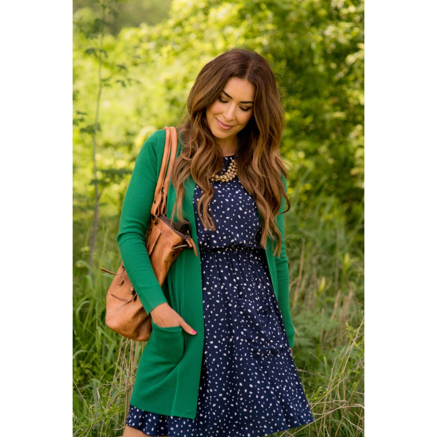You’ll love this dress so much you’ll want it in every color! From top to bottom this dress is lovely. The cinched waist and flowy sleeves make it super flattering. The pockets are a cute added touch too! This dress is perfect to transition you into fall and can easily be layered with one of our striped or solid cardigans!