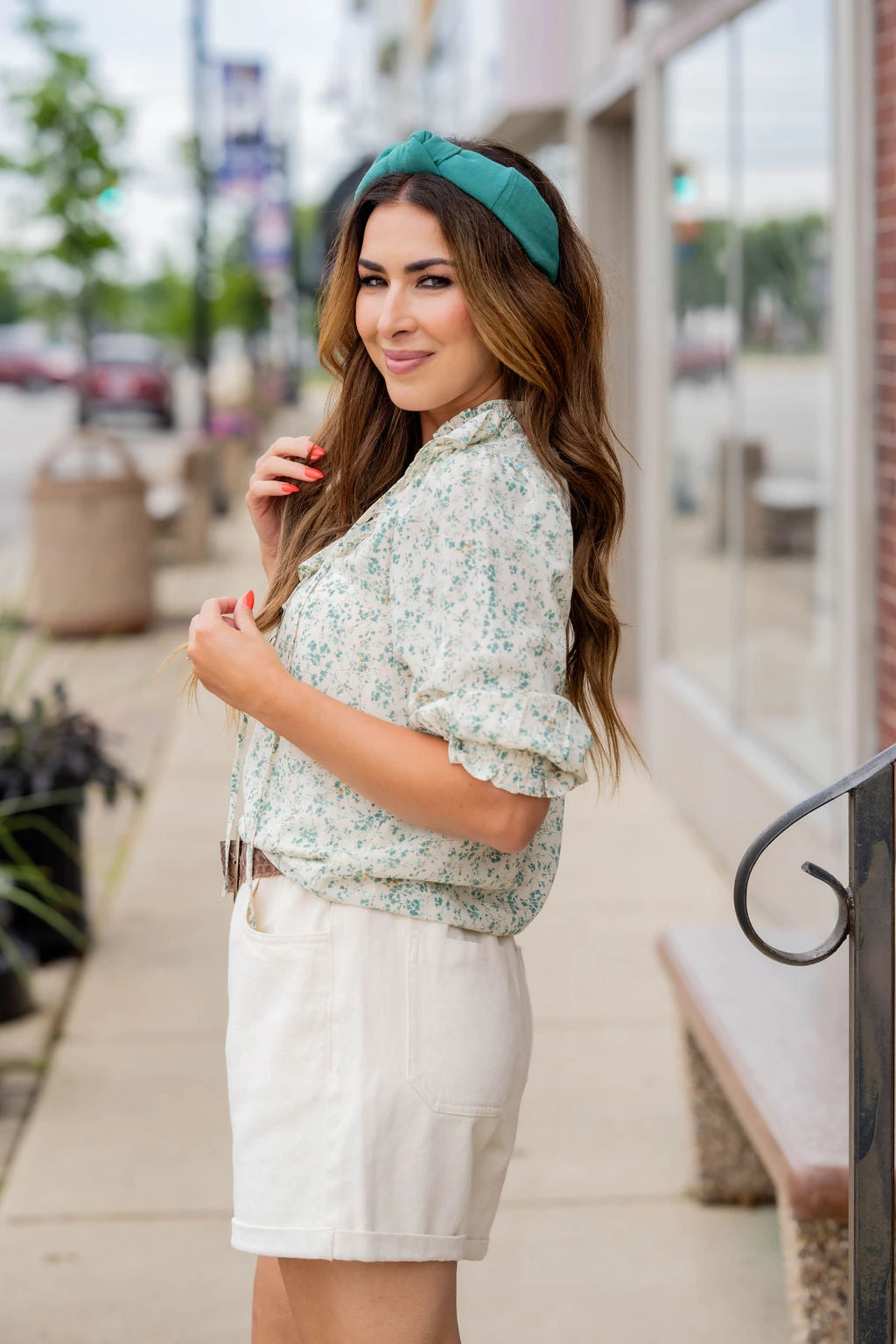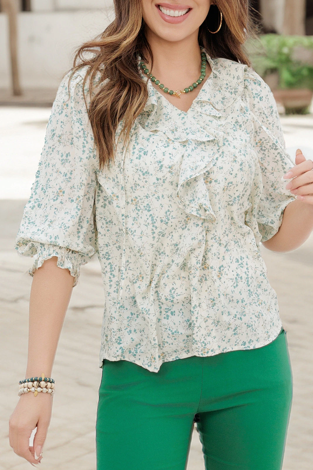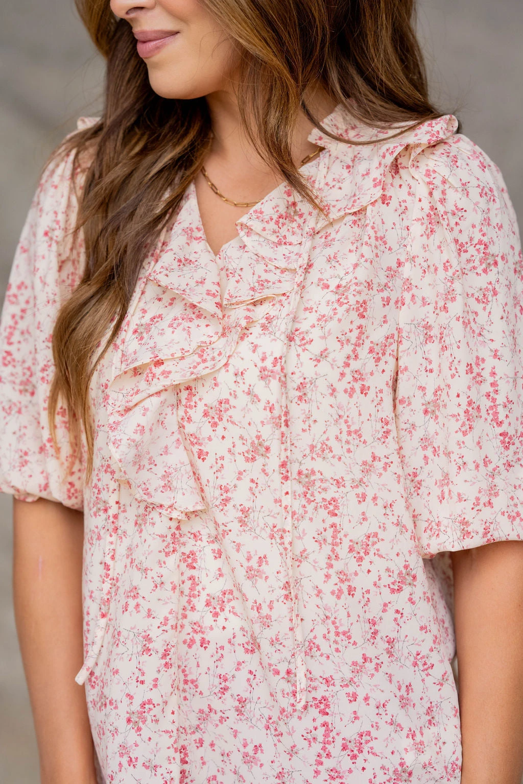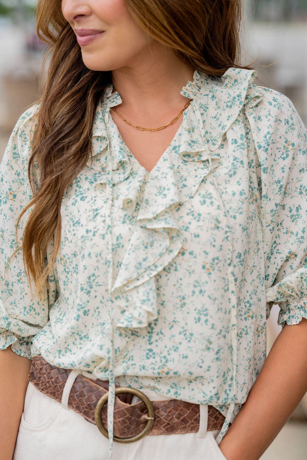 The ruffle front accent and floral print on this blouse sets it apart from the rest! The lightweight and breathable material makes this ideal for any season, and the flowy style makes this perfect for any body shape or size! Pair with your favorite denim, a bold colored pair of our Betsey’s Jeggings, or even just some leggings for a unique look!