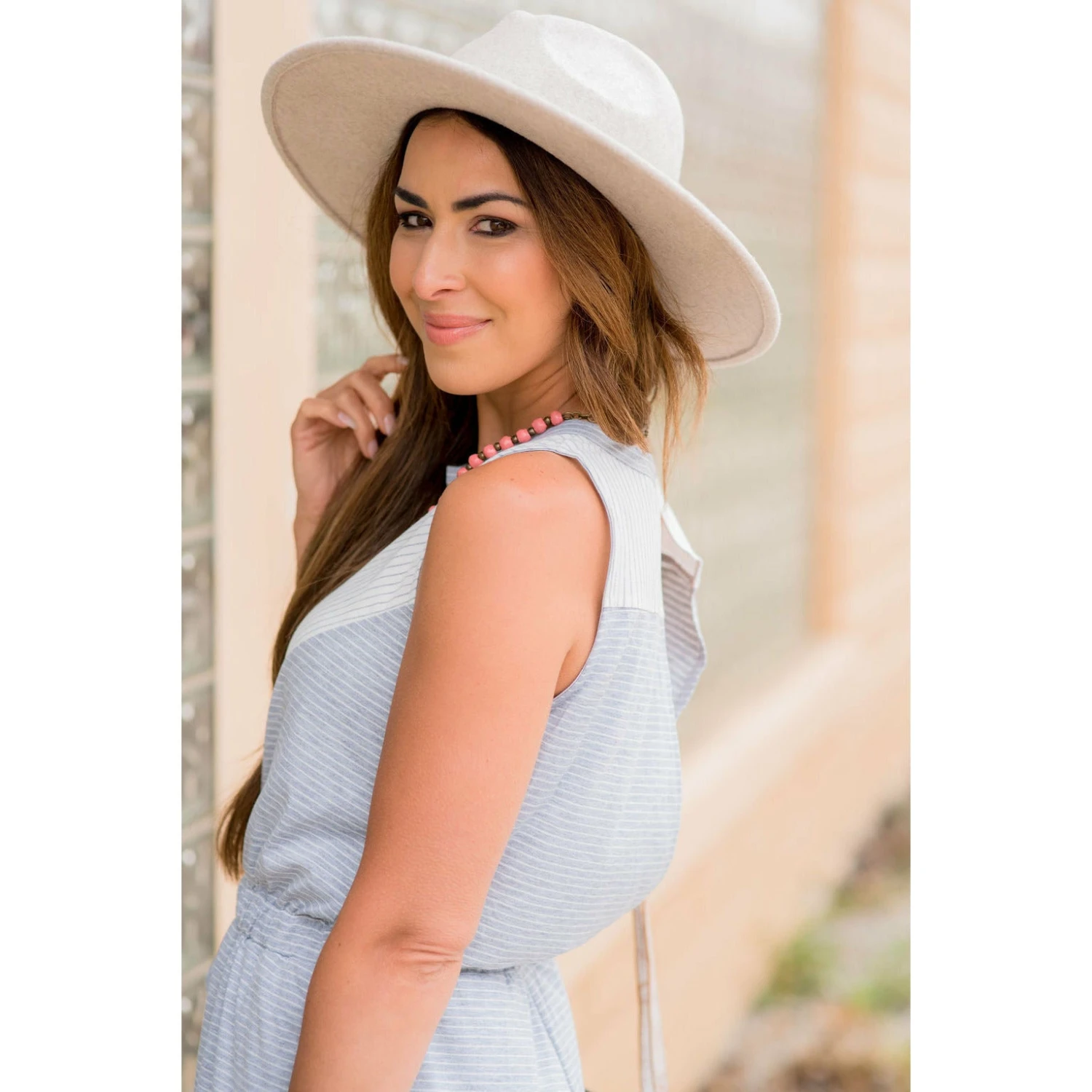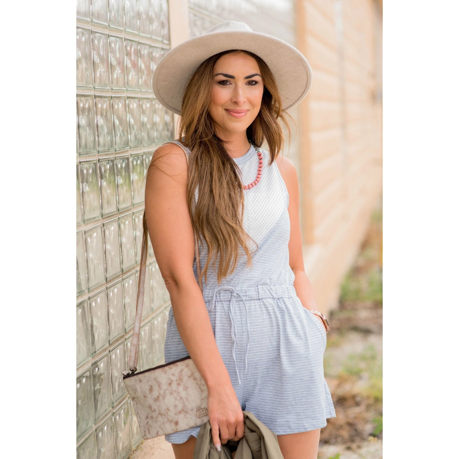 This cute romper is such a fun addition to any wardrobe. Made of a soft material, it has a chevron print top with thin stripes on the bottom, pockets, and a cinched waist that gives a very slimming and flattering look. This can easily be worn on date night with a denim jacket and statement necklace, on the go running errands on a hot day, or on that much-needed beach vacation!! However and wherever you chose to wear this romper, we know you’ll make it your own and love it!