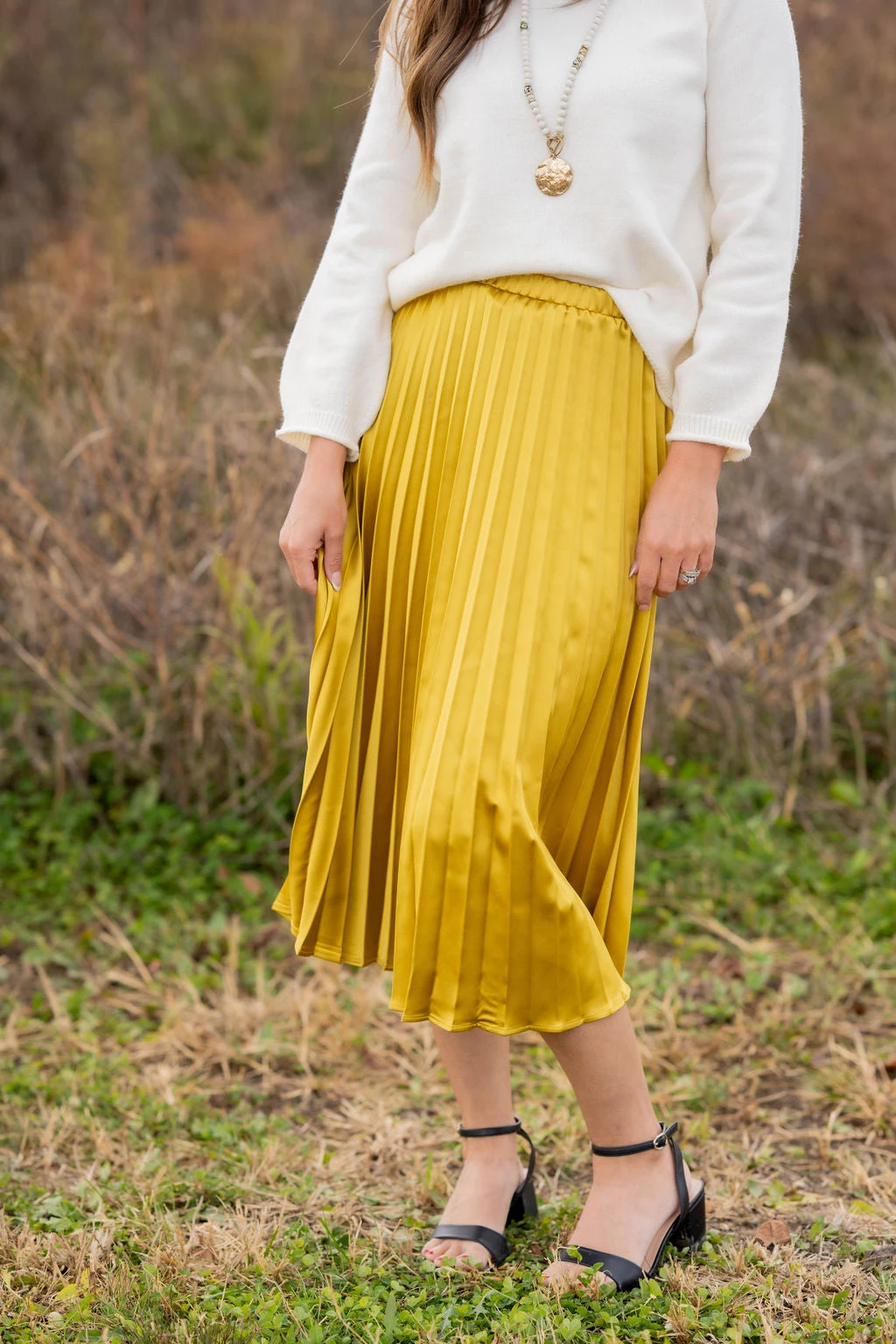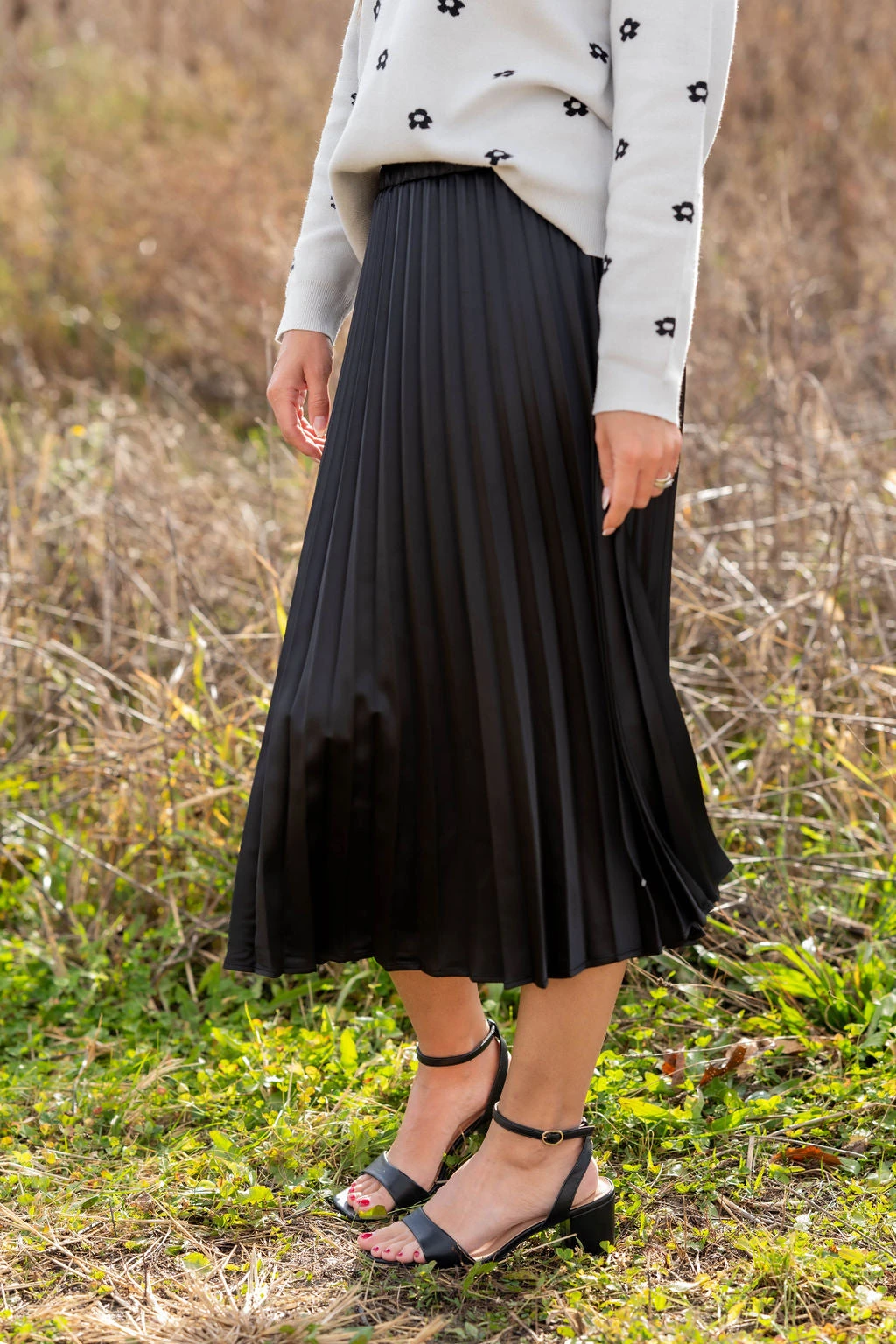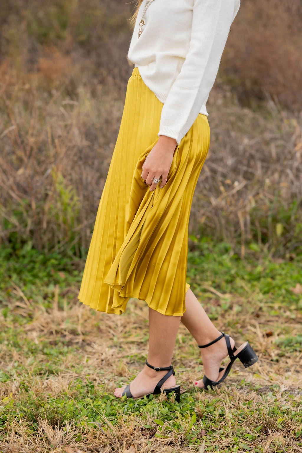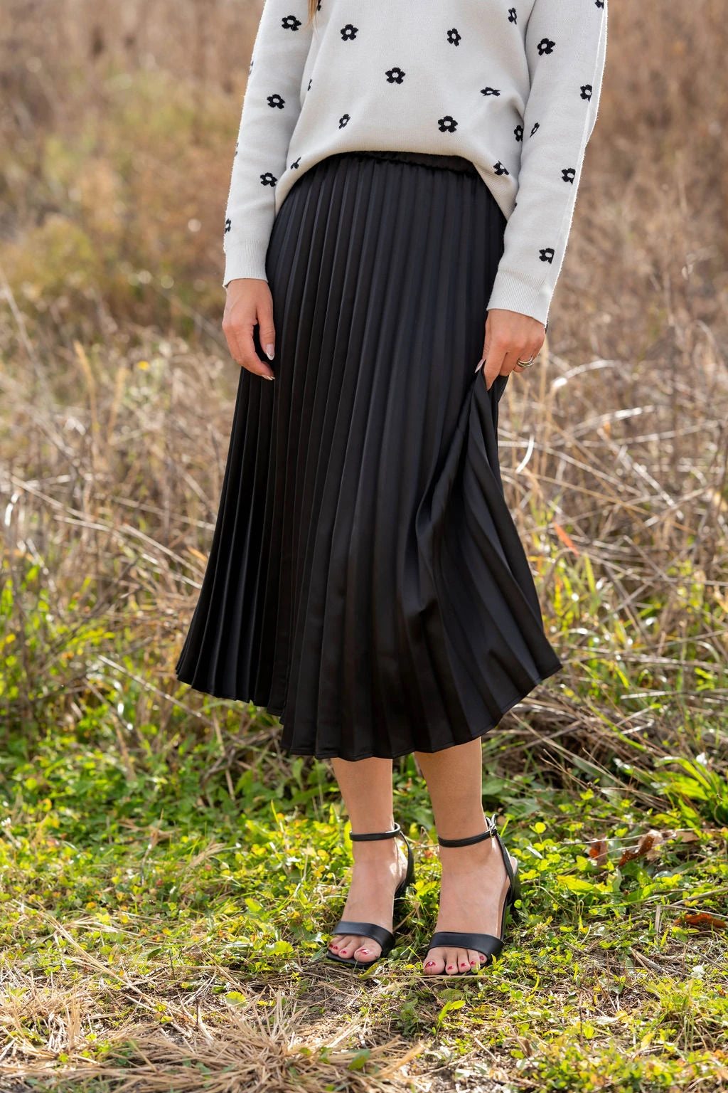 Right in time for the upcoming holidays, but looks great all year round! This midi skirt has such an elegant look with the pleated look and the flowy fit. We love this with a blouse or a sweater but this also could be dressed down with a graphic tee! The possibilities with this one are truly endless!