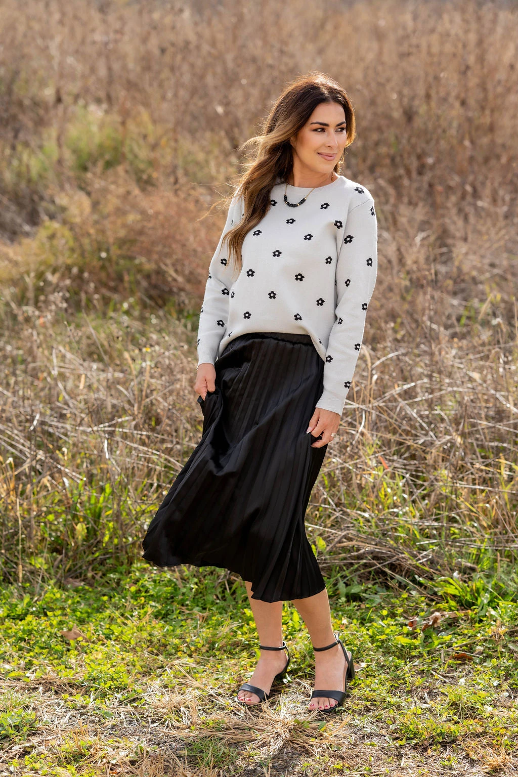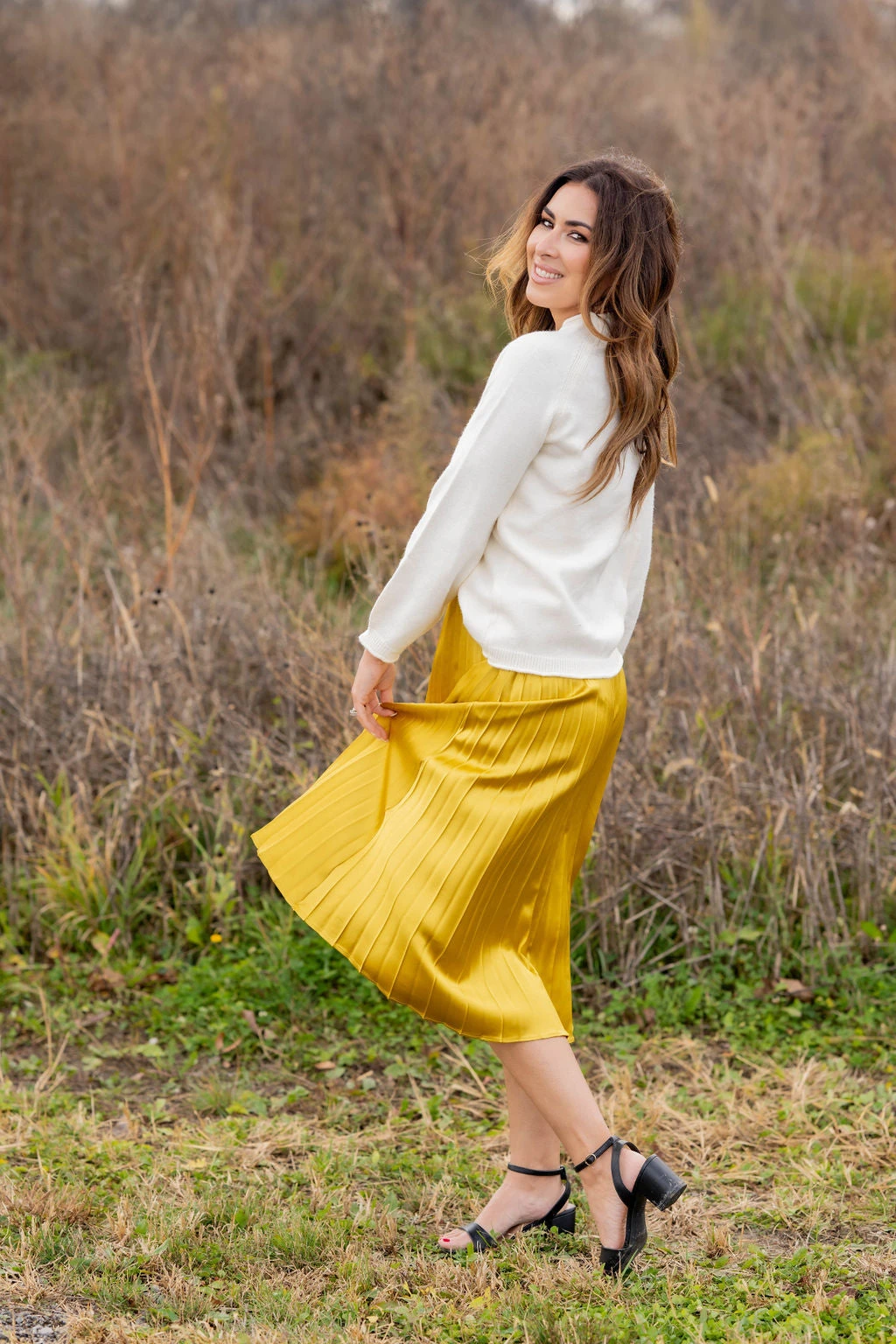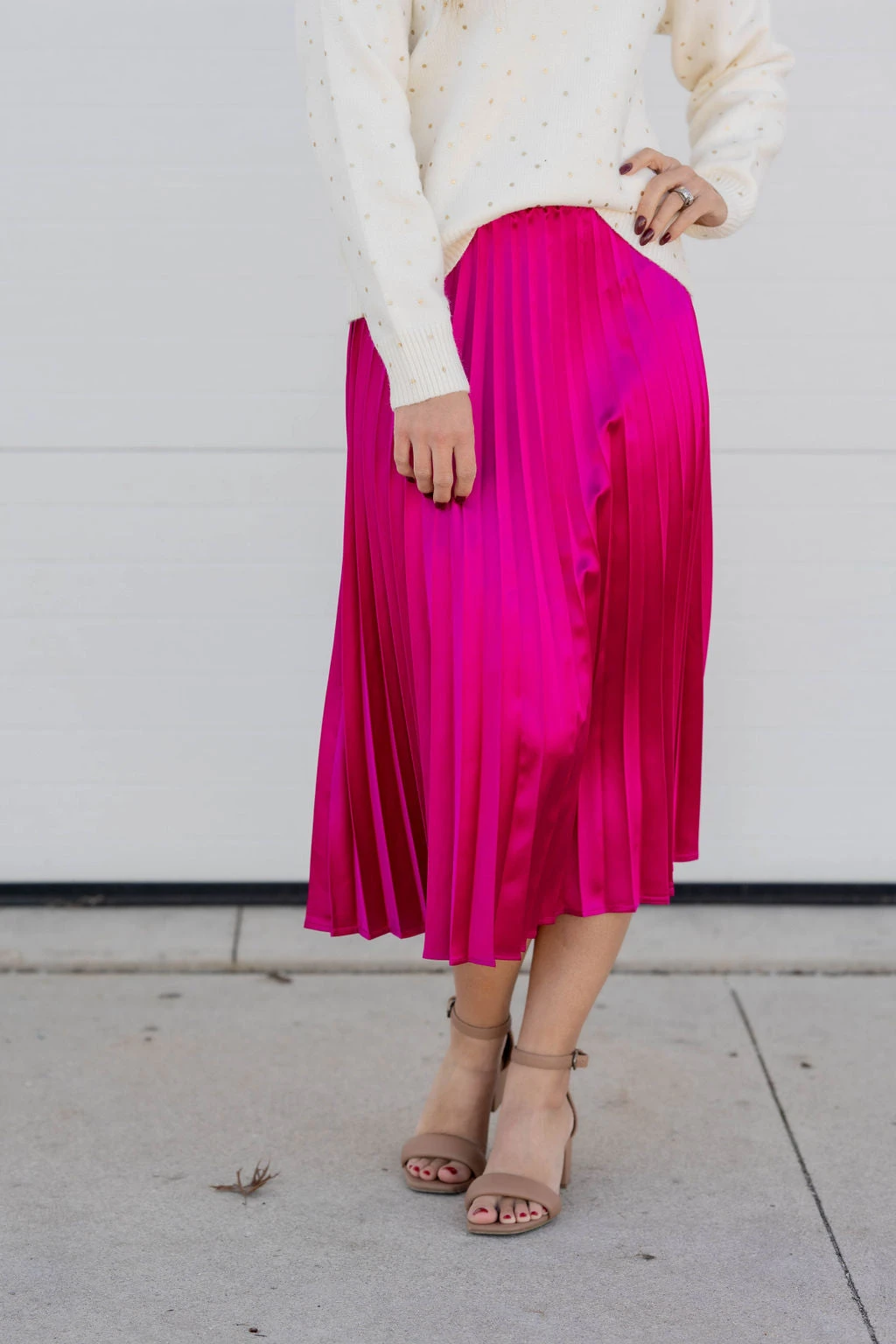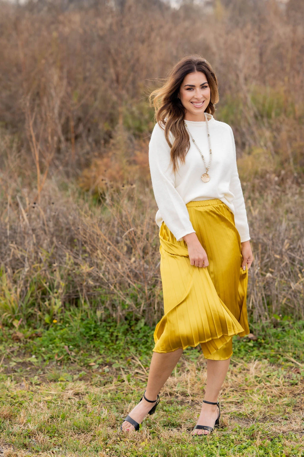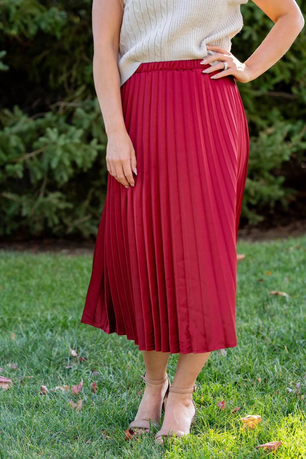 Right in time for the upcoming holidays, but looks great all year round! This midi skirt has such an elegant look with the pleated look and the flowy fit. We love this with a blouse or a sweater but this also could be dressed down with a graphic tee! The possibilities with this one are truly endless!