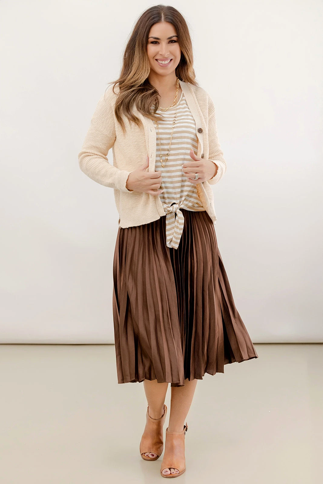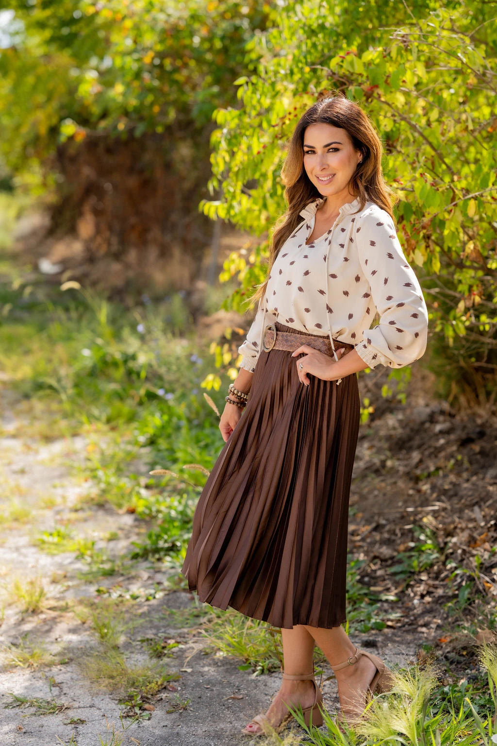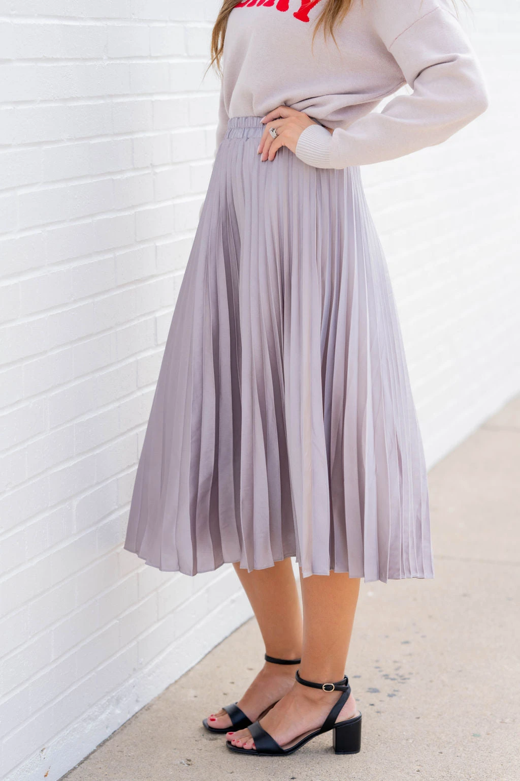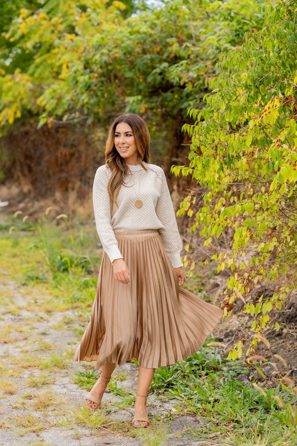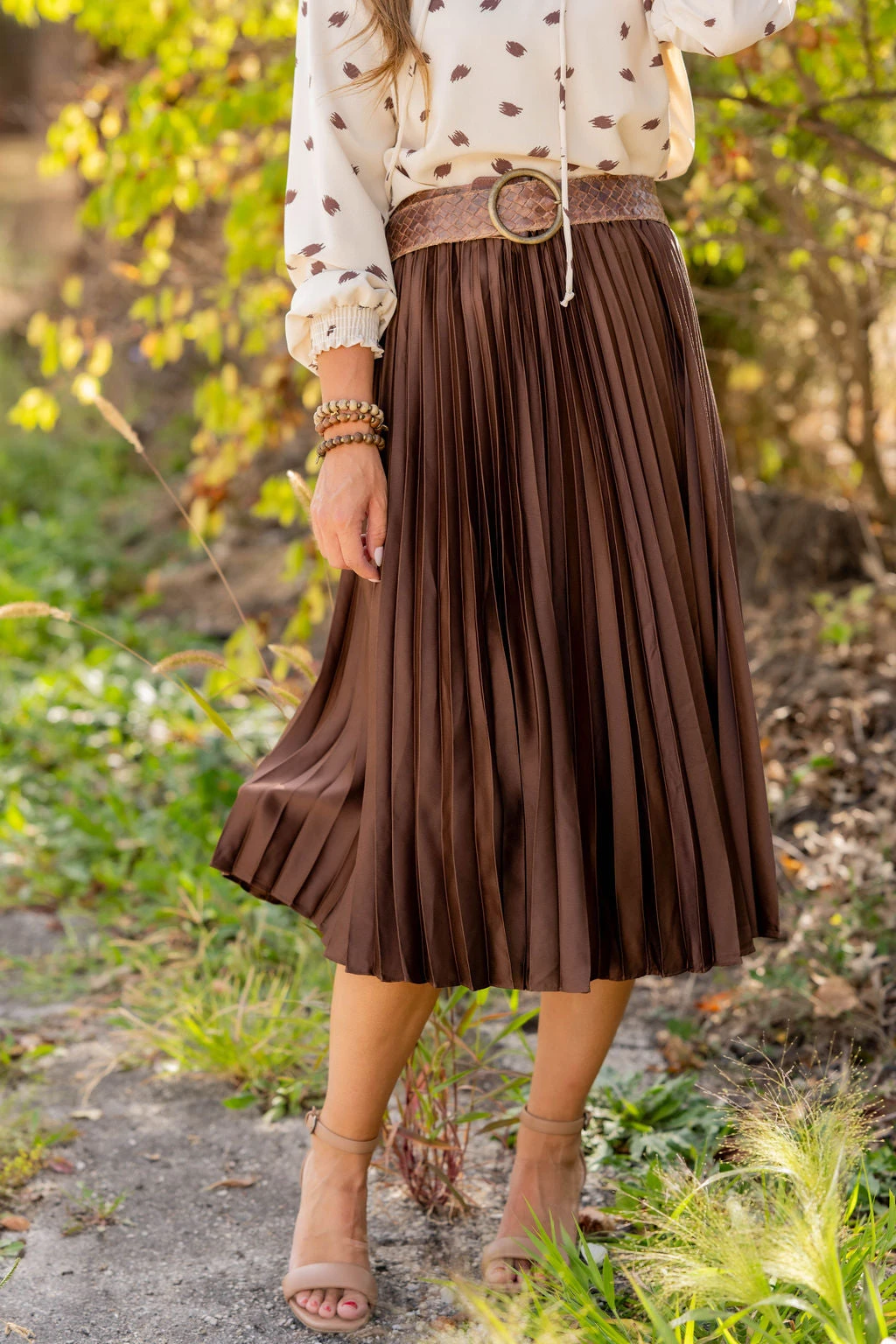 We cannot get over how stylish this skirt is! The cinched waist and accordion accents makes this such a cute, elegant look! Wear this skirt to any event and you are sure to receive compliments! We love tucking a blouse into this for a more elevated look or a basic or graphic tee for a casual feel!