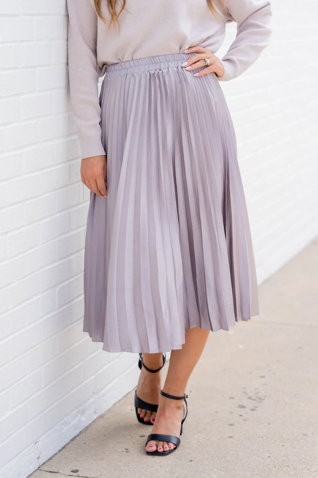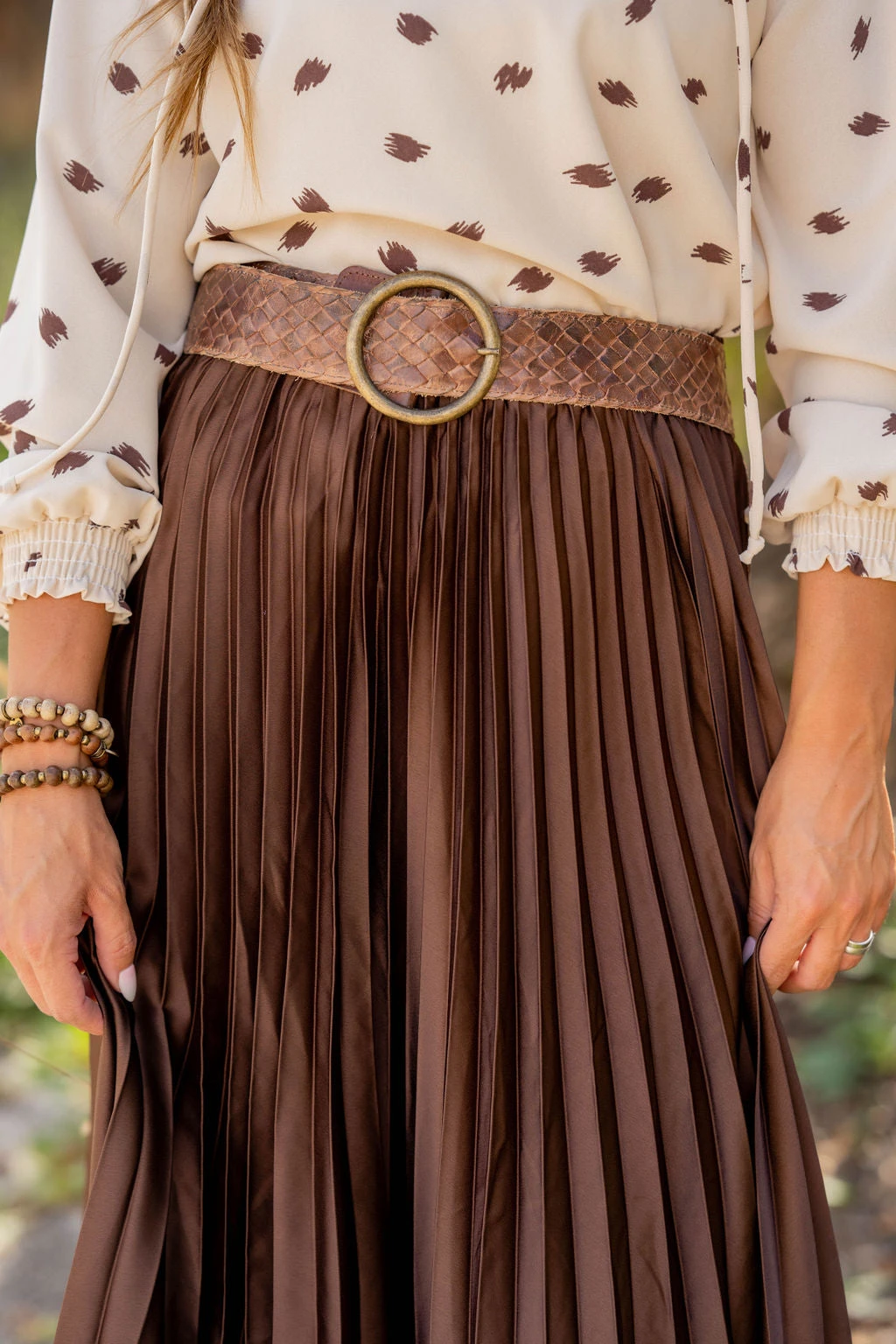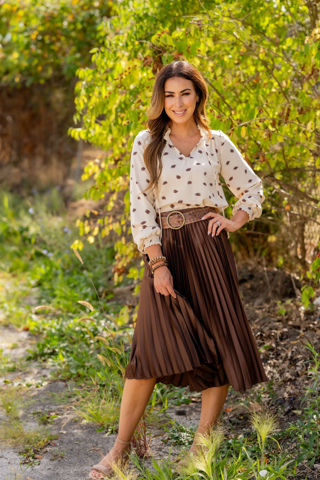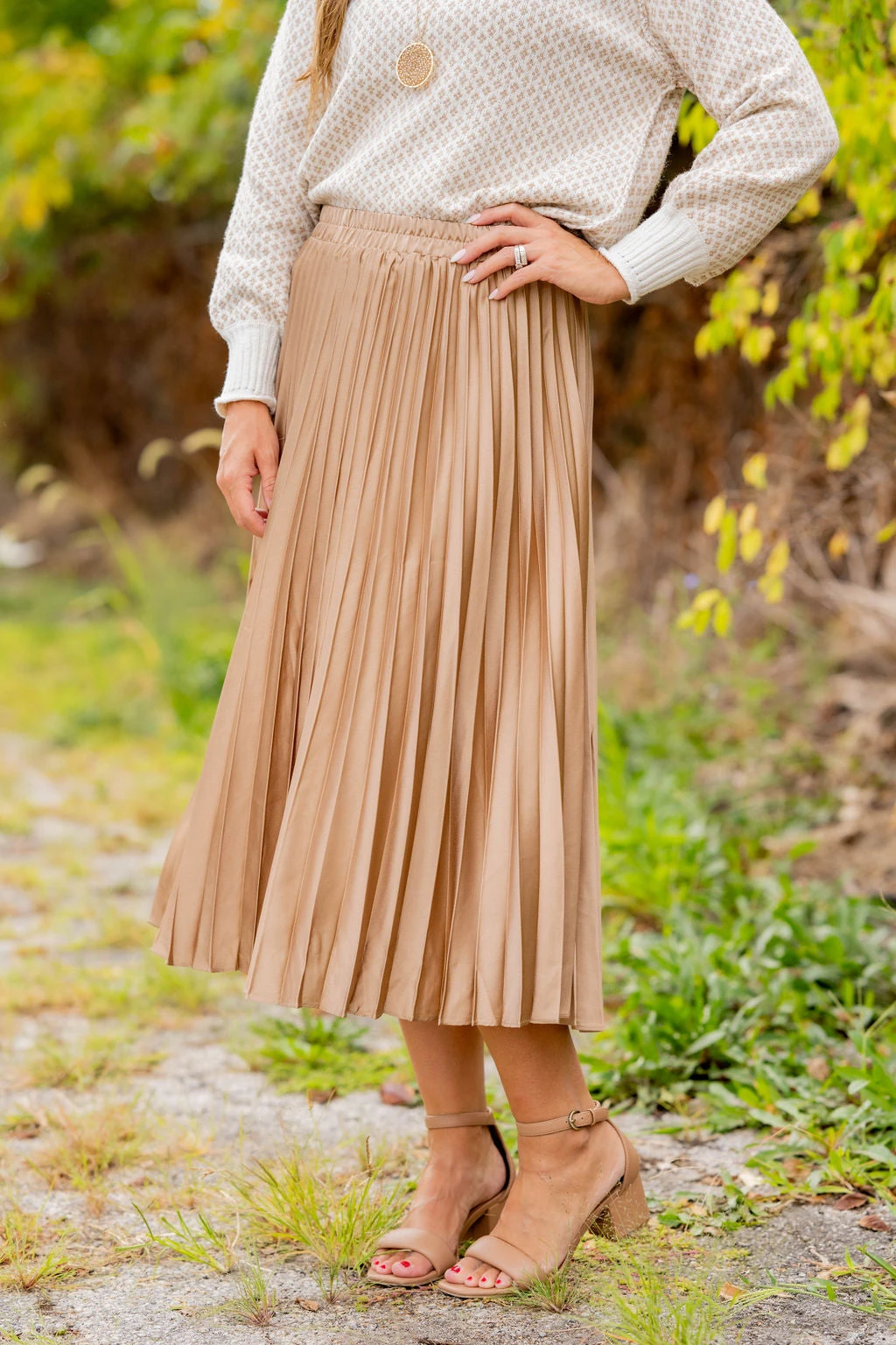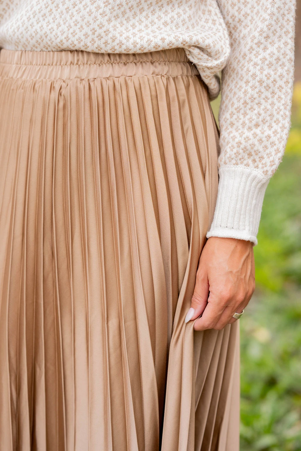We cannot get over how stylish this skirt is! The cinched waist and accordion accents makes this such a cute, elegant look! Wear this skirt to any event and you are sure to receive compliments! We love tucking a blouse into this for a more elevated look or a basic or graphic tee for a casual feel!