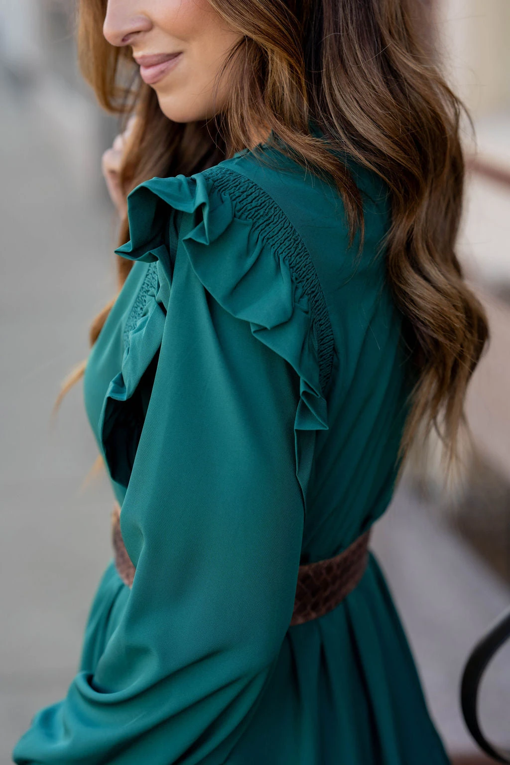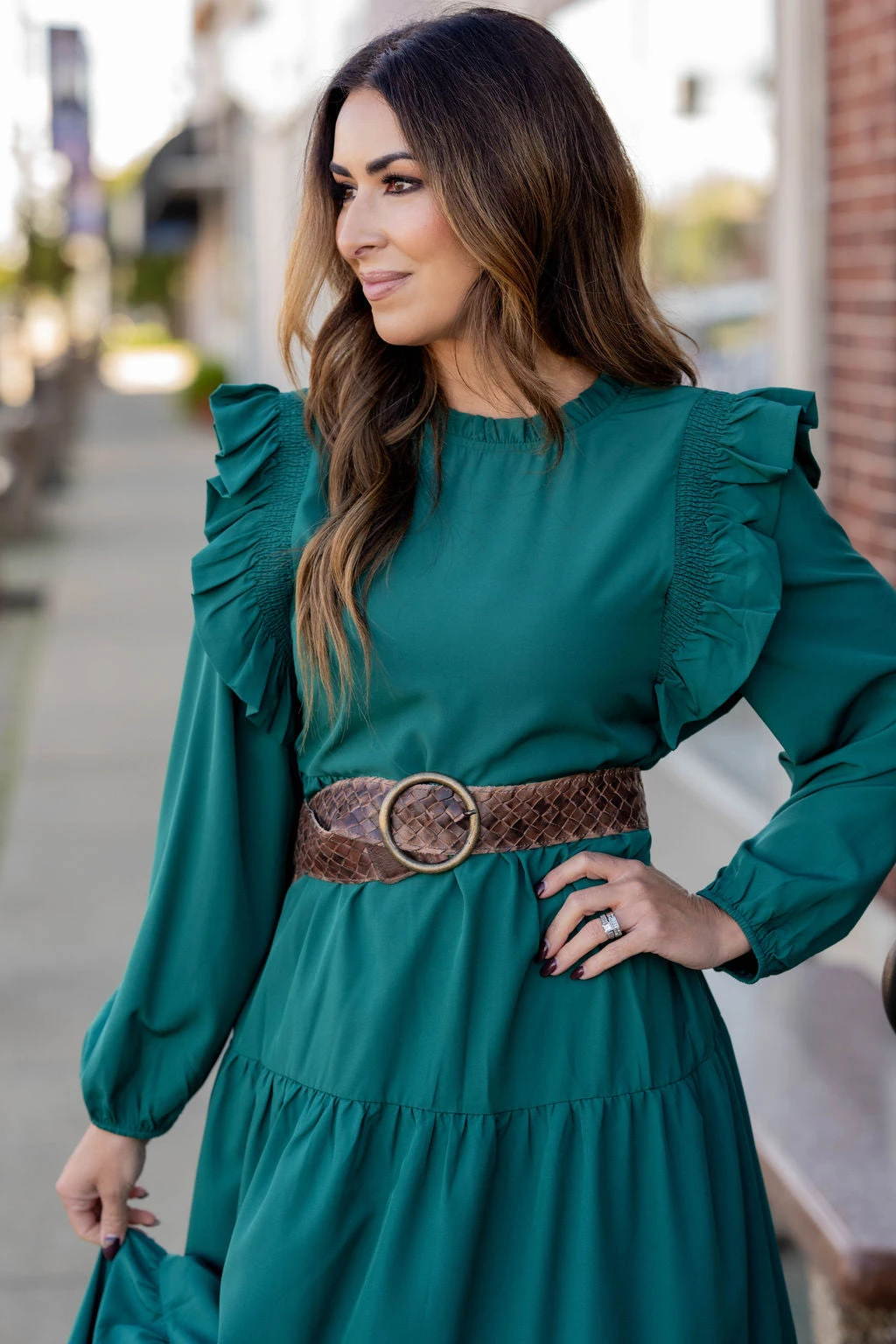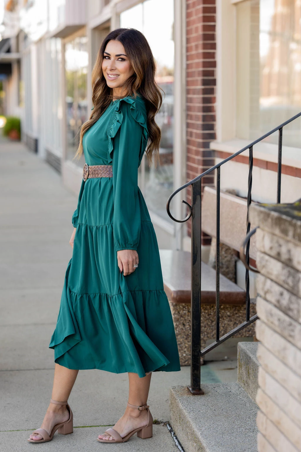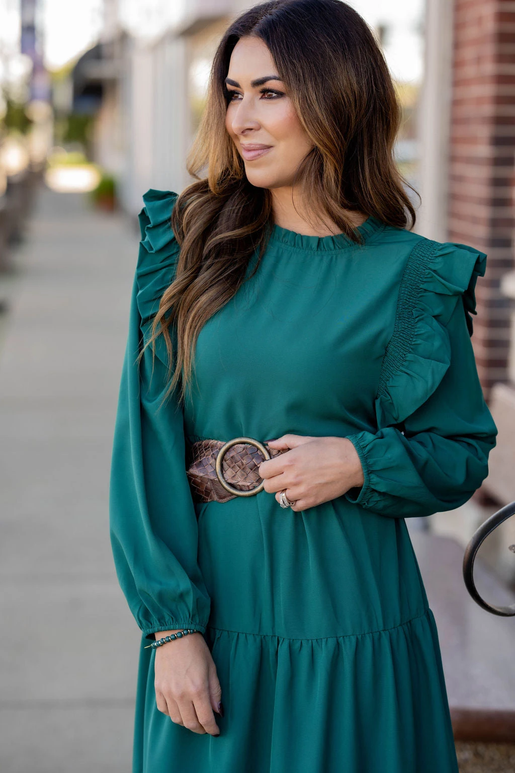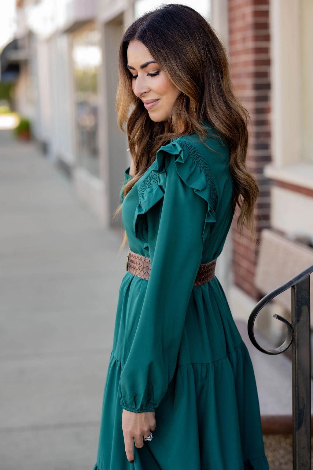 This is such a classy dress and perfect for every event or occasion! The tiered style makes this ideal for any body shape or size, and the midi length makes this perfect for church, a wedding, the holidays, or anything! The flutter accents give this that little extra spice to really set it apart from the rest! Just add your favorite accessories