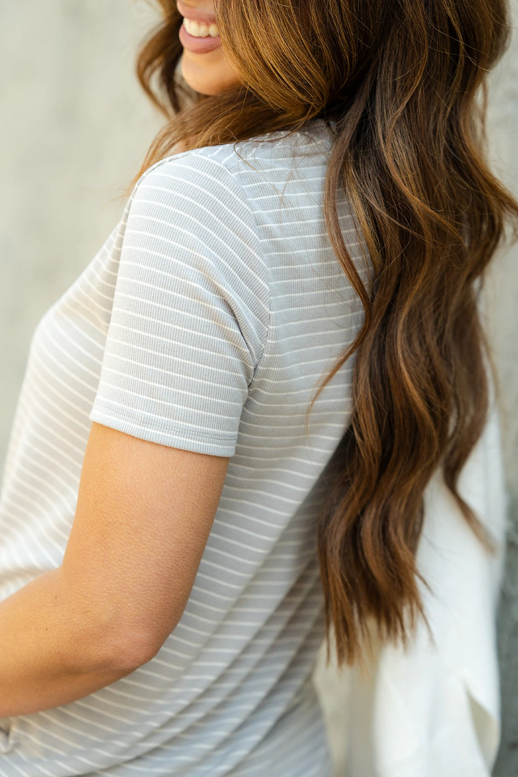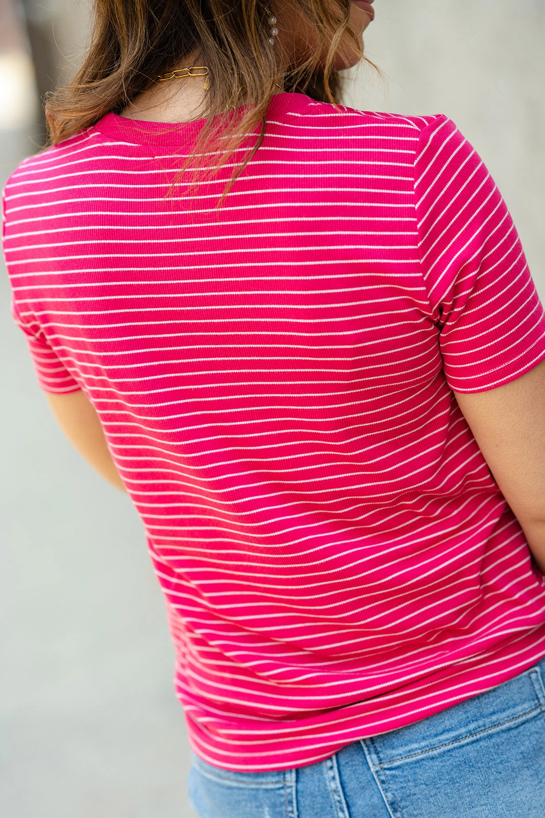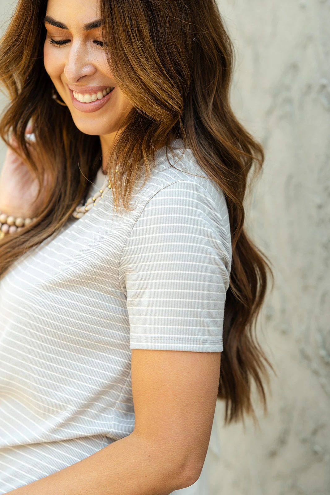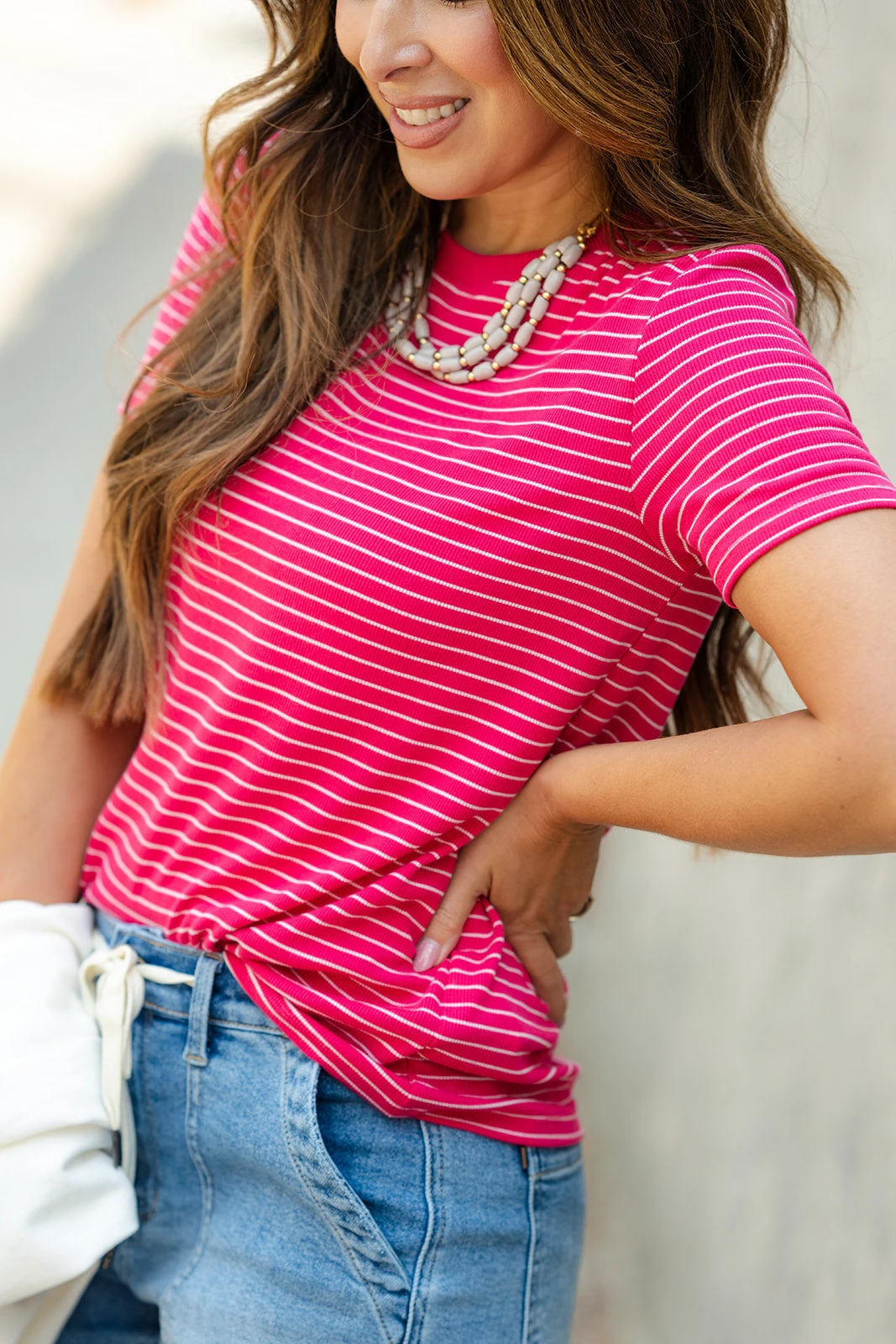 Stripes are so classic and always in style! Whether you pair this with a bold-colored Betsey’s Exclusive Short or Betsey’s Jeggings, or just with your favorite denim or leggings, we know you will constantly reach for this tee! The ribbed material gives this a little extra bit of pizzaz!