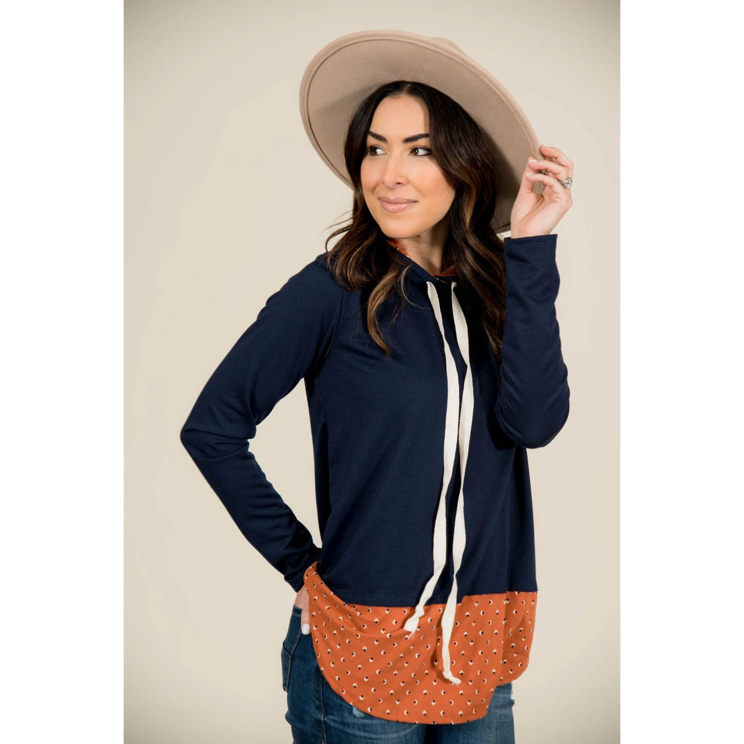 One of our favorite clay printed patterns is now in hoodie form! This super soft lightweight hoodie has a pop of the clay print at the bottom, and also lining the hood. This is a great on the go option!
