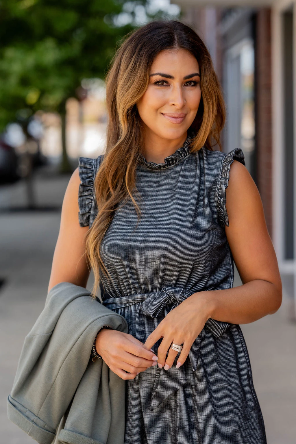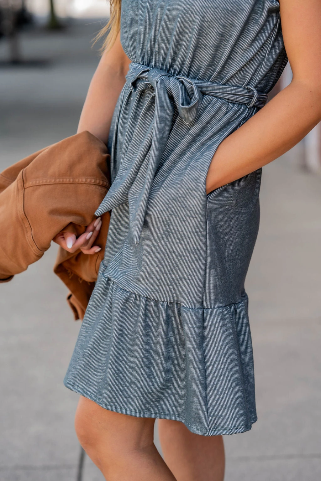 Looking for a dressy or casual outfit? Or both? This corded ruffle trim dress is the one for you. Cinched at the waist with an added tie, this outfit can be dressed up or down, depending on the mood you are in! Good for every season – add a cardigan and boots for Winter or Fall, sandals for Summer or Spring. This is a dress for all year!