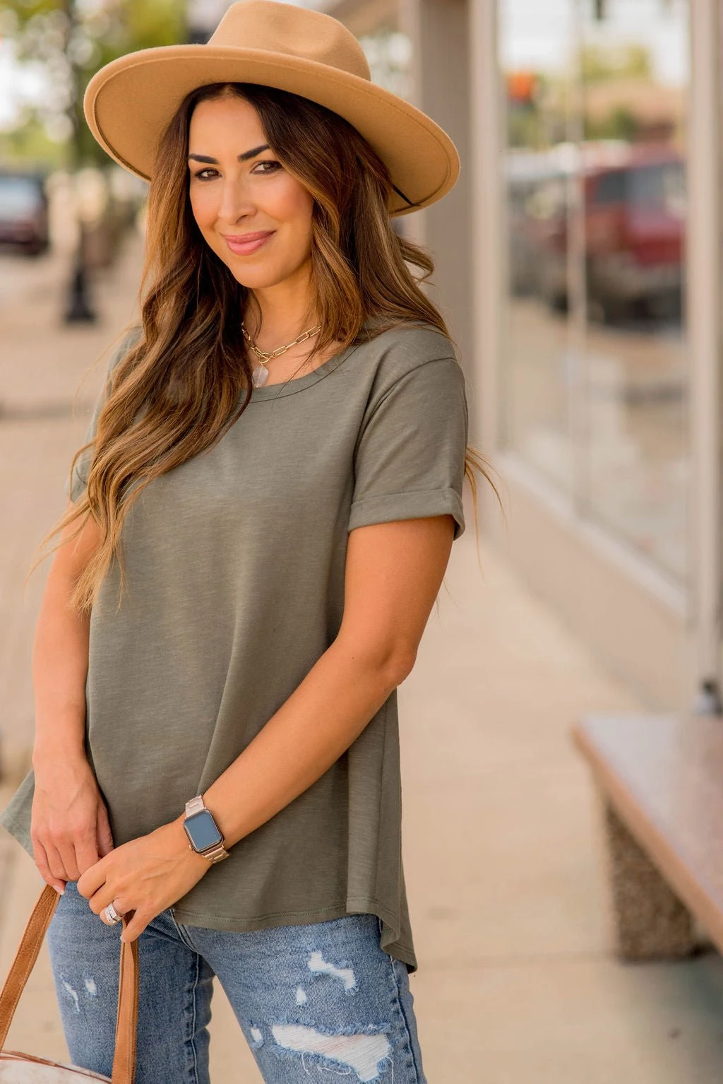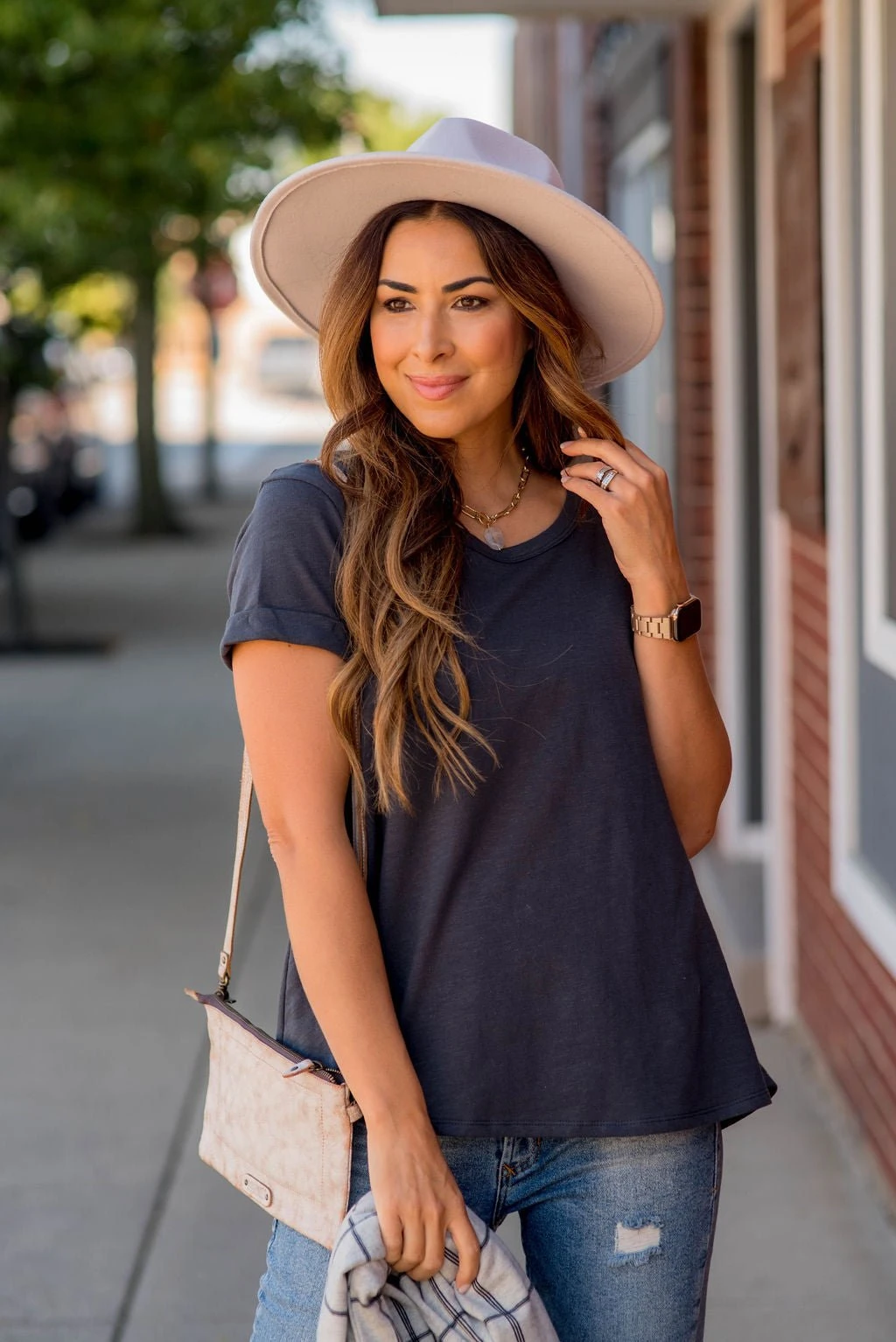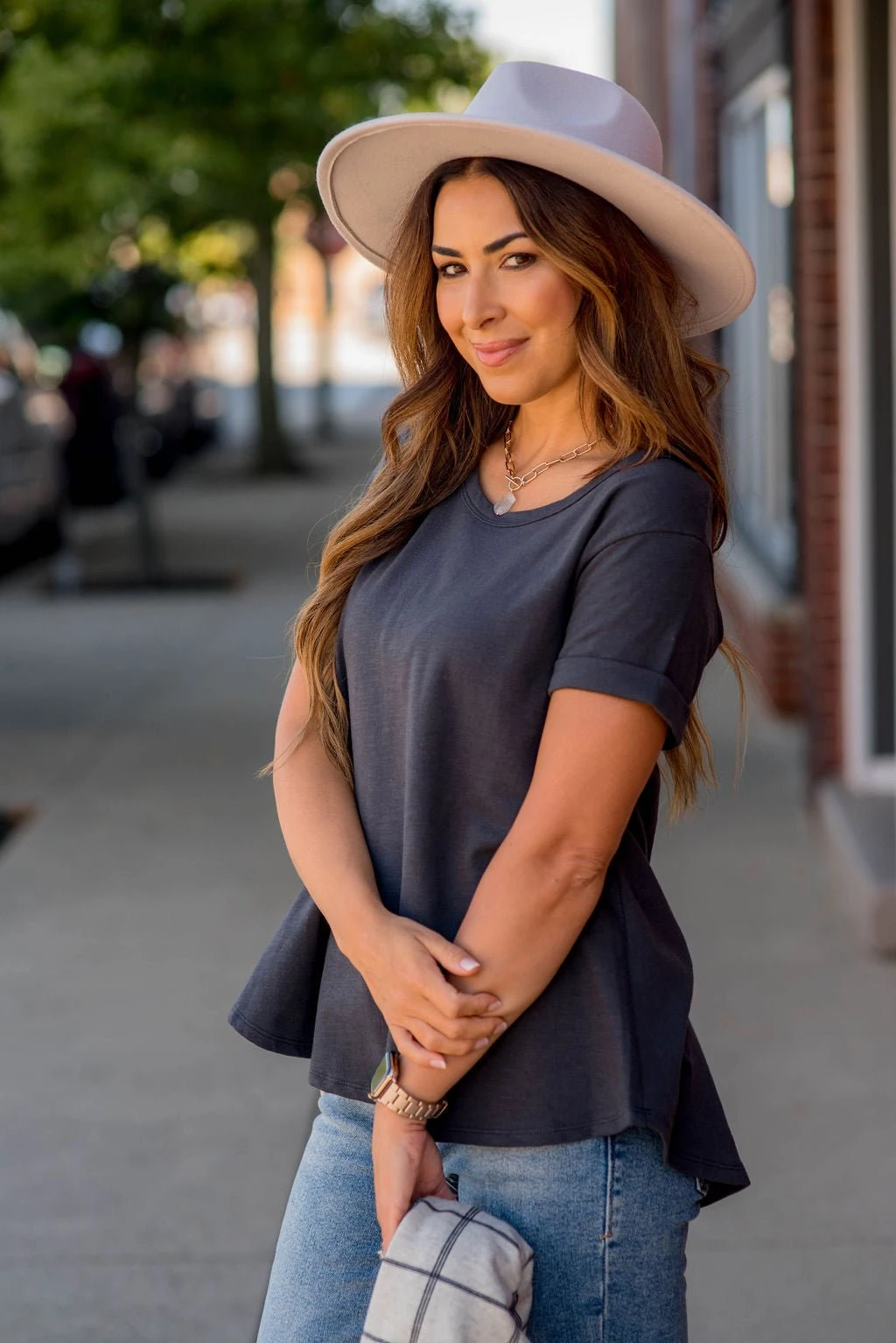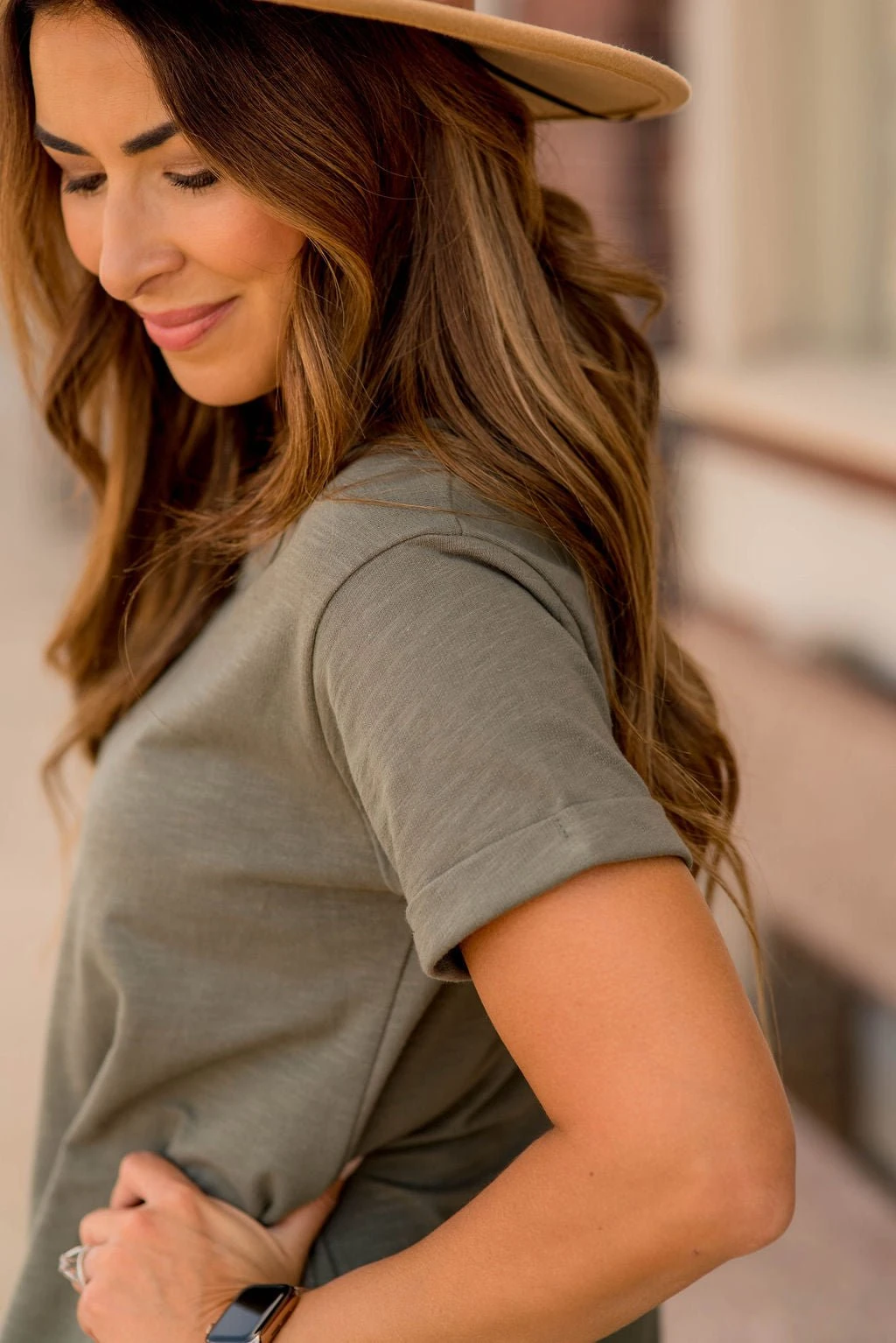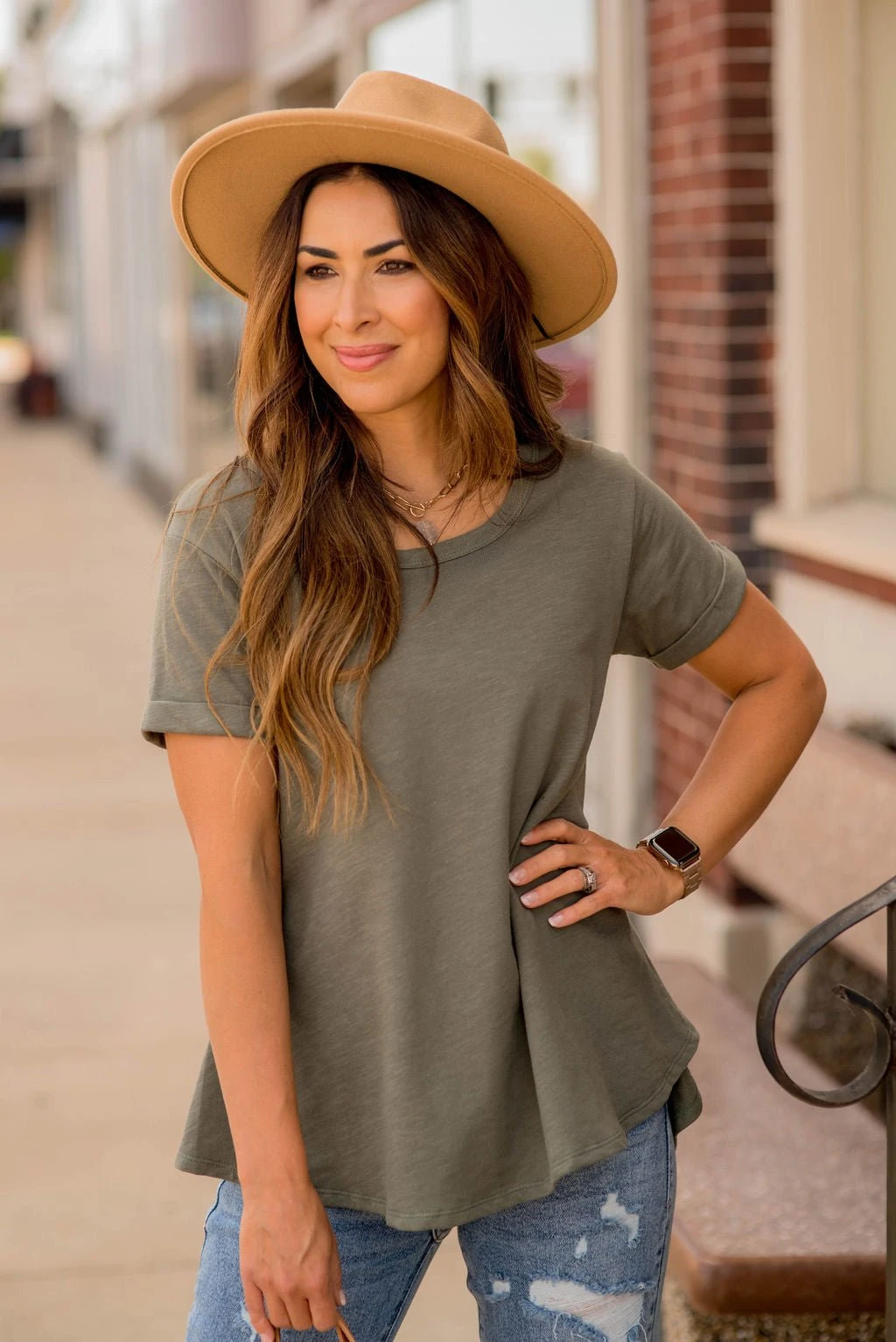 A basic tee with a flare, our Cuffed Relaxed Swing Tee is a great basic item to throw on and go! Pair it with your favorite shorts in the summer, or layer it under a shacket with jeans in the fall!