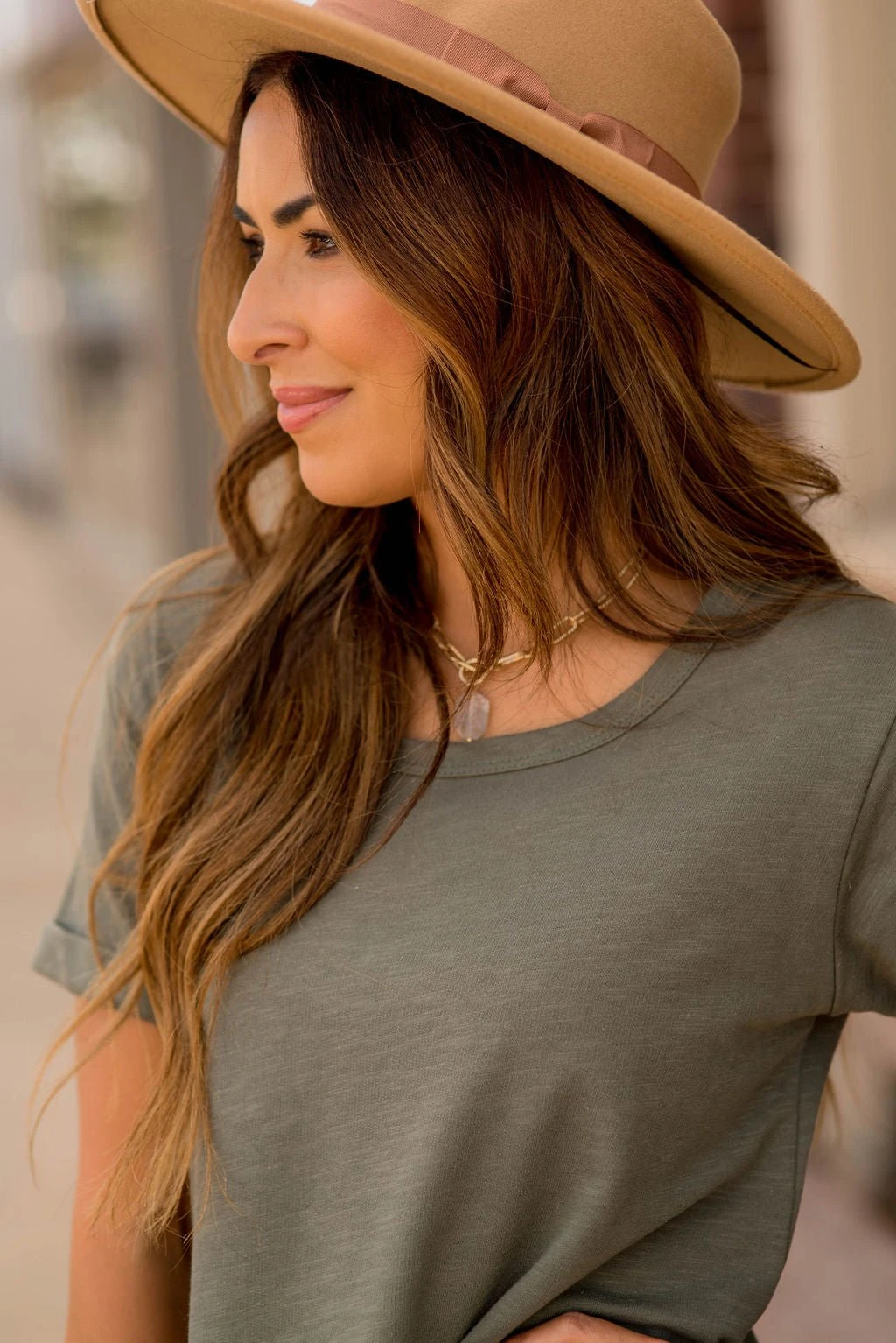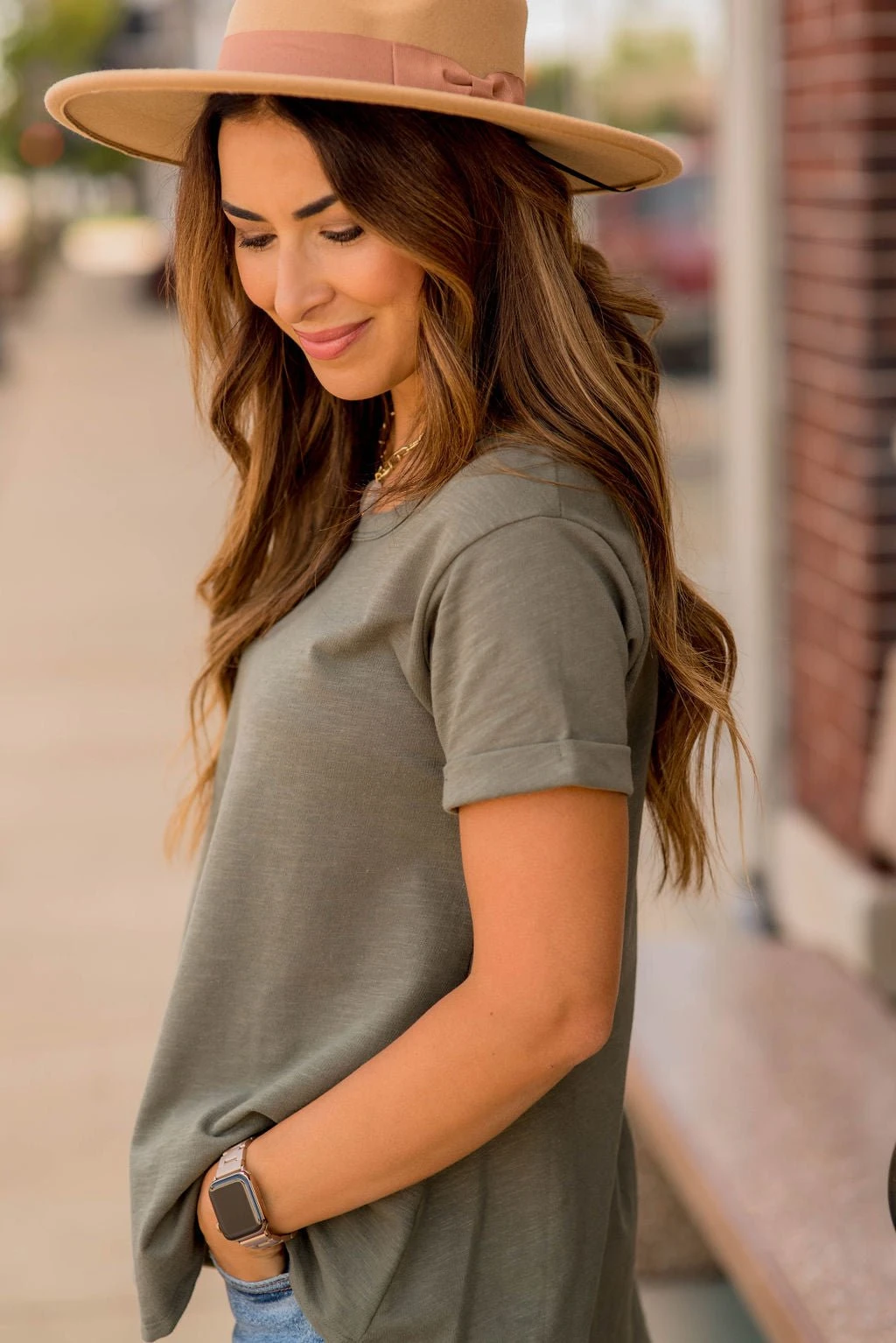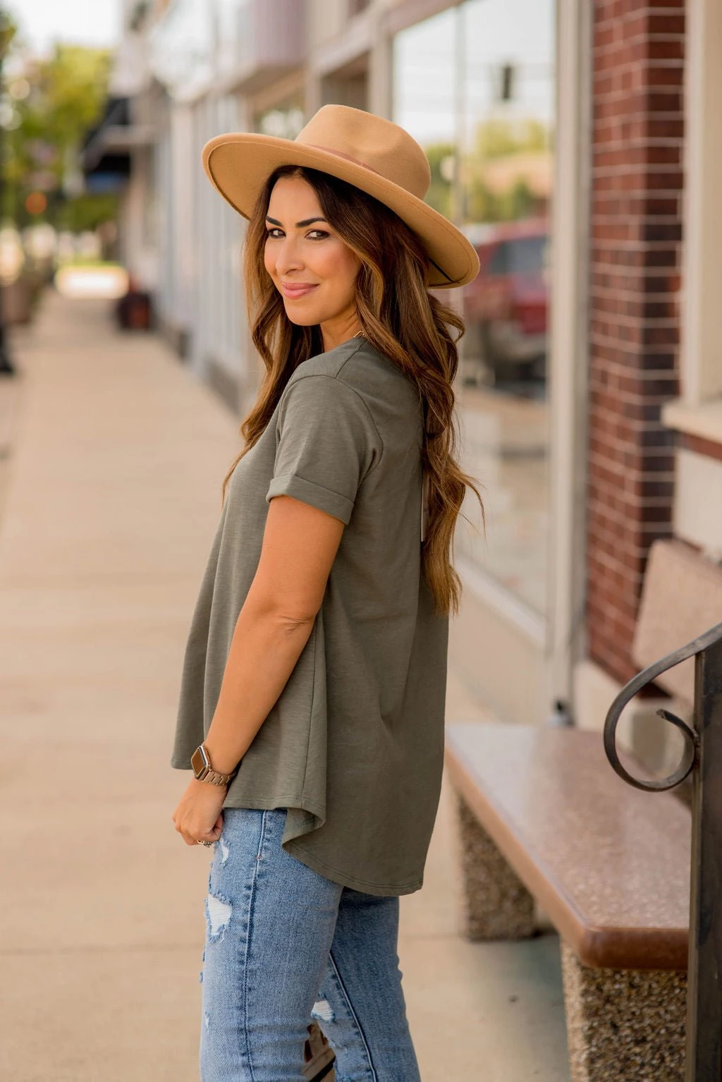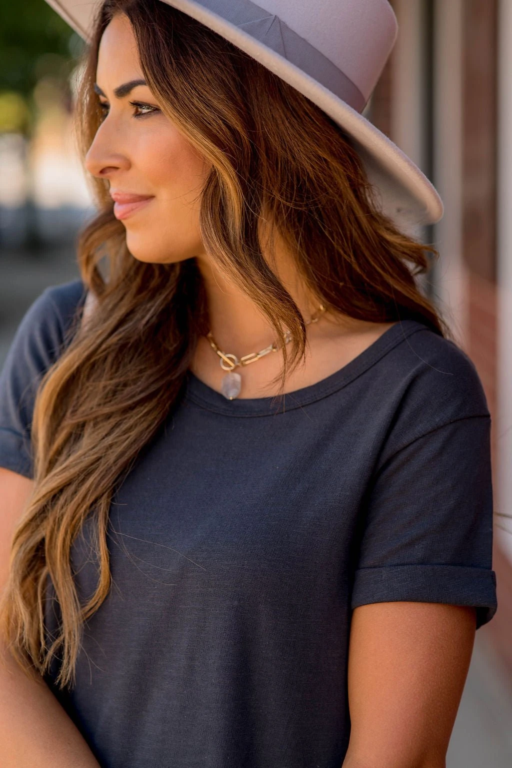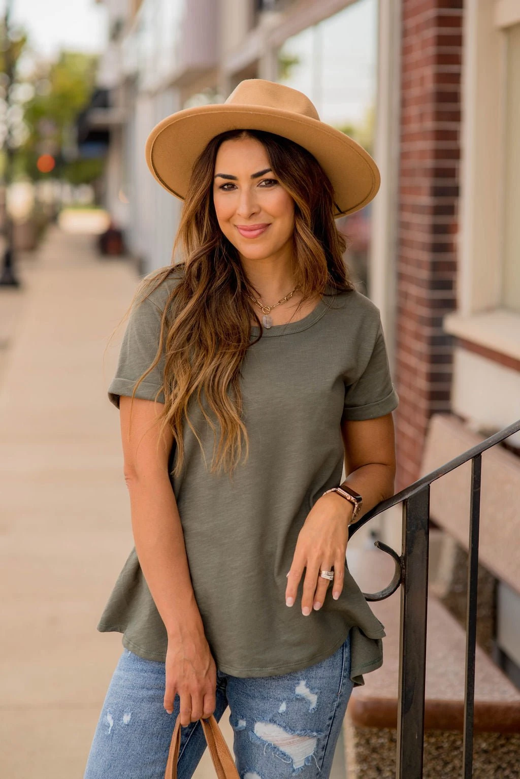 A basic tee with a flare, our Cuffed Relaxed Swing Tee is a great basic item to throw on and go! Pair it with your favorite shorts in the summer, or layer it under a shacket with jeans in the fall!