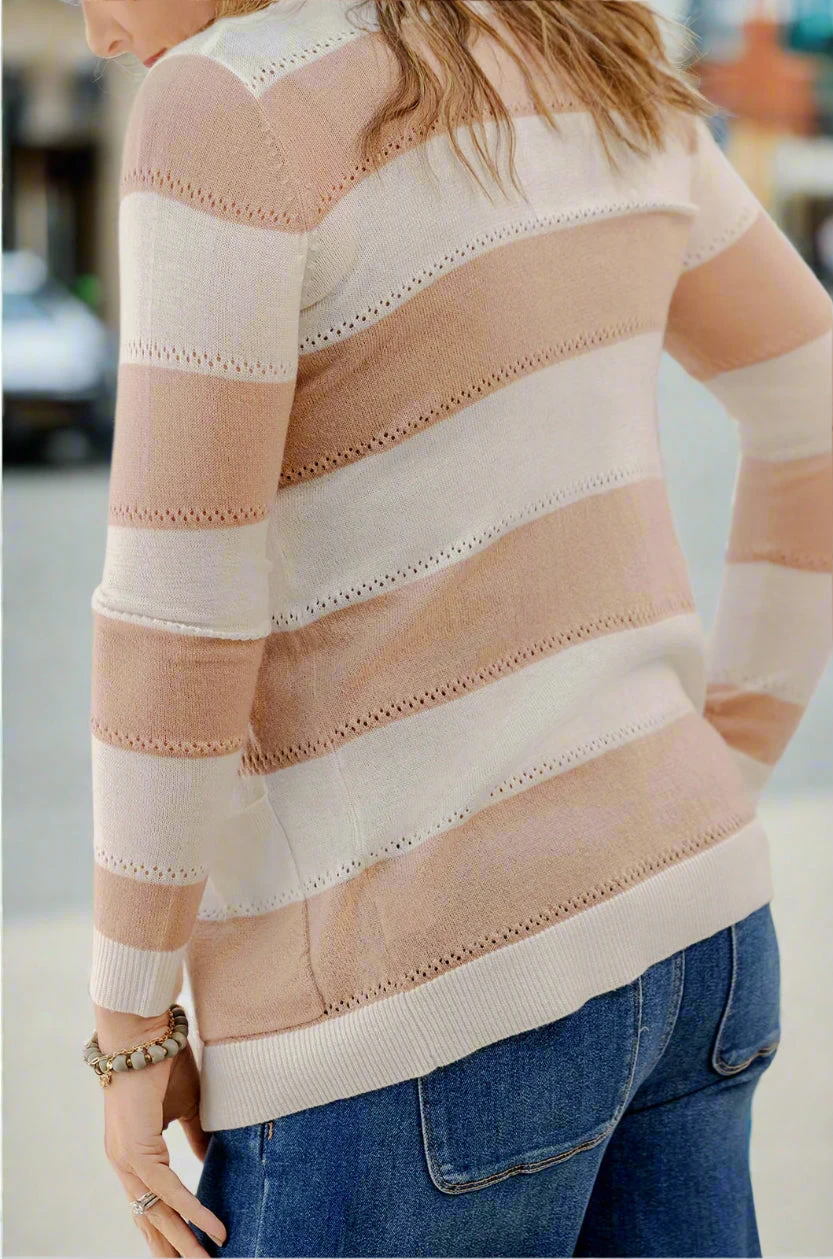Cardigans are an essential part of every girls wardrobe! They are so easy to style and perfectly transition you through seasons! This cardigan features cutout accents and stripes to give it that little added texture!Â