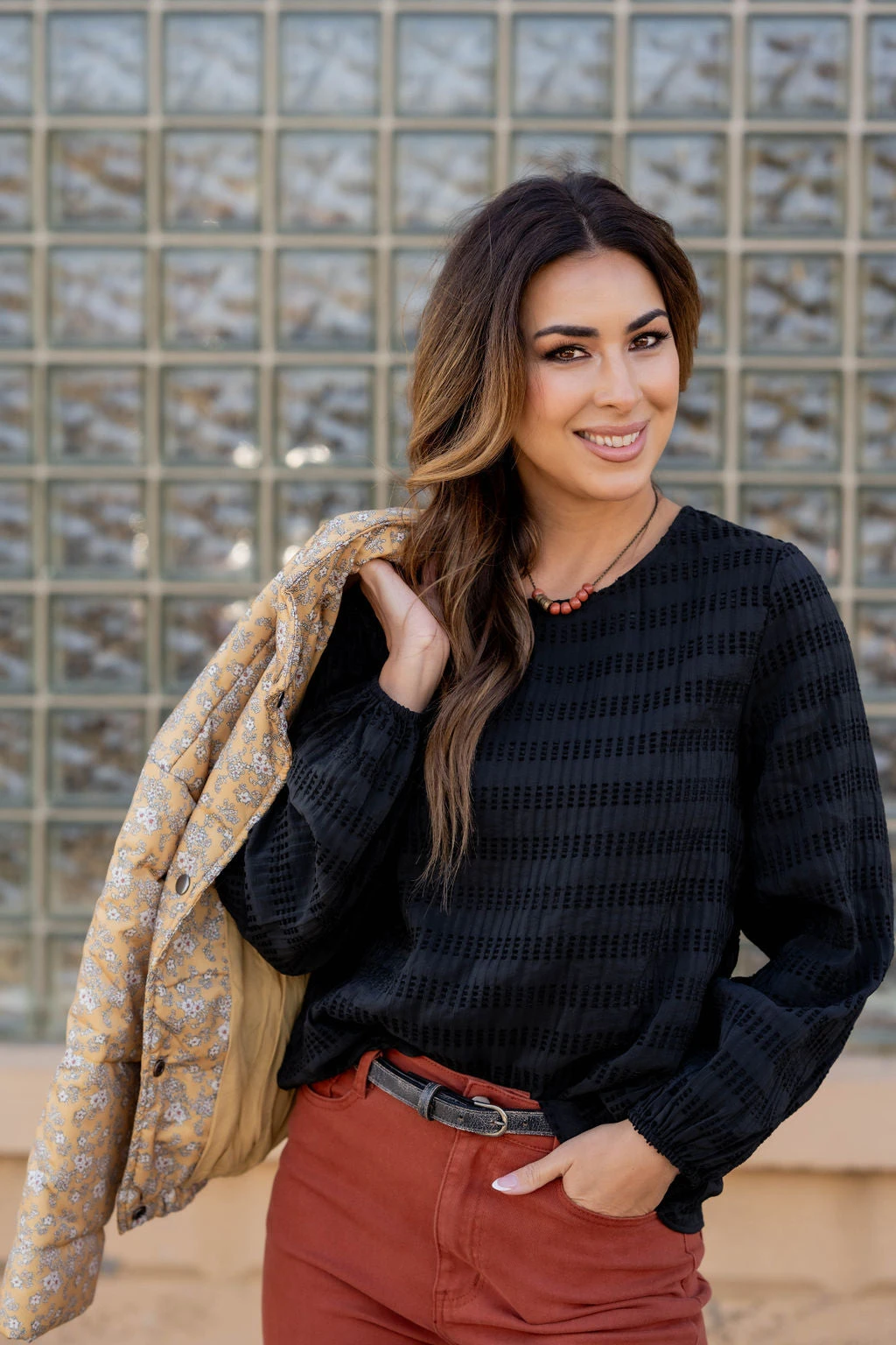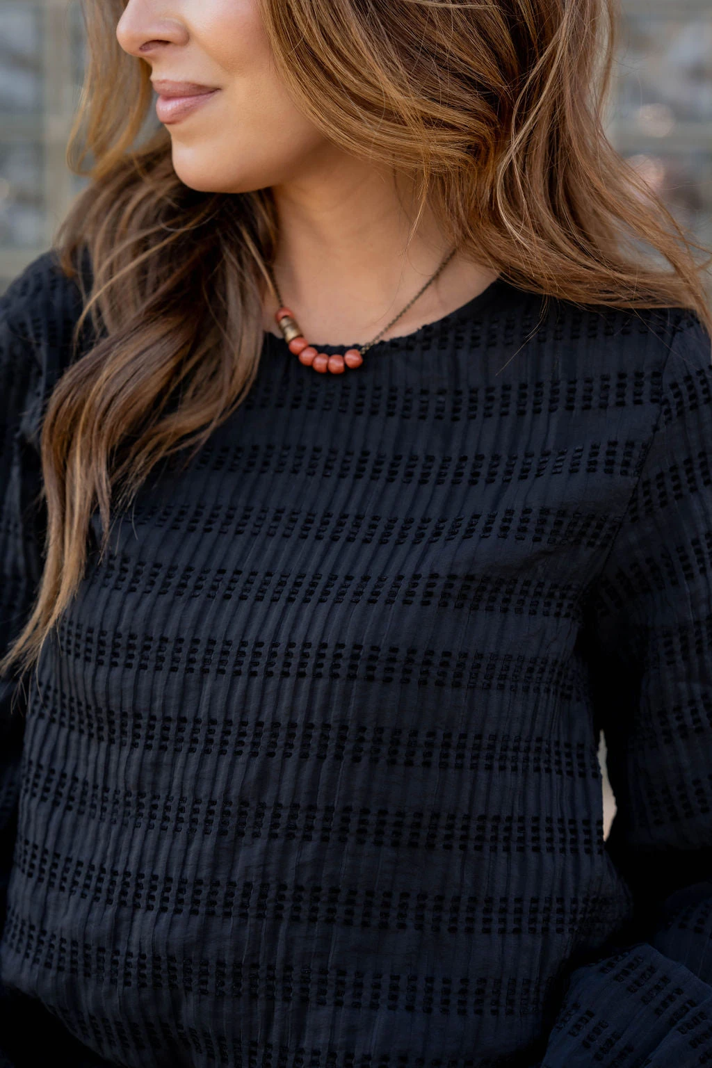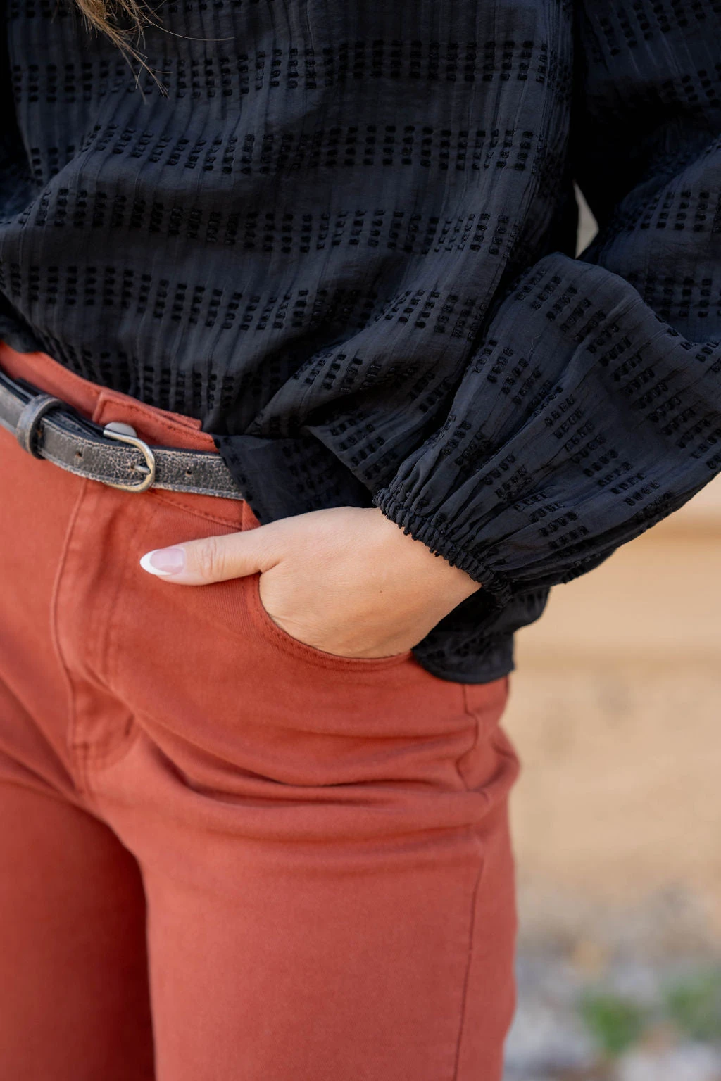 How cute is this blouse? With sewn dashed pattern and the cinched sleeves, this is a piece that you can dress up or down, depending on what you want! It also looks great with a cardigan, shacket, or vest over it!