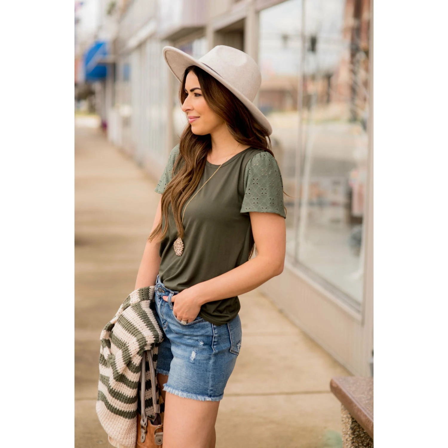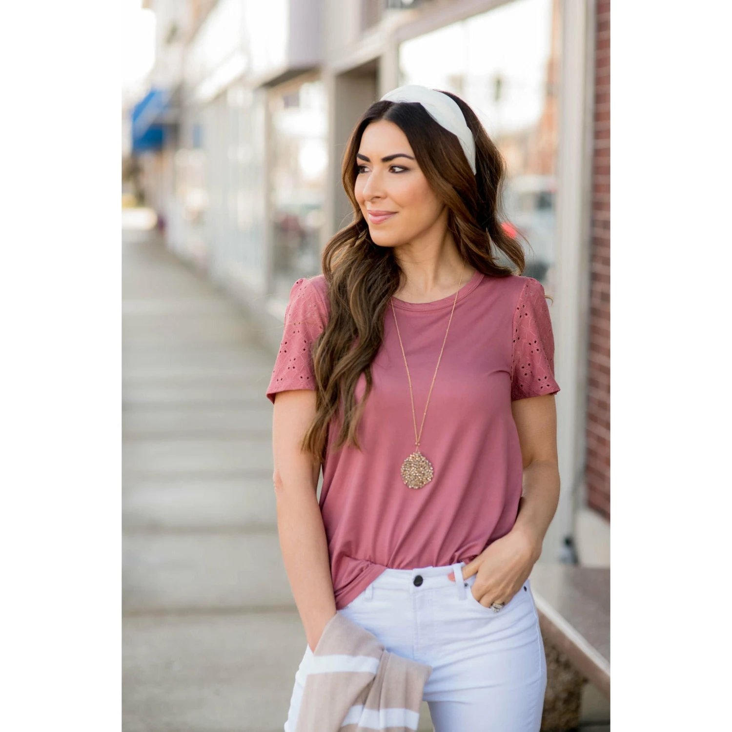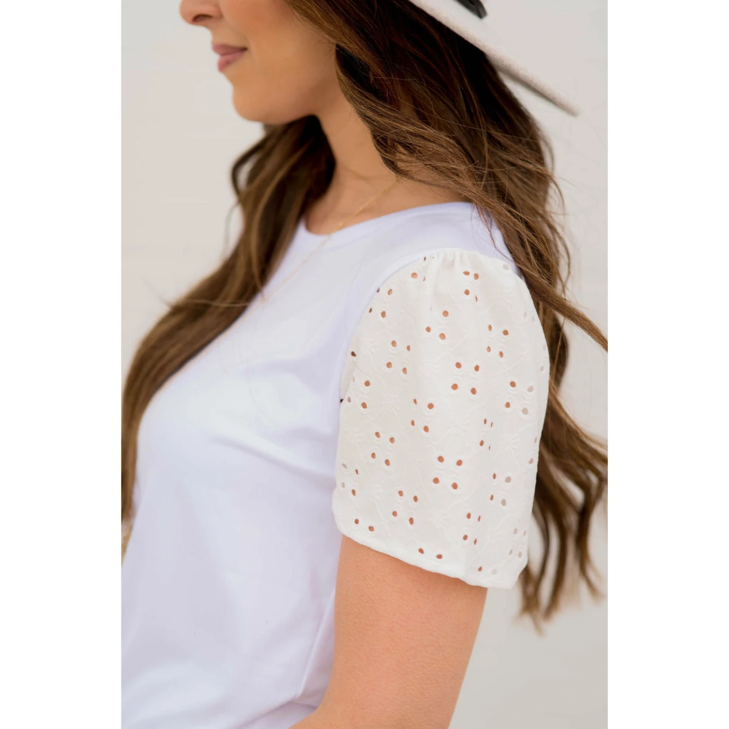A simple tee with a twist! The detailed eyelet sleeves on this tee sets it apart from the rest! Pair with your favorite patterned skirt or high-waisted shorts for a bold and elevated look, or with your favorite pair of denim for a casual and every day style!