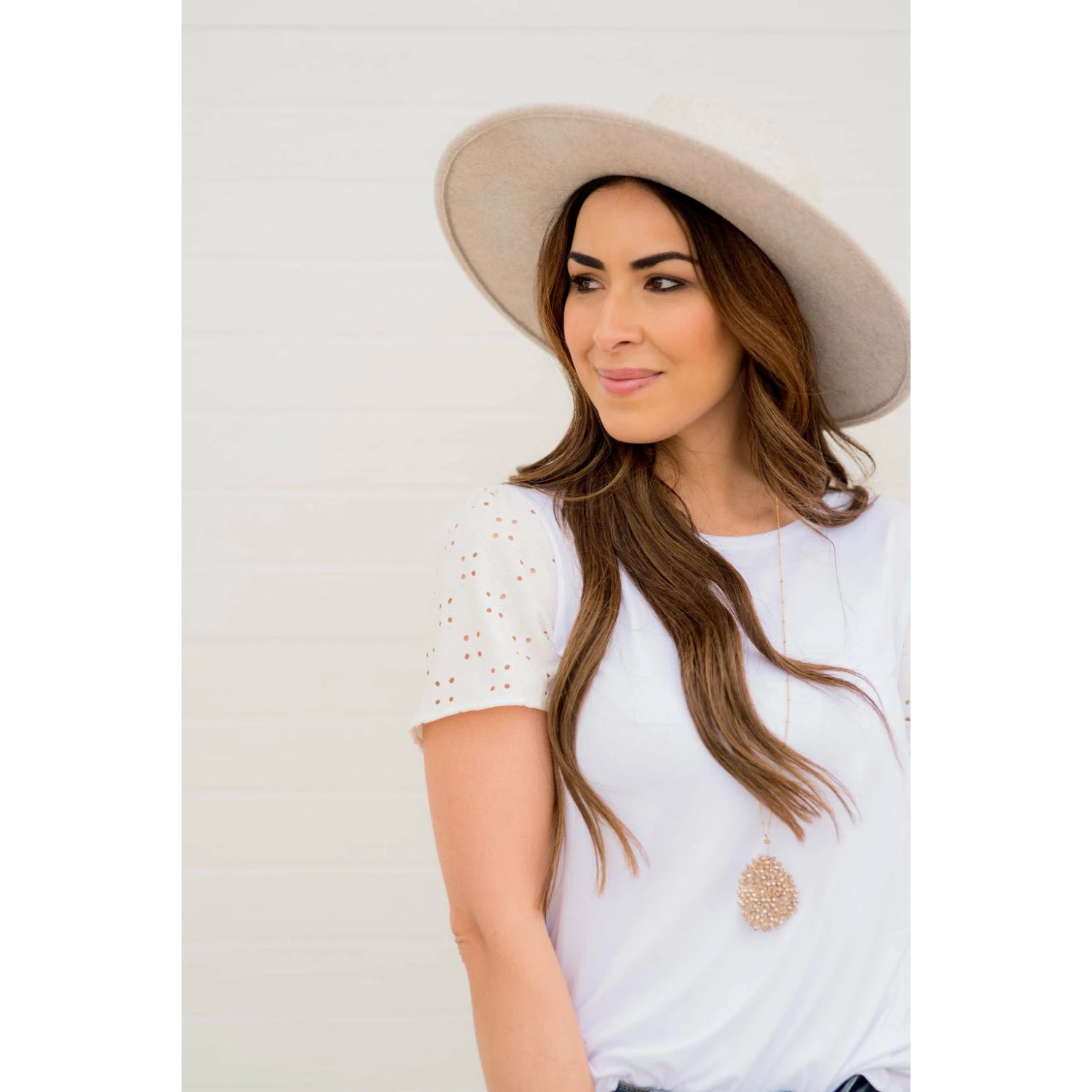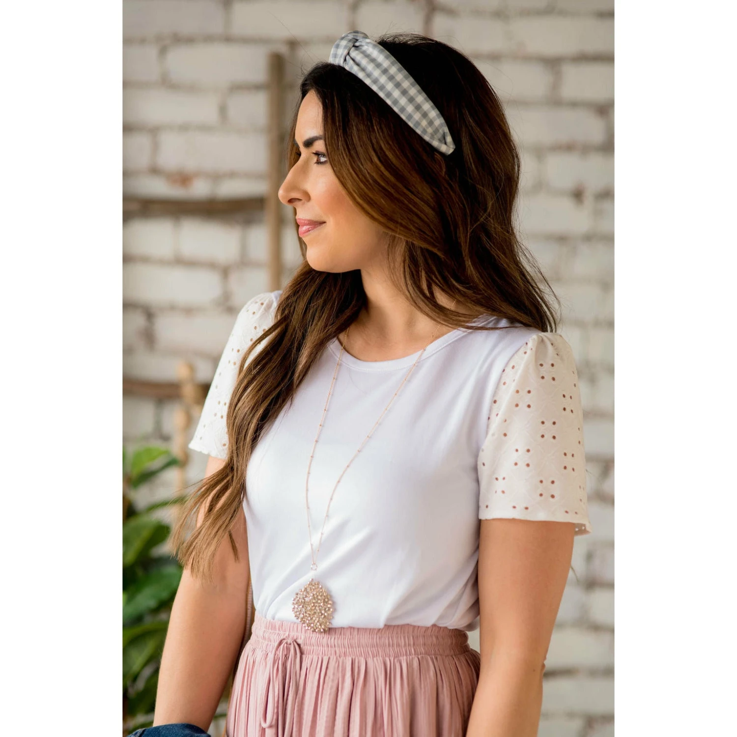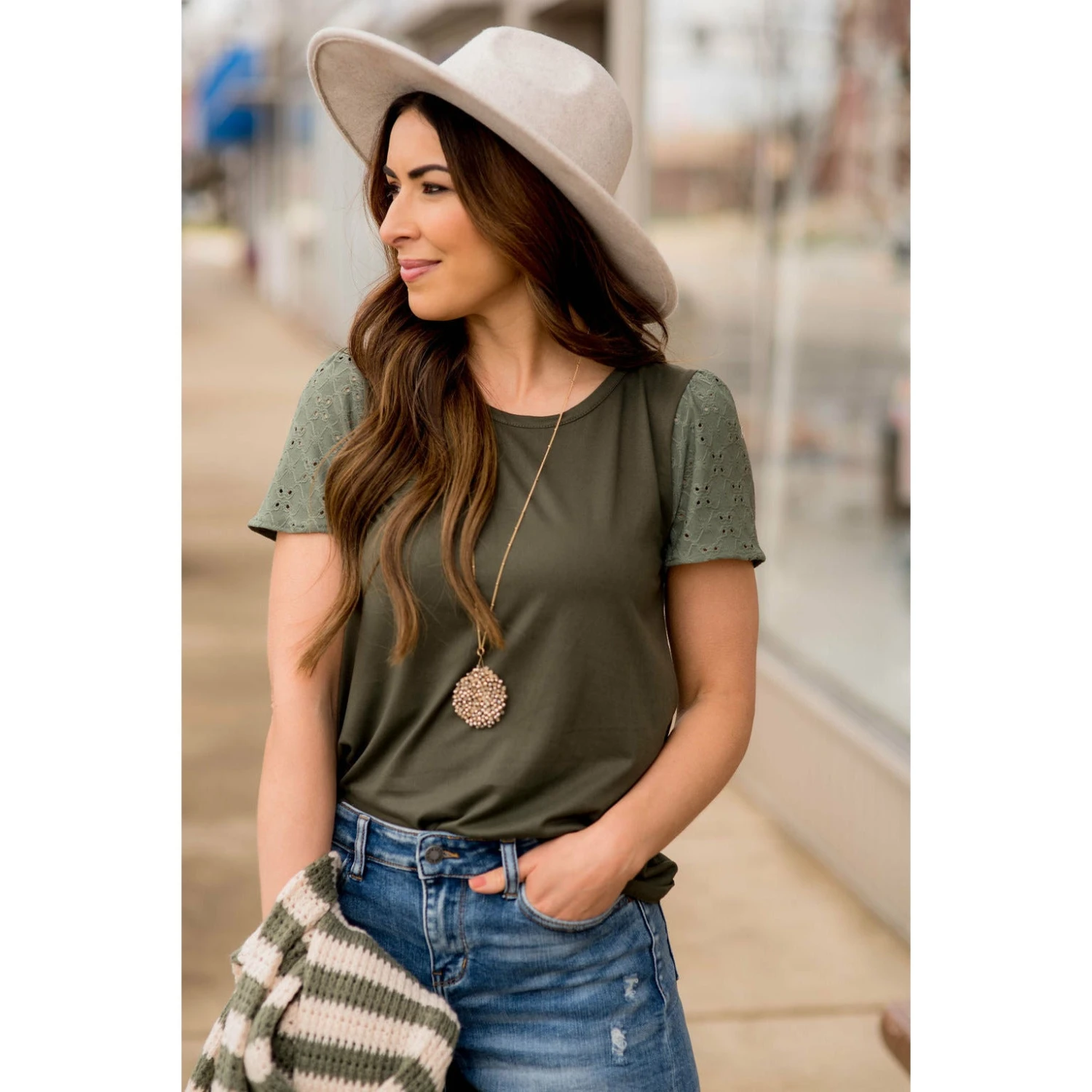 A simple tee with a twist! The detailed eyelet sleeves on this tee sets it apart from the rest! Pair with your favorite patterned skirt or high-waisted shorts for a bold and elevated look, or with your favorite pair of denim for a casual and every day style!