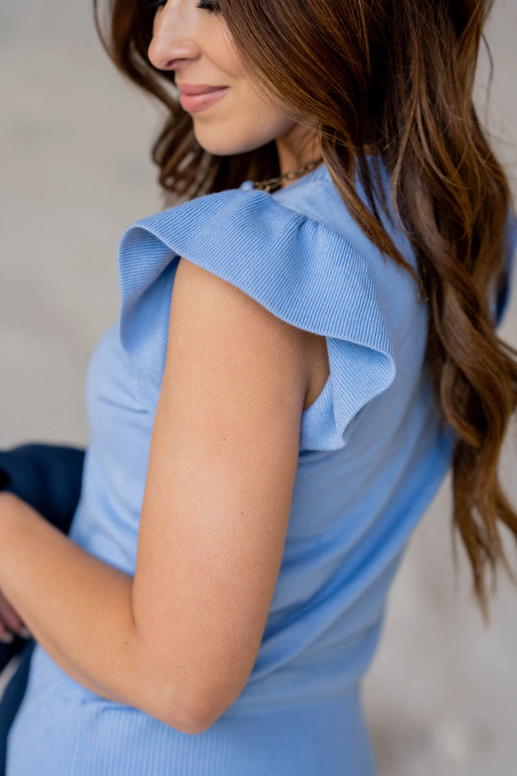 We love this unique tee! The detailed cutout pattern in this tee with the ribbed ruffle accents make this a must-have! Wear alone with shorts or a skirt in the warmer months or use as a layering piece for your cardigans, blazers, or shackets in the cooler ones!
