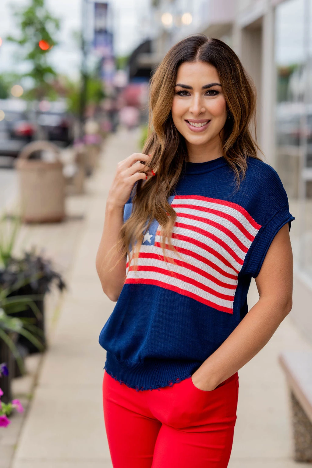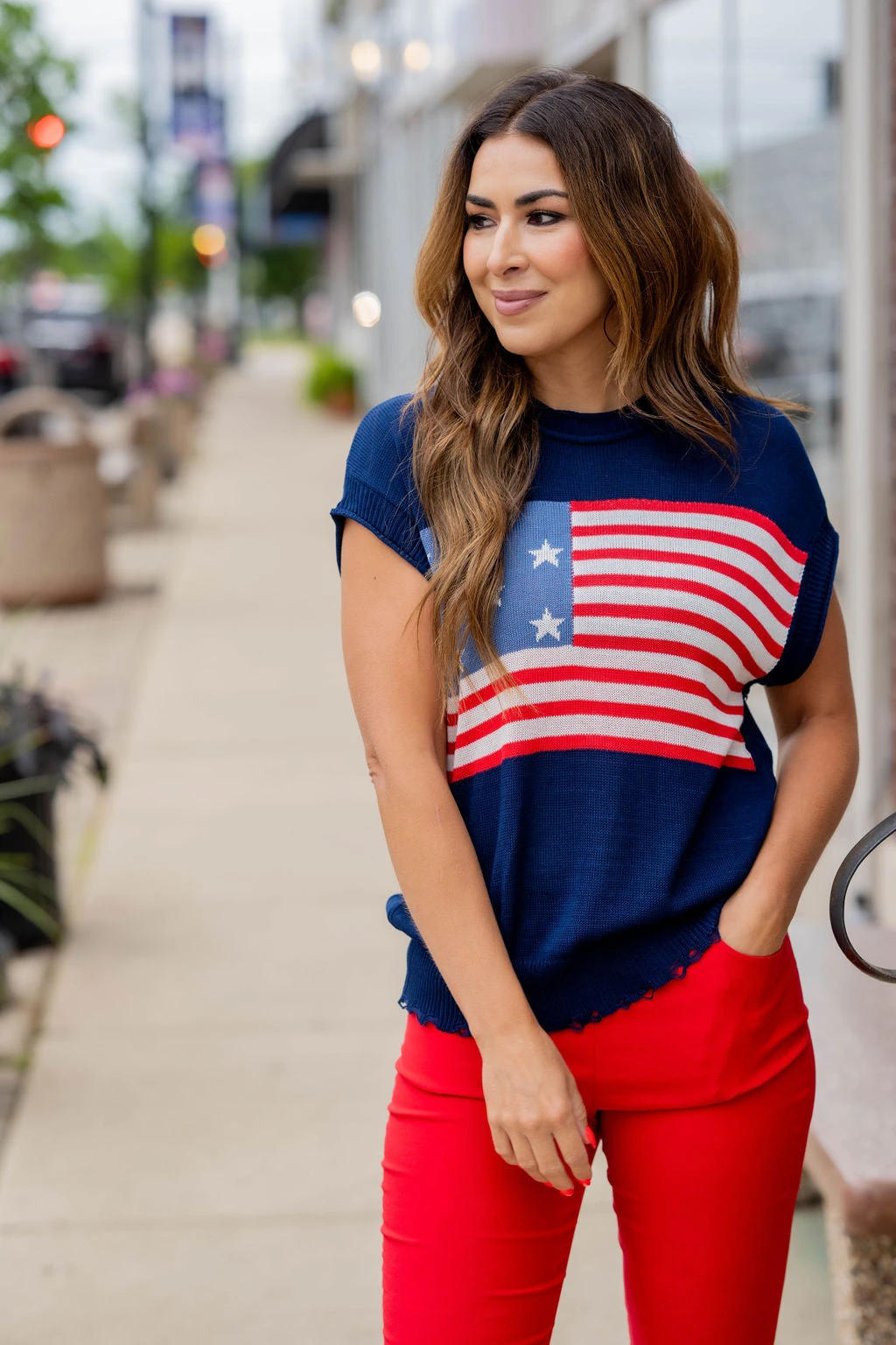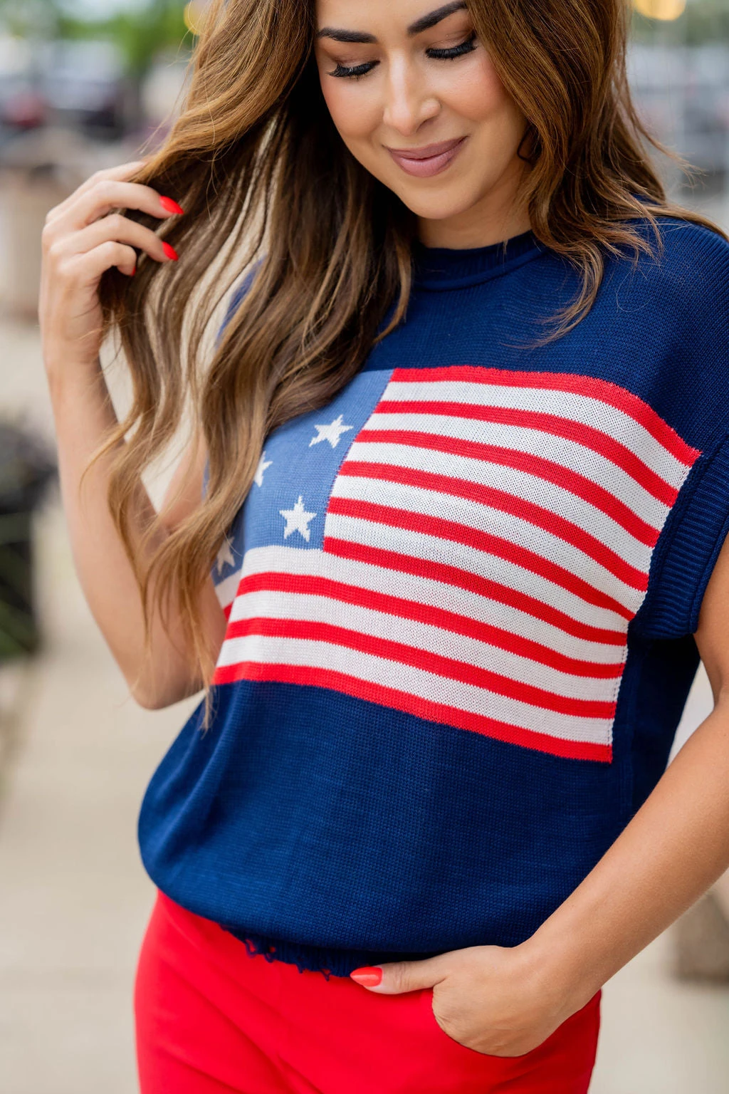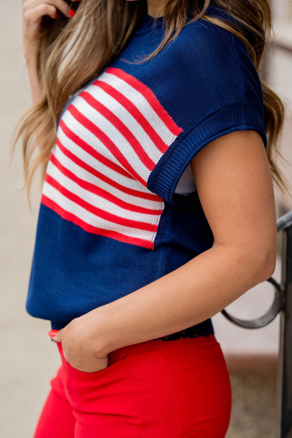 Show off your patriotic side with this fun sweater! This is great paired with your favorite shorts in the warmer months or with denim, joggers, or our Betsey’s Jeggings in the cooler ones! Just add your favorite accessories to make this look yours! The ribbed trim has distressing at the bottom to give it an edgy look!