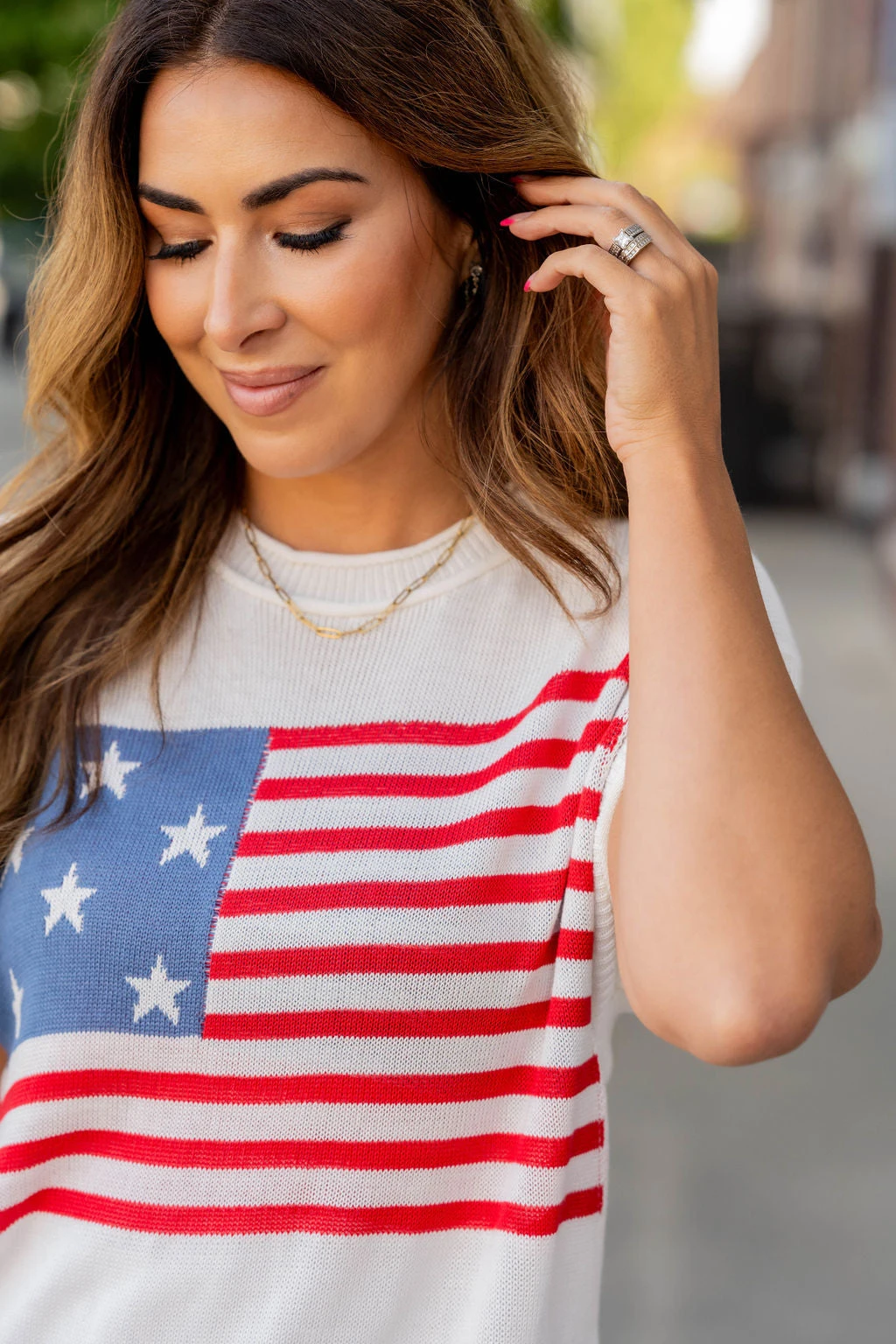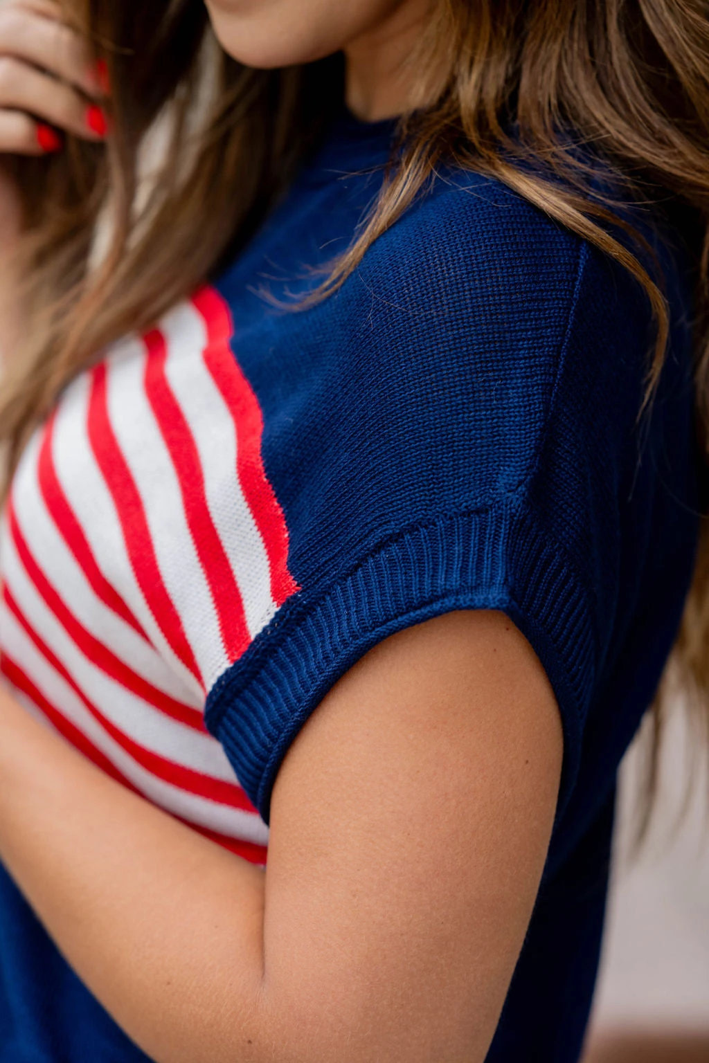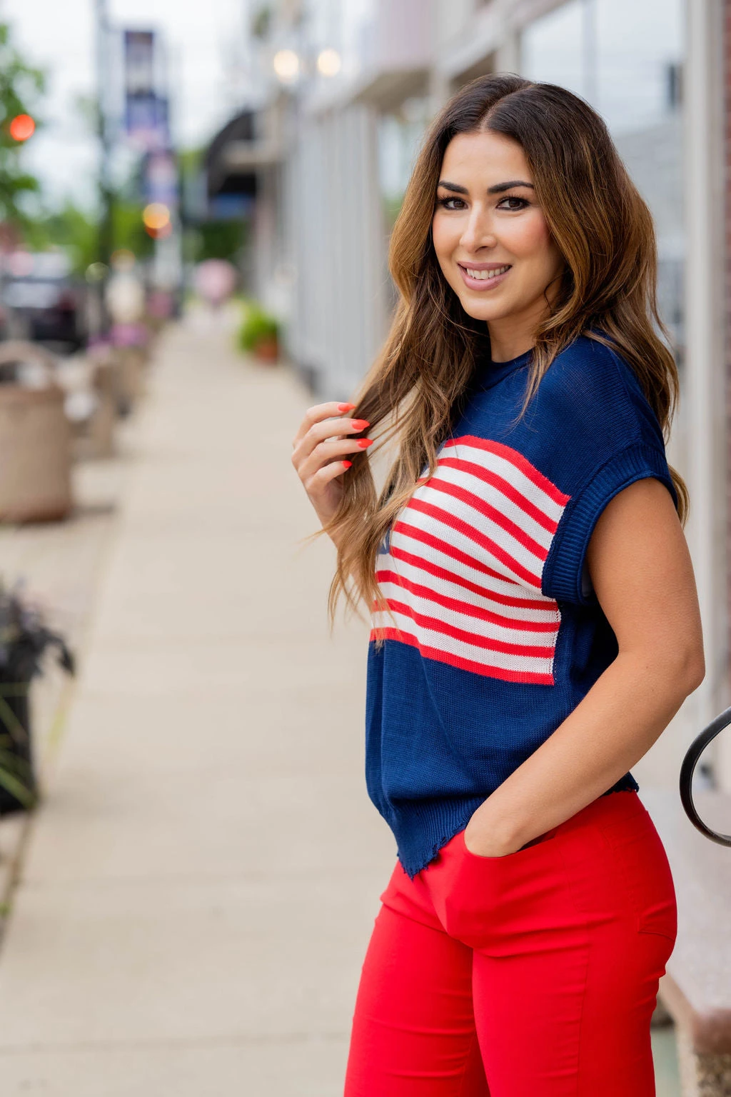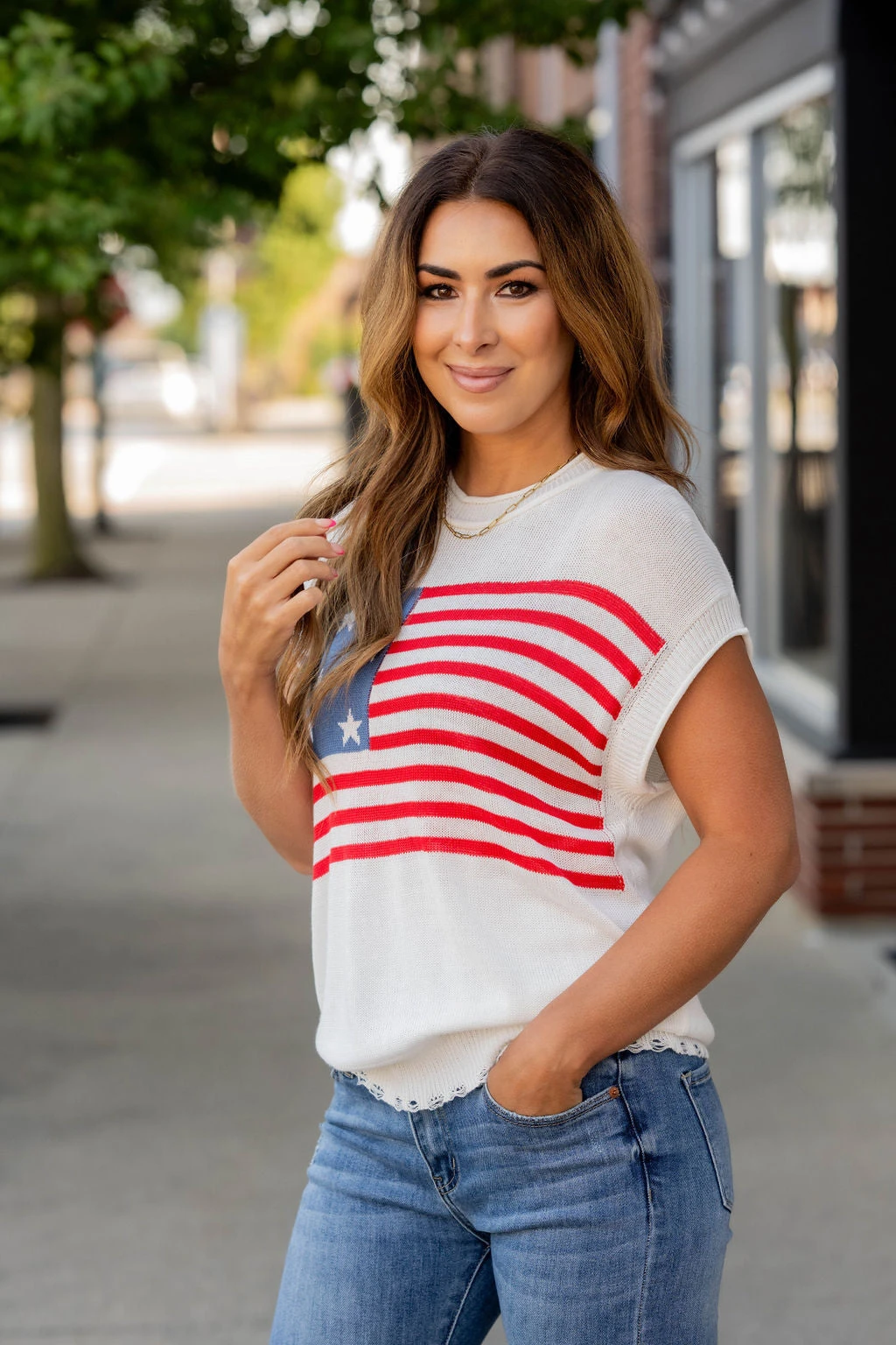 Show off your patriotic side with this fun sweater! This is great paired with your favorite shorts in the warmer months or with denim, joggers, or our Betsey’s Jeggings in the cooler ones! Just add your favorite accessories to make this look yours! The ribbed trim has distressing at the bottom to give it an edgy look!