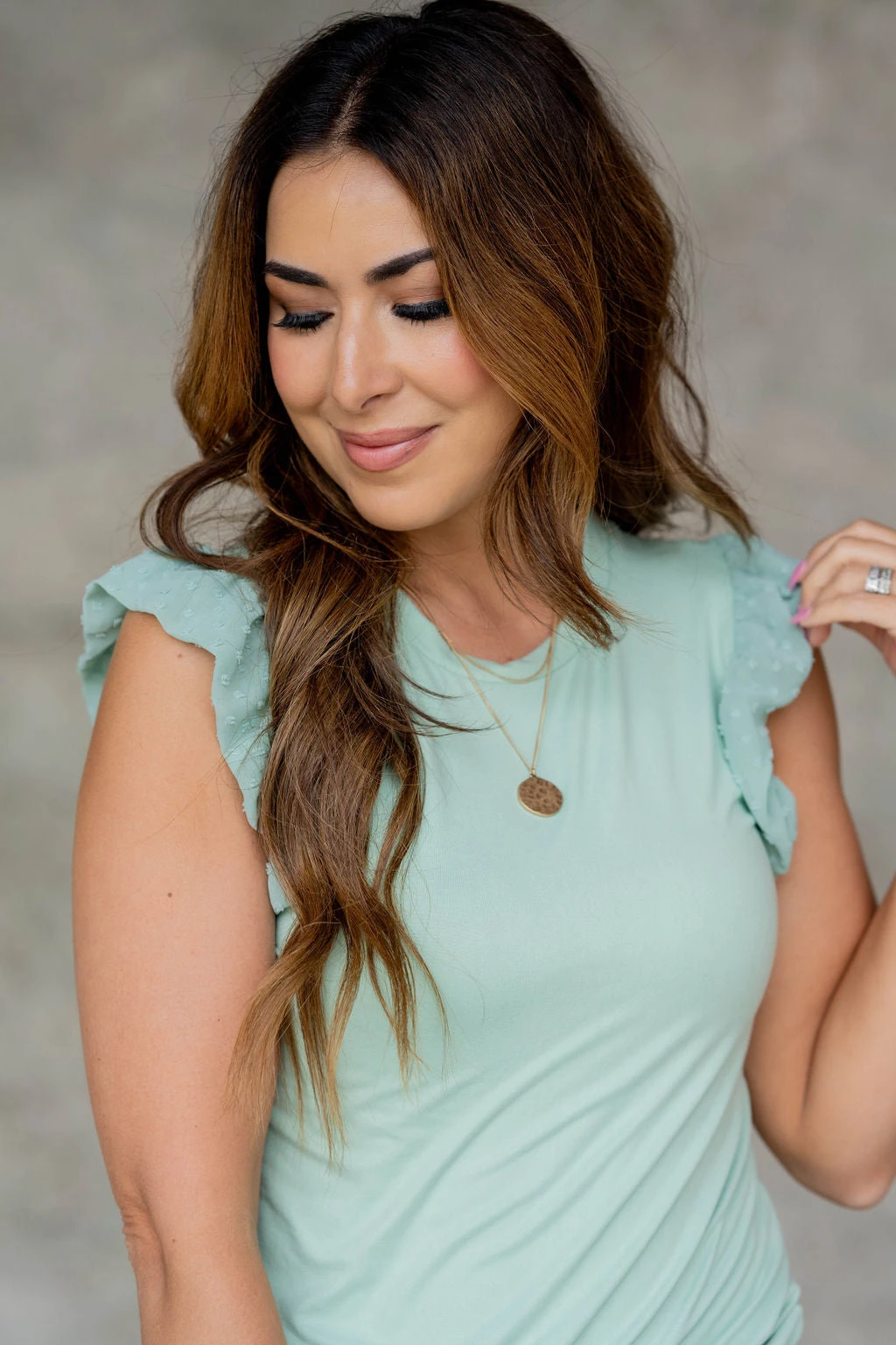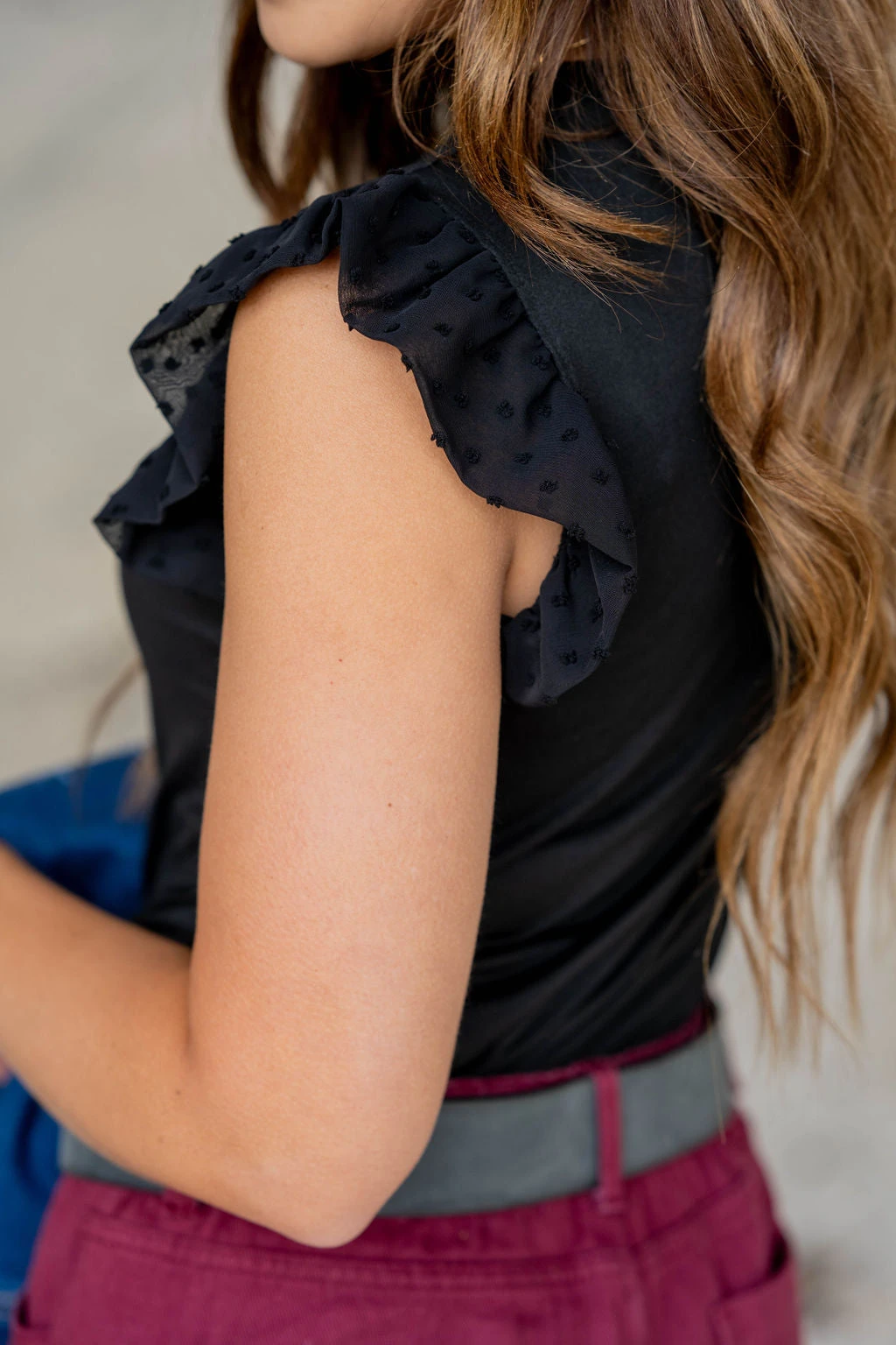 A soft and lightweight tank elevated with a puffed ruffle trim with a textured dot material! This tank can be worn alone in the warmer months with shorts or a skirt or used as a layering piece for all of your cardigans or shackets in the cooler ones!