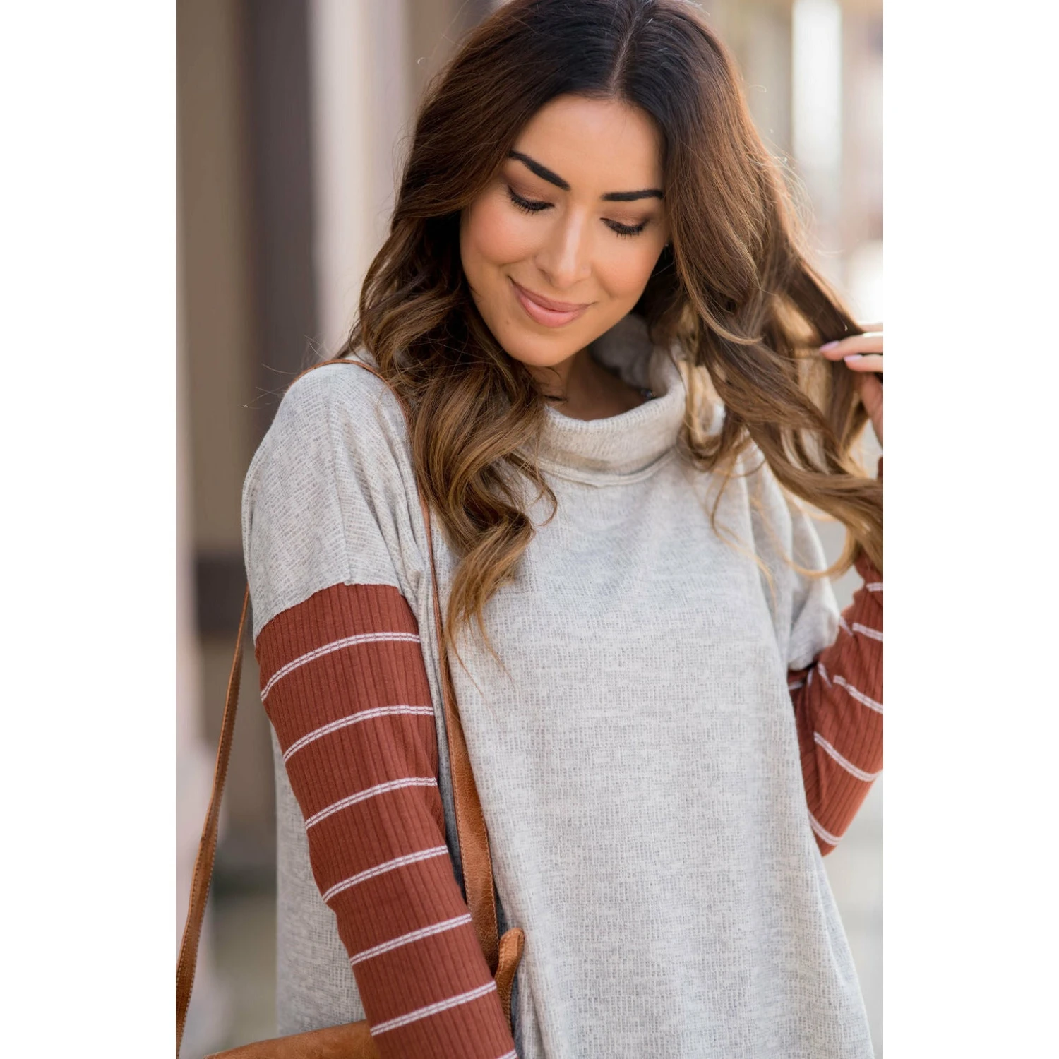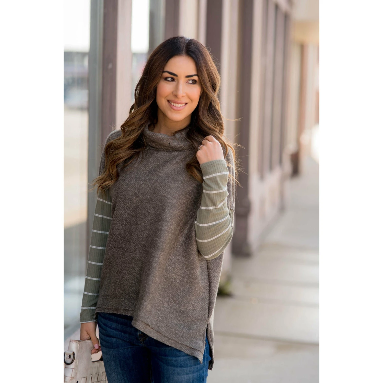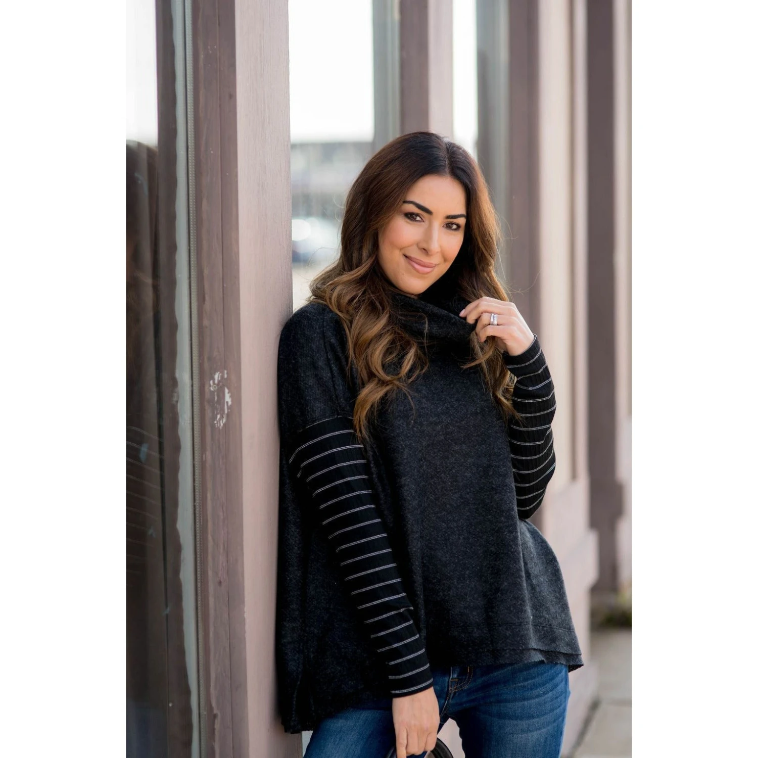 We are loving this poncho style sweater with double lined stripes! It is a great piece to wear with jeans and perfect for a day out!