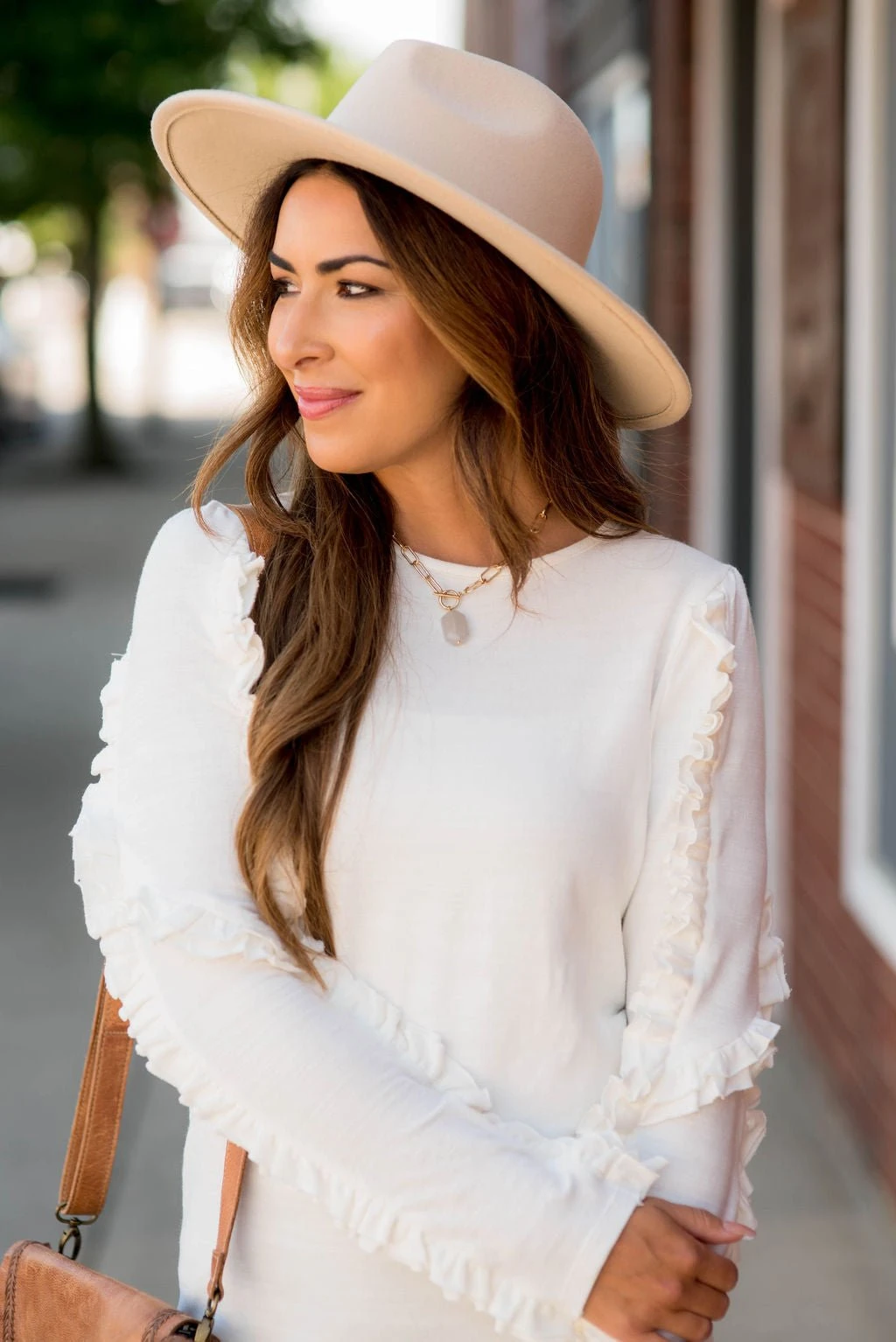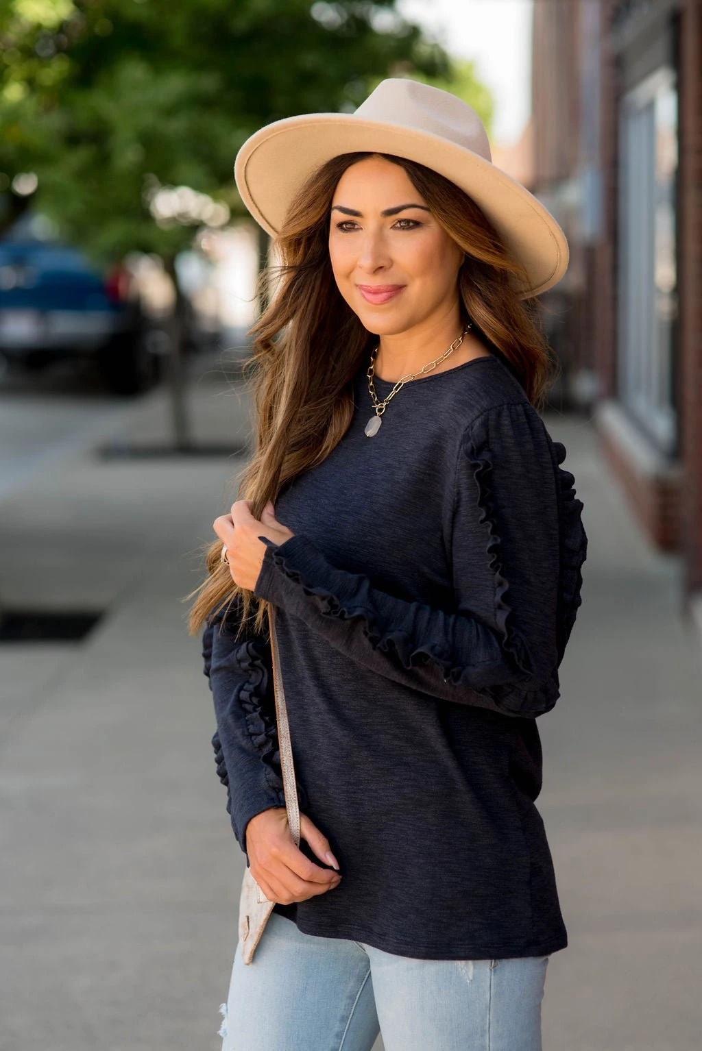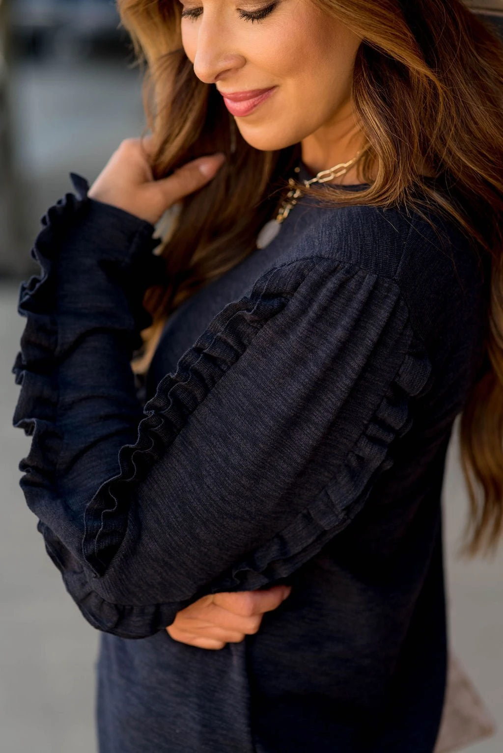 Sweatshirts don’t have to be boring! The double ruffled trim really sets this apart from the rest! This sweatshirt is lightweight, making it ideal to transition you throughout seasons and can be paired with shorts, denim, our Betsey’s Jeggings, or just a simple pair of leggings!
