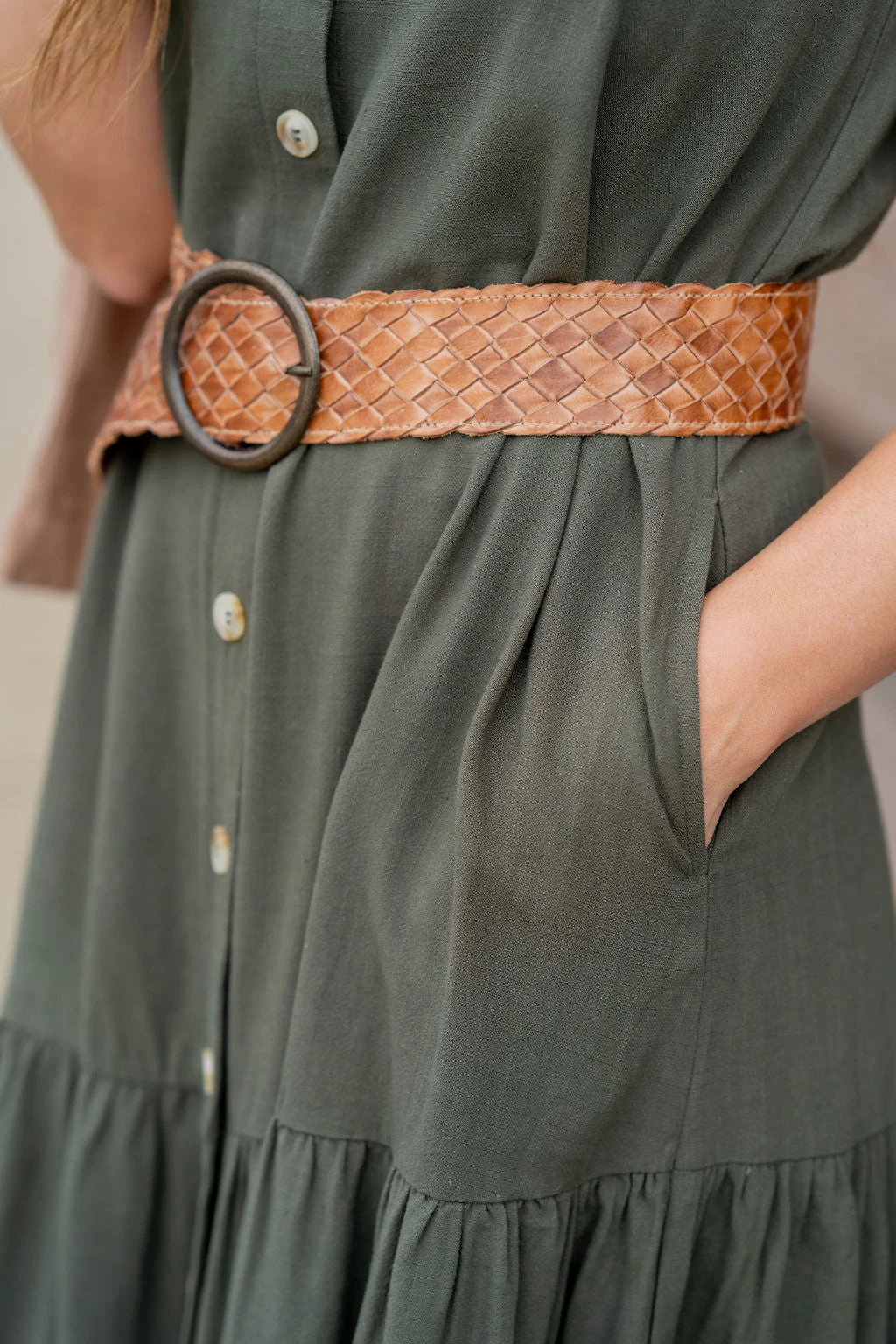 Created from meticulously woven distressed leather and adorned with a round brass-tone buckle, the Dreamweaver effortlessly infuses a touch of vintage allure into your style. Whether worn on the waist or the hip, this belt stands as a remarkable addition to any wardrobe.