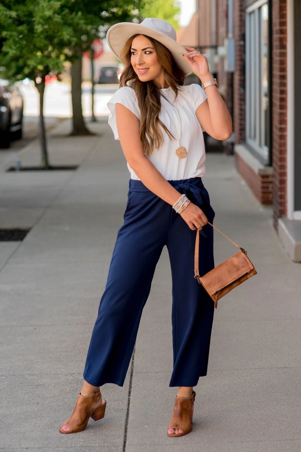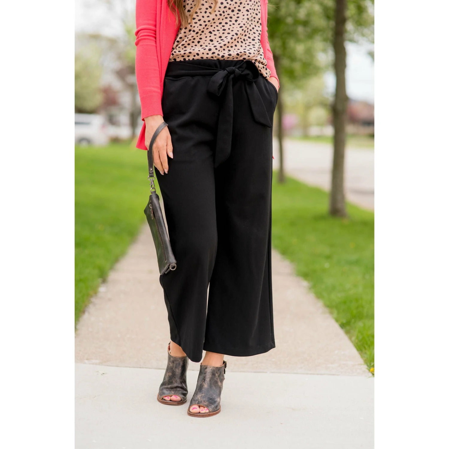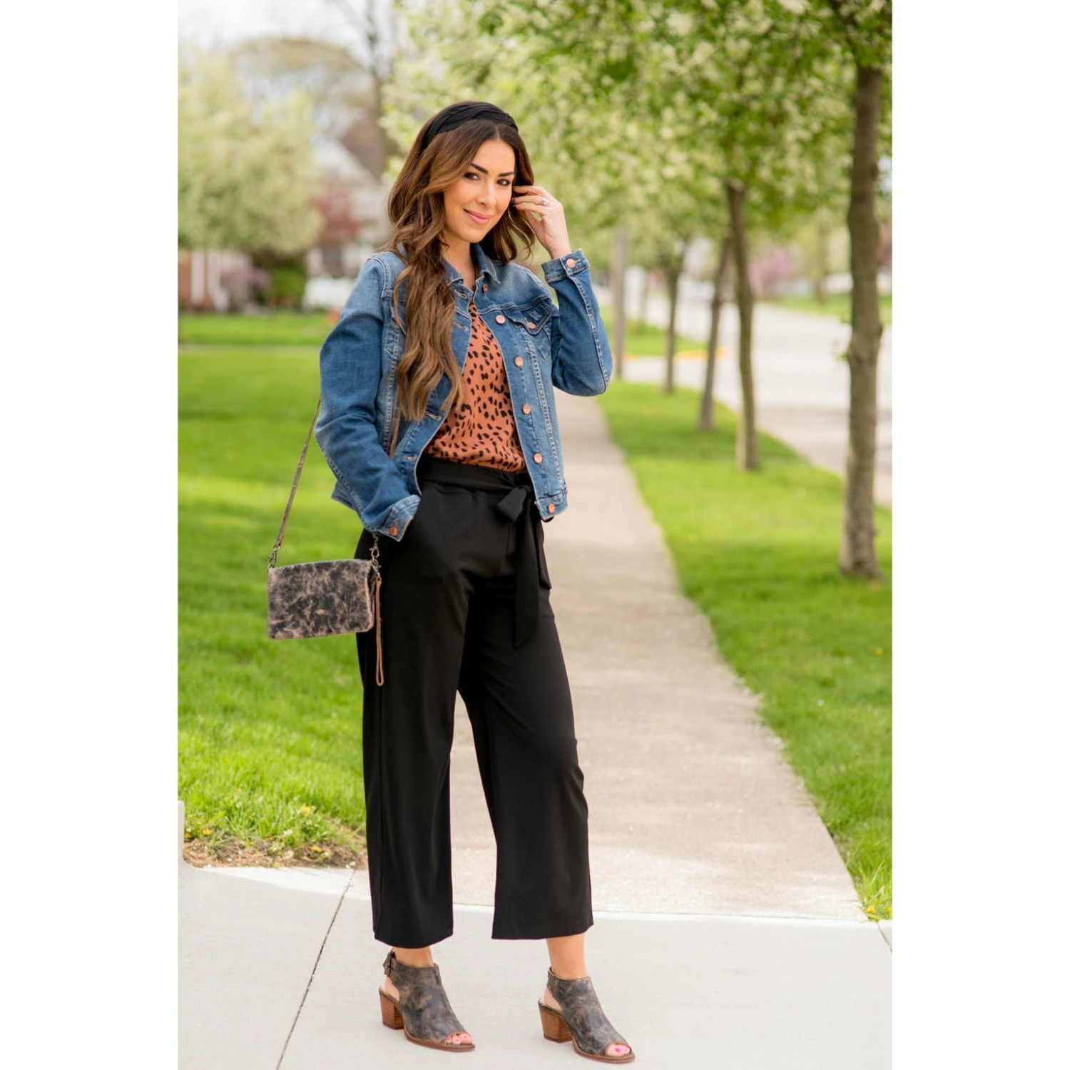 We are obsessed with these pants! Perfect for the office or the classroom or even date night out on the town! The dressier material, tie waist, pockets, and flare bottom detailing really set this apart from the rest! Pair these with a cute blouse tucked in for a more elevated look or even with a graphic tee and a denim jacket for a more casual outfit!