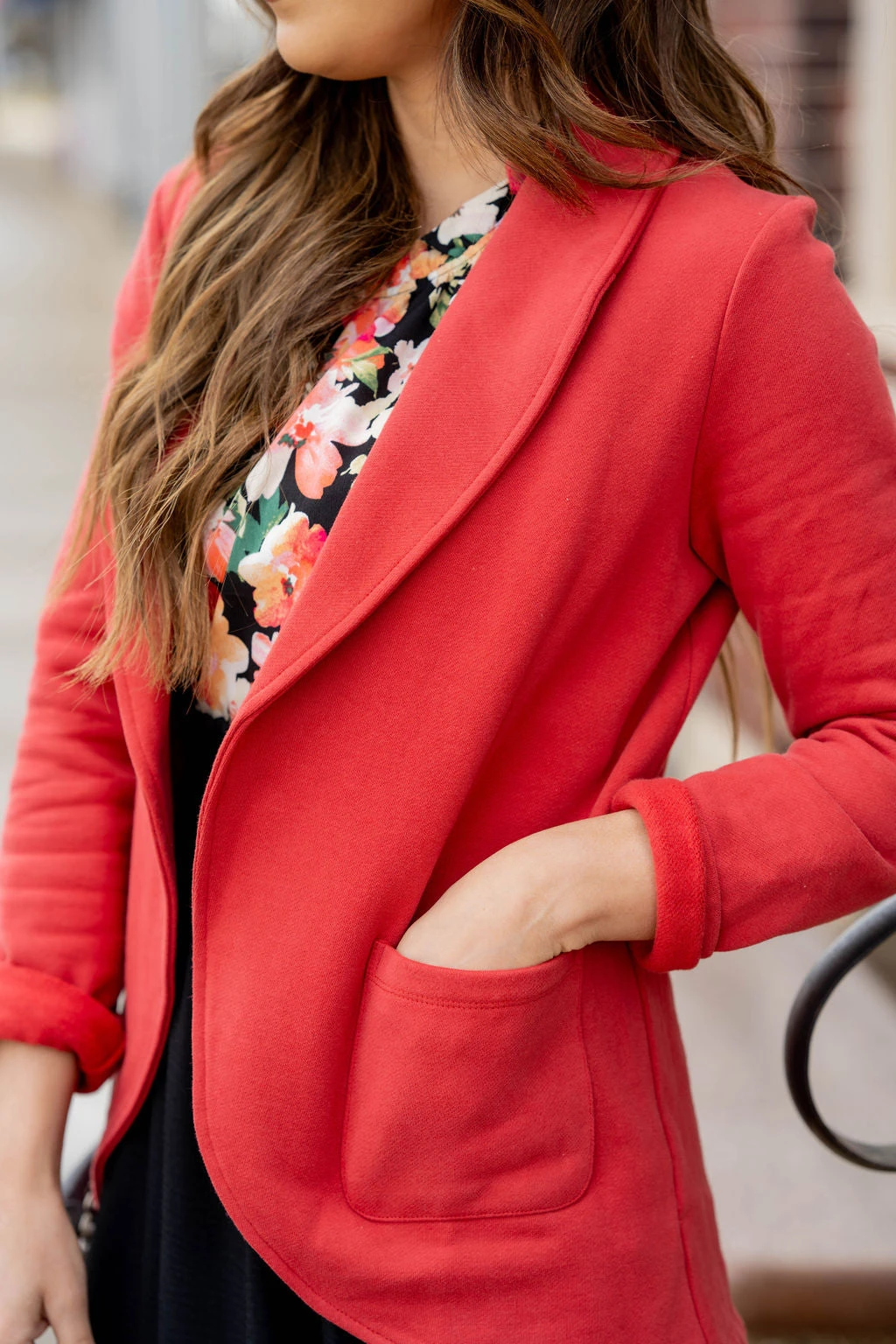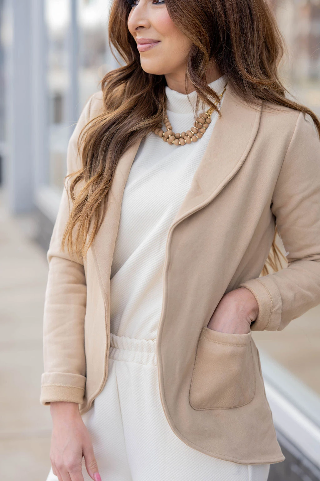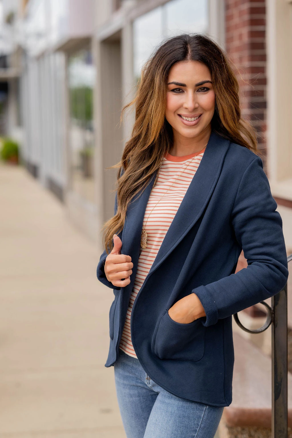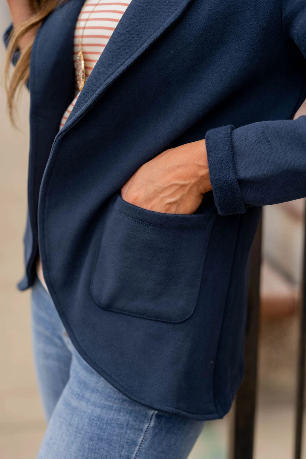 This has the look and class of a blazer with a more sweatshirt-like feel! Pair with a dress or blouse and Betsey’s Jeggings combo for the office or the classroom or with a graphic tee and denim or a basic tee with leggings for a quick yet cute on-the-go look! We love that this can transition you through all seasons!