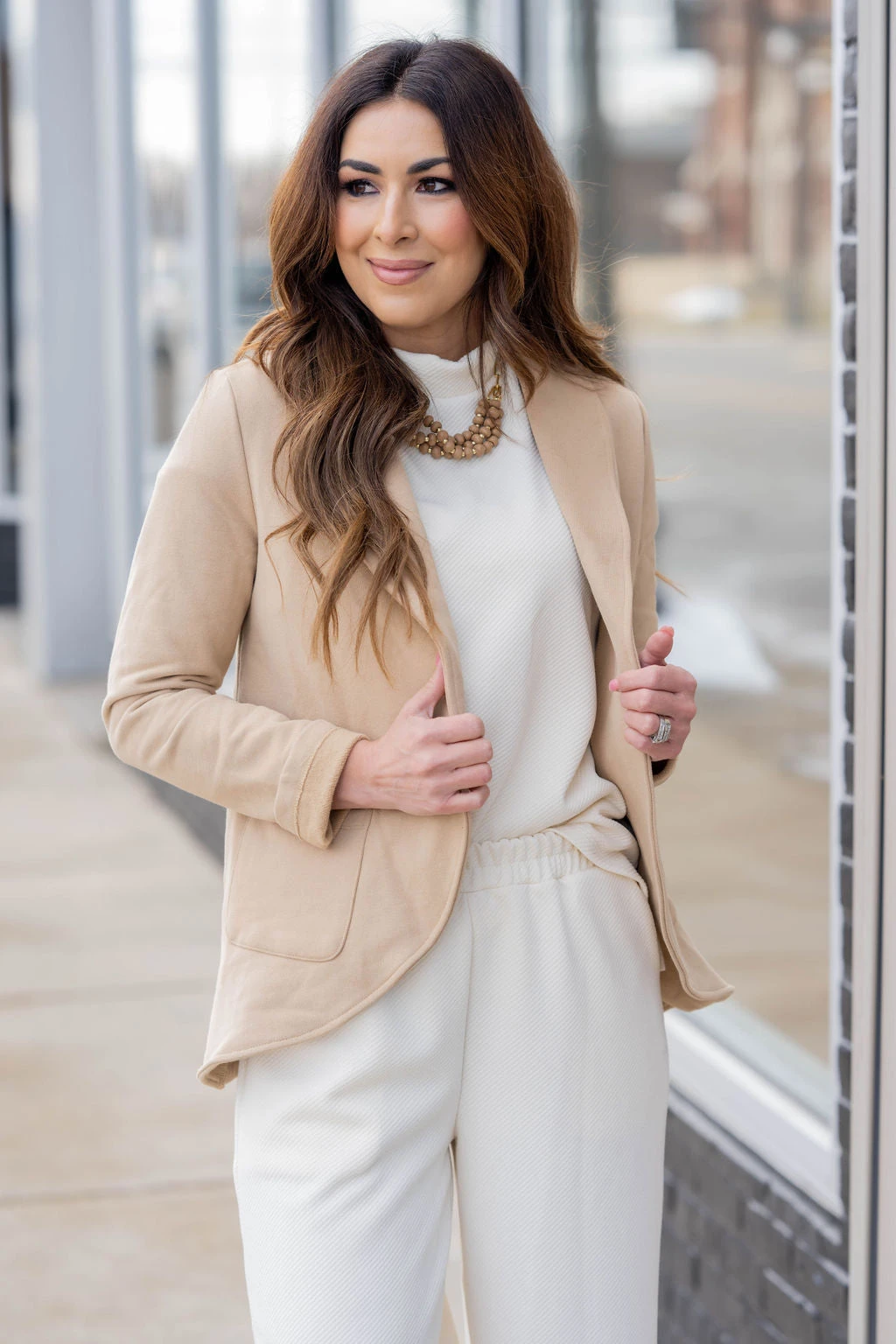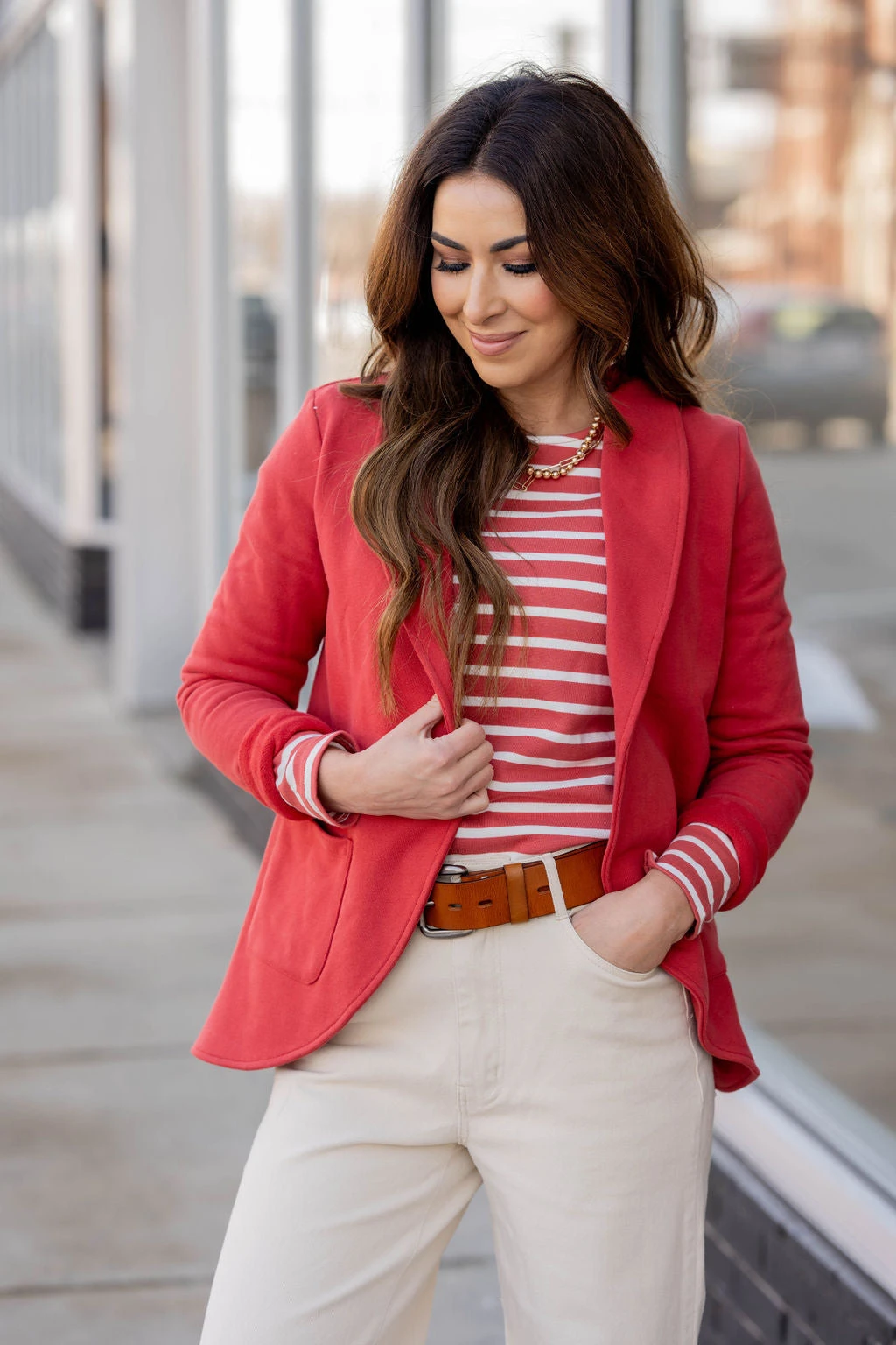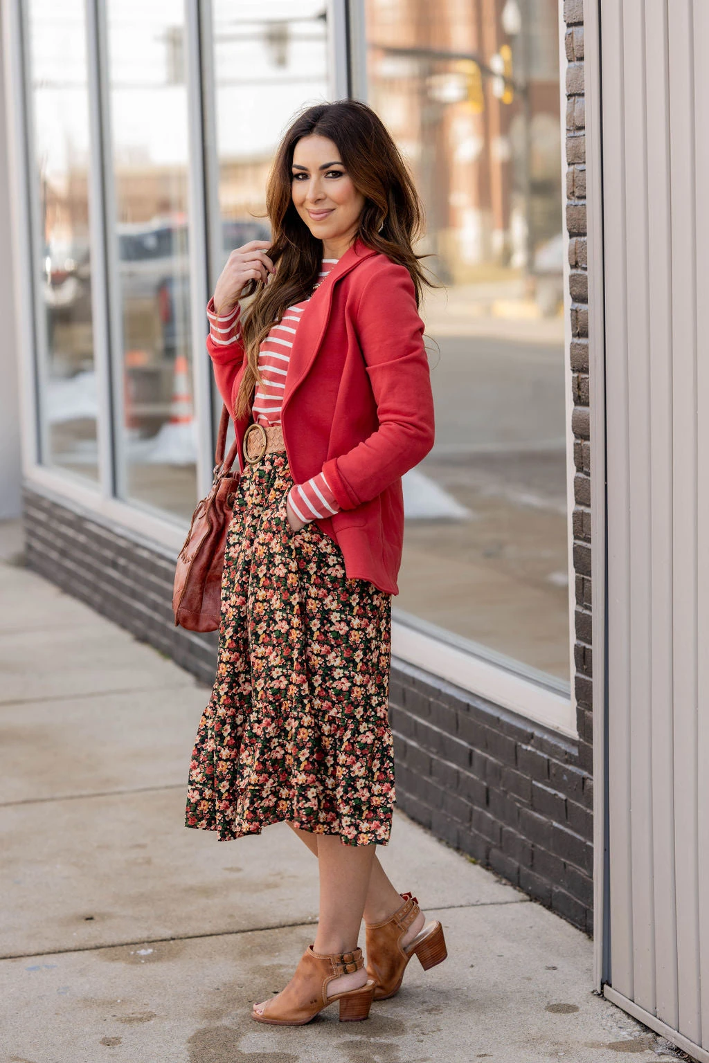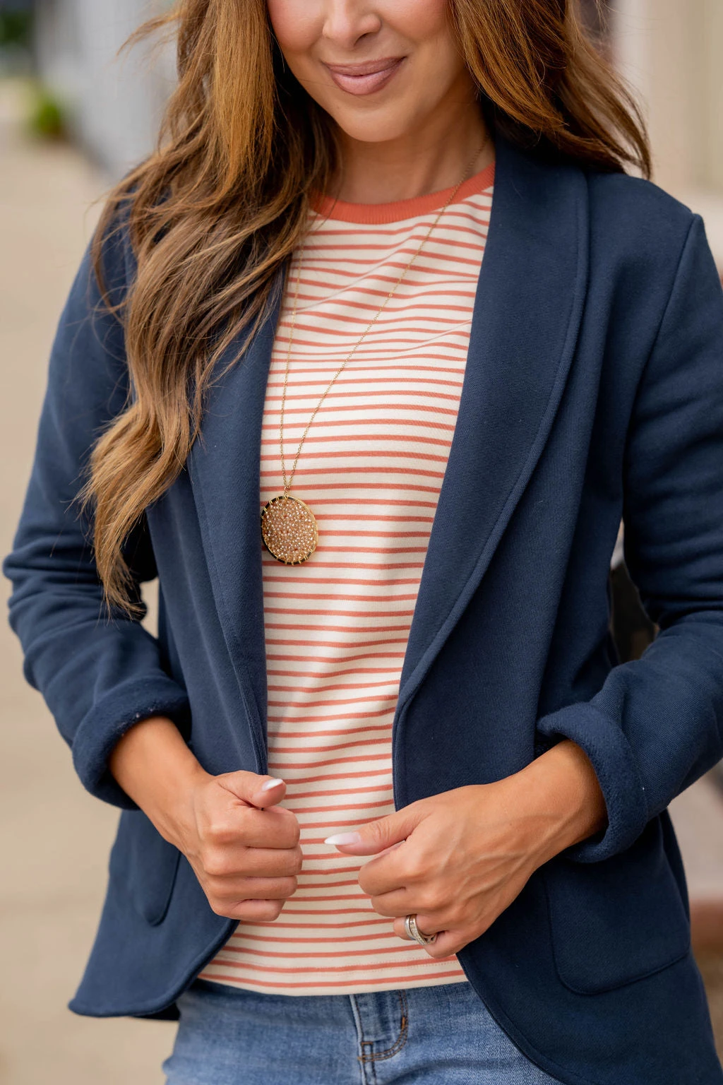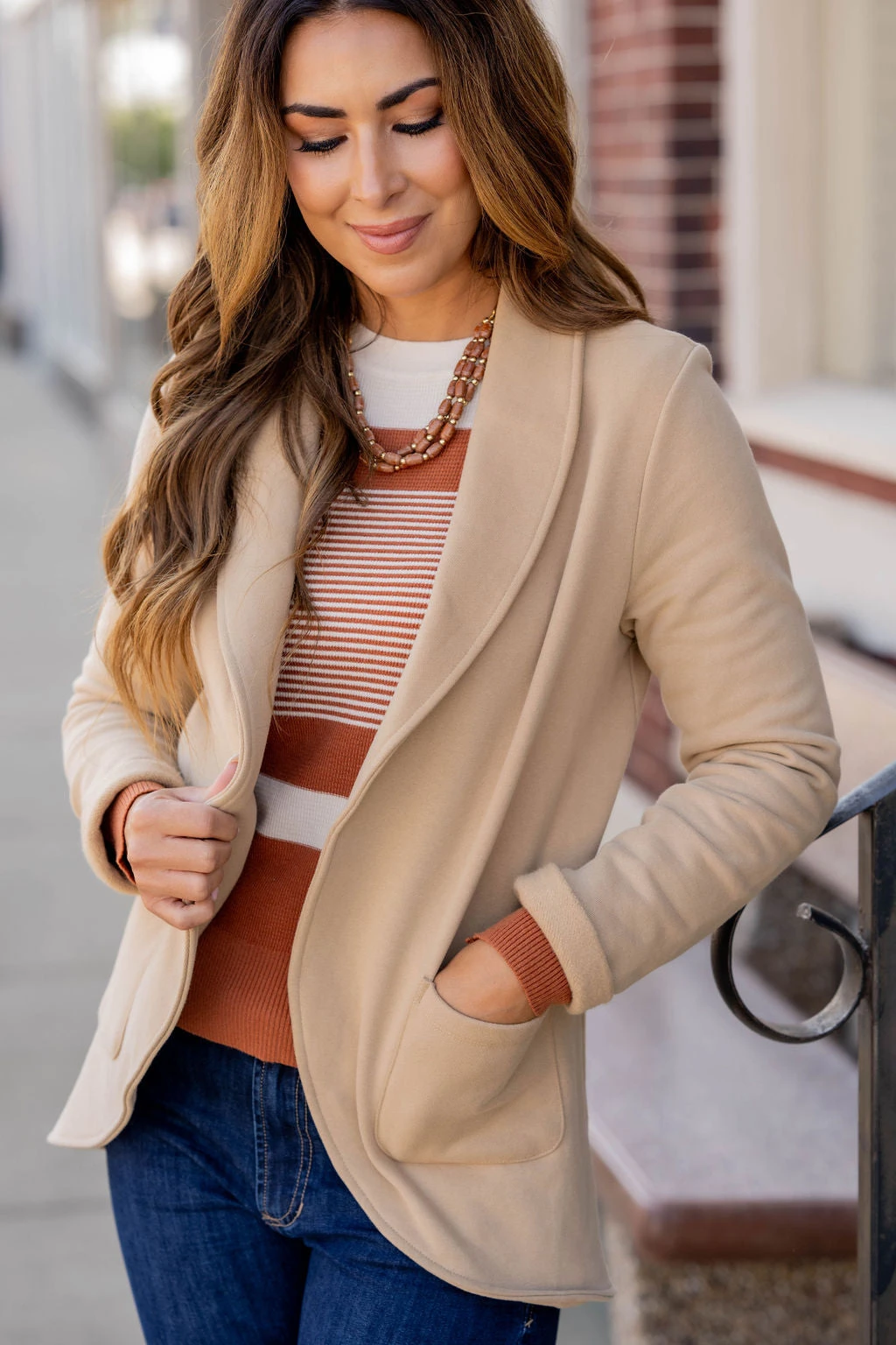 This has the look and class of a blazer with a more sweatshirt-like feel! Pair with a dress or blouse and Betsey’s Jeggings combo for the office or the classroom or with a graphic tee and denim or a basic tee with leggings for a quick yet cute on-the-go look! We love that this can transition you through all seasons!