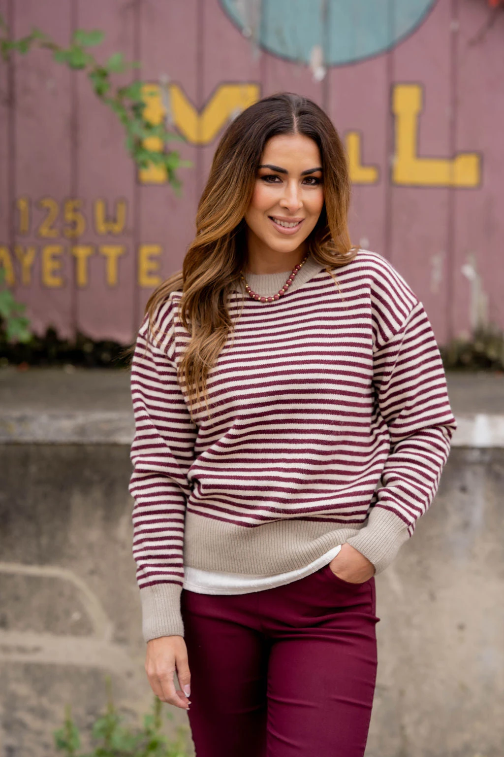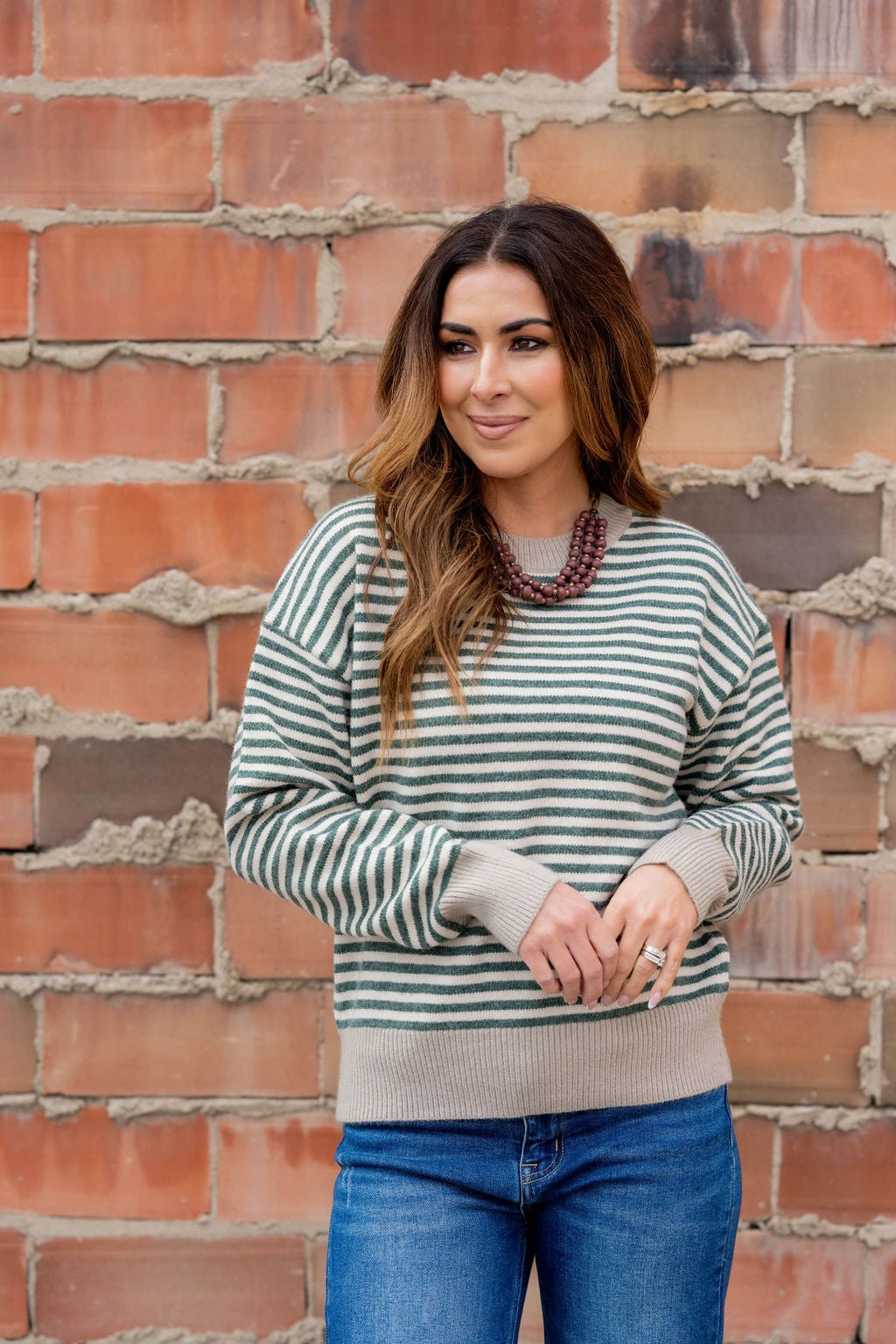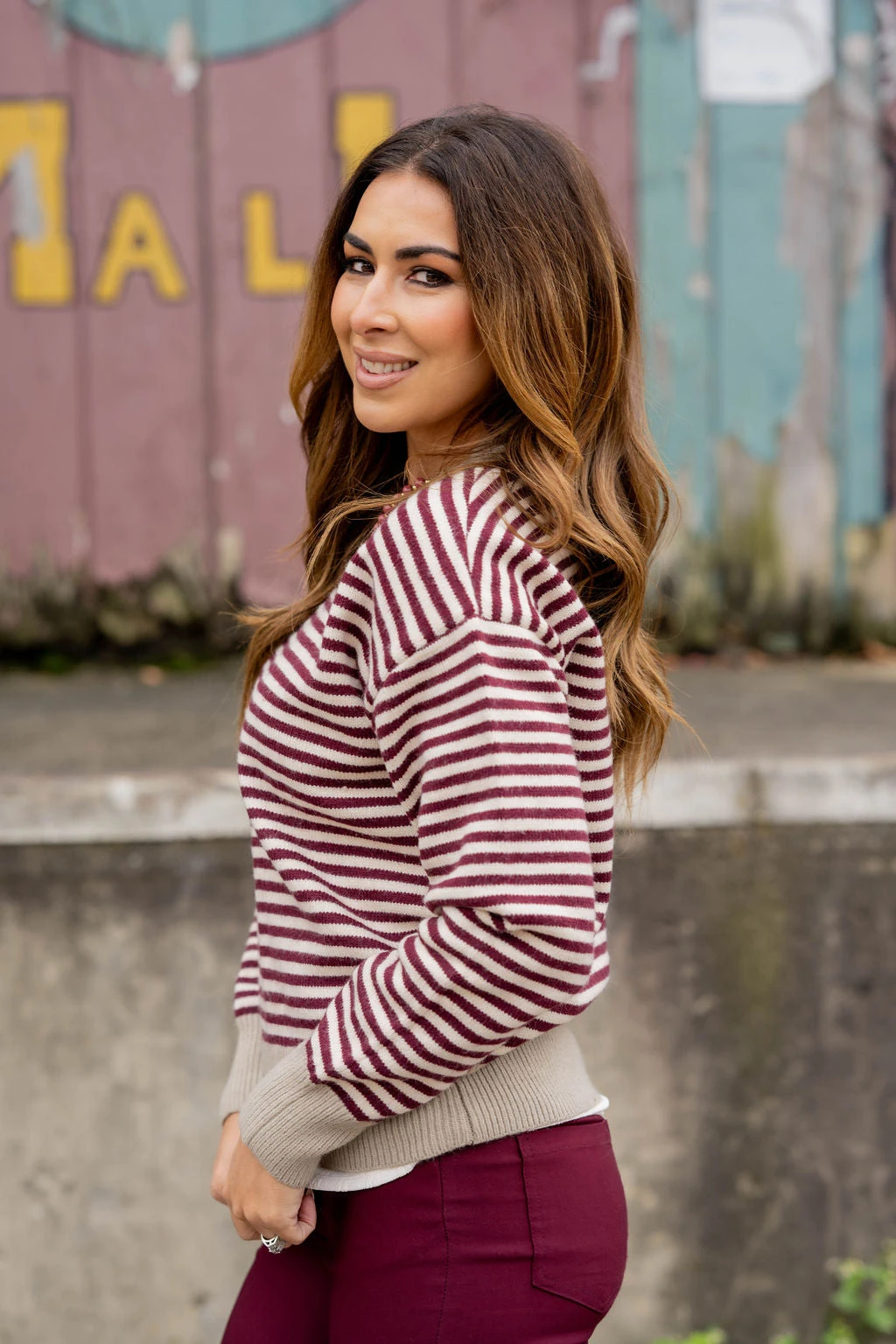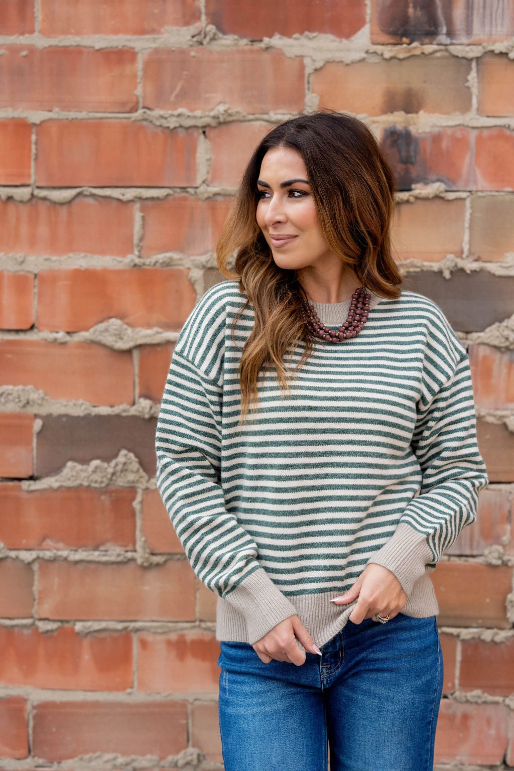 Sweater weather is upon us and we’re in love with this one! The stripes and the fun colors are so chic! Pair this sweater with jeans, accessorize and add your favorite pair of shoes for a quick, stylish look! Chilly? Add a vest or jacket with ease!!