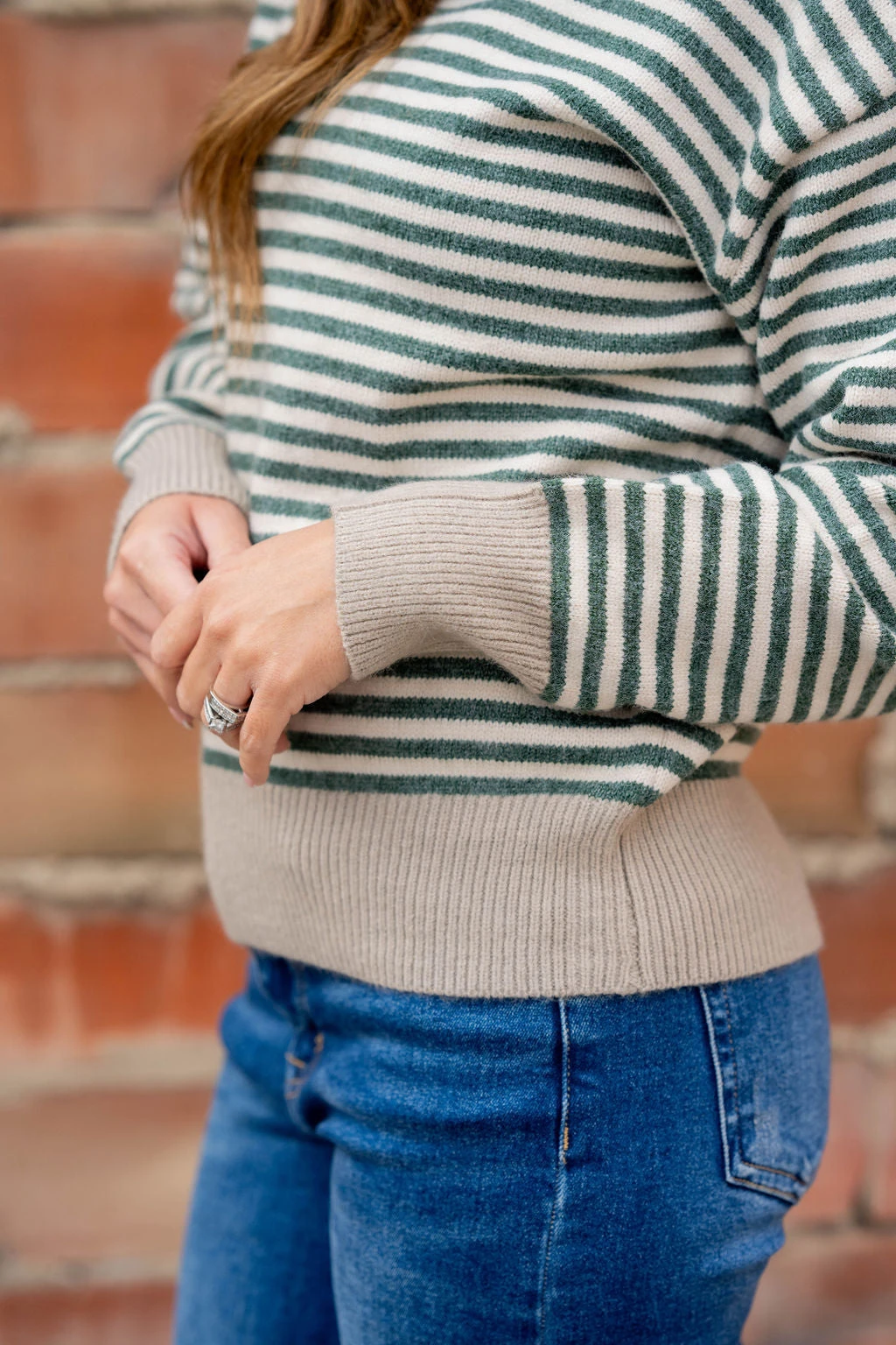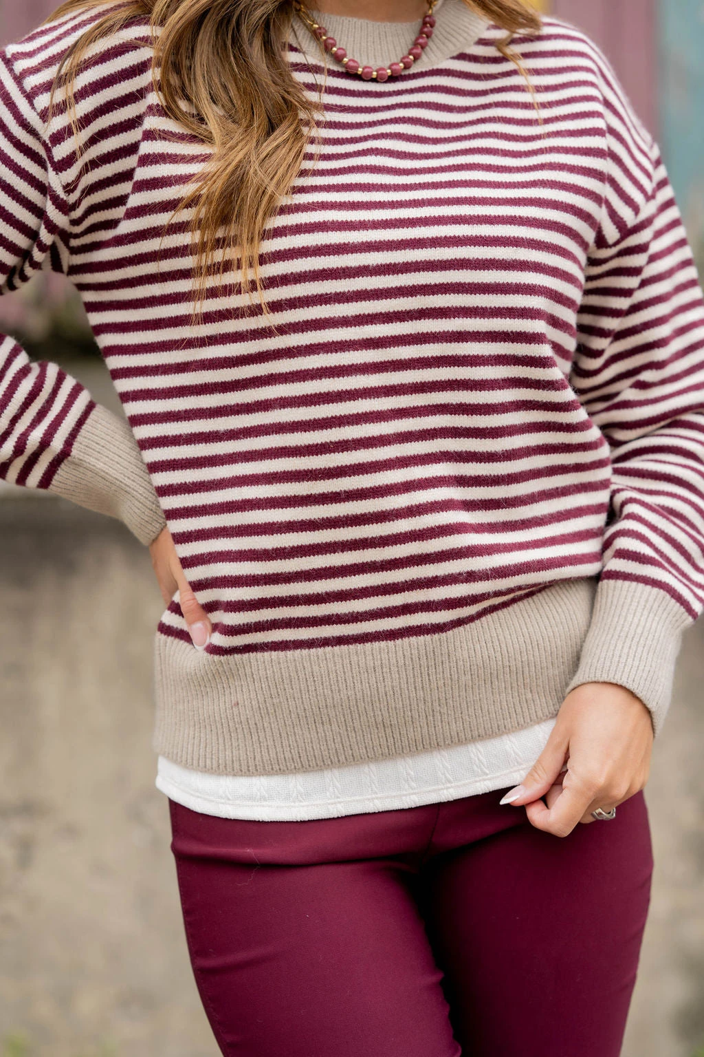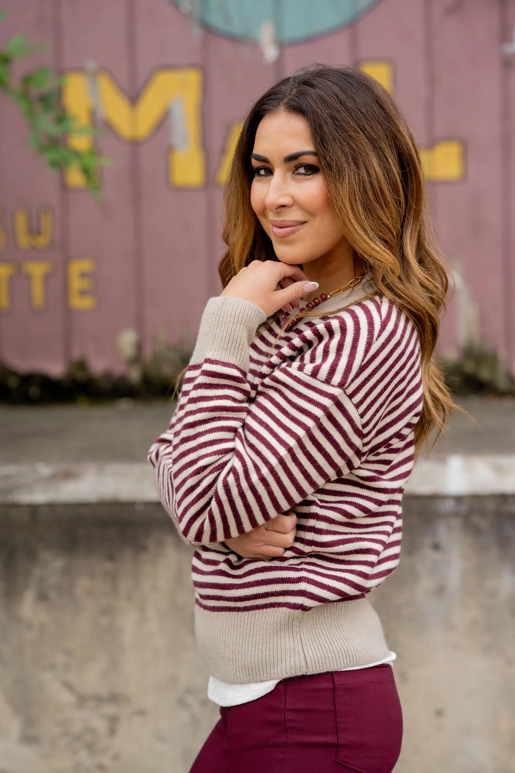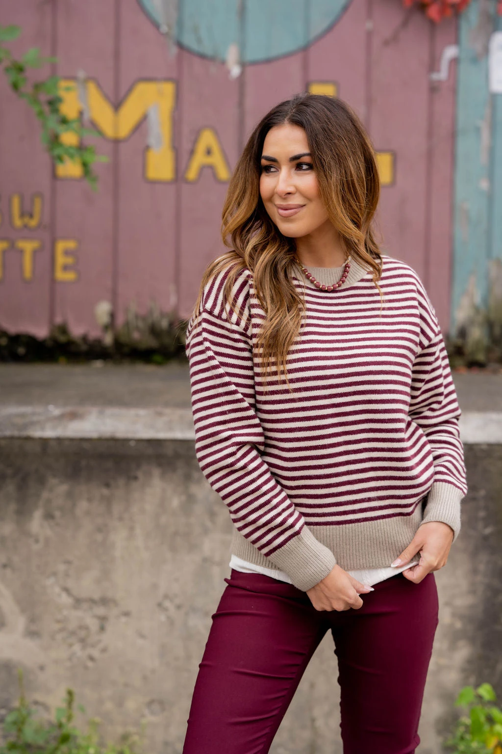 Sweater weather is upon us and we’re in love with this one! The stripes and the fun colors are so chic! Pair this sweater with jeans, accessorize and add your favorite pair of shoes for a quick, stylish look! Chilly? Add a vest or jacket with ease!!