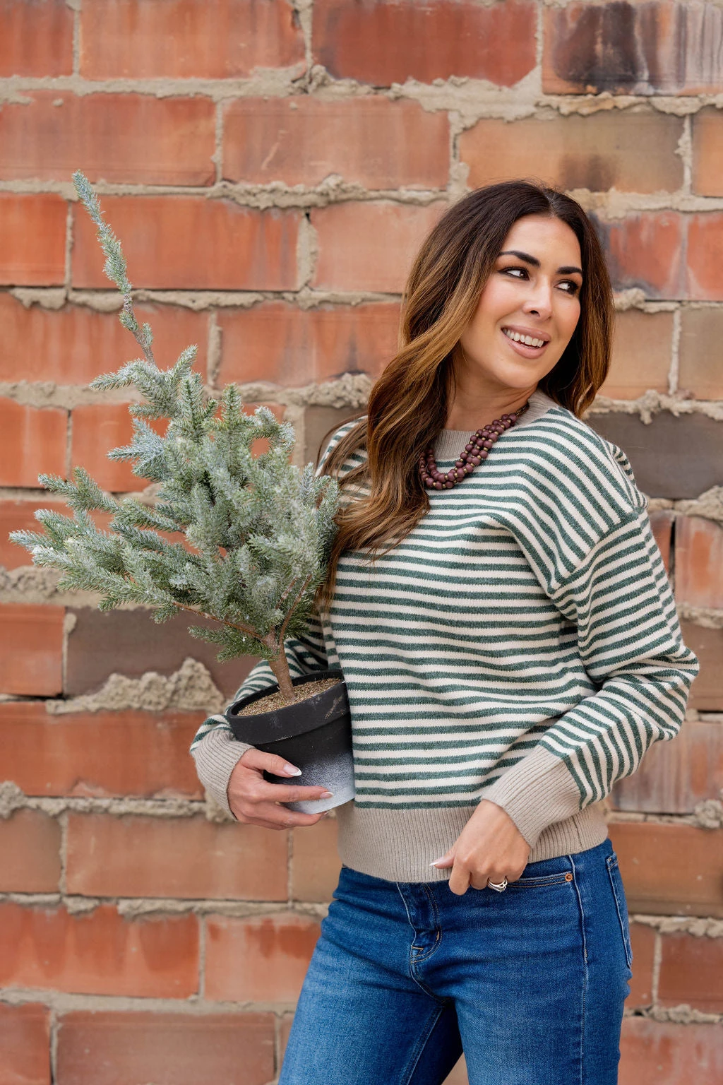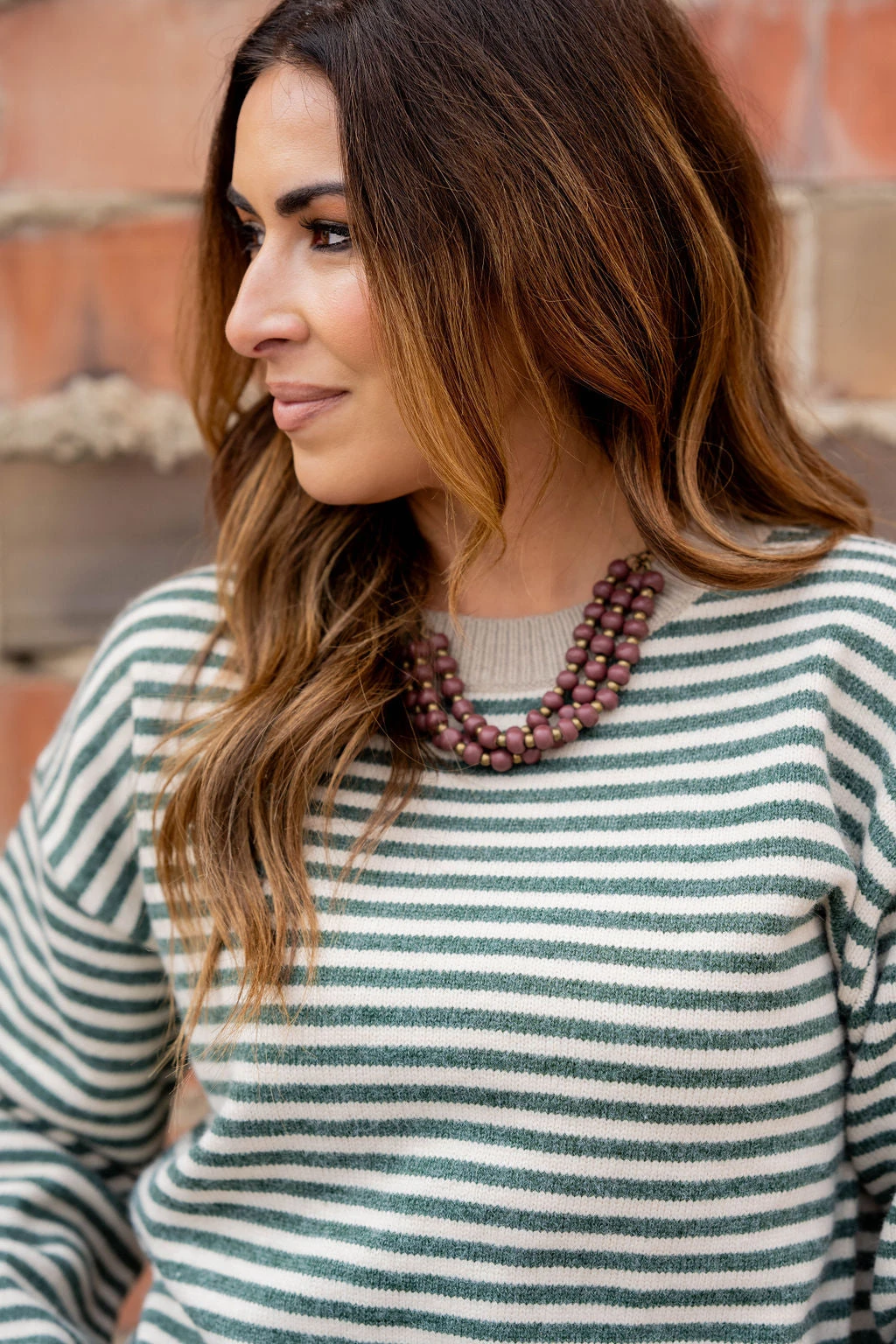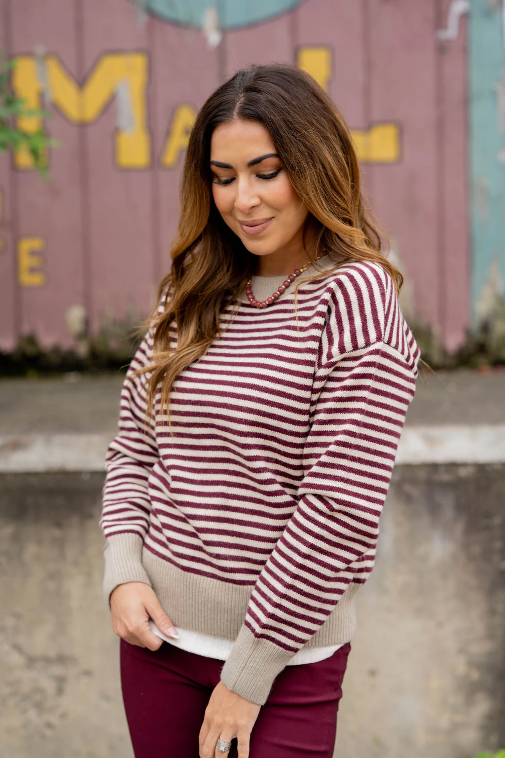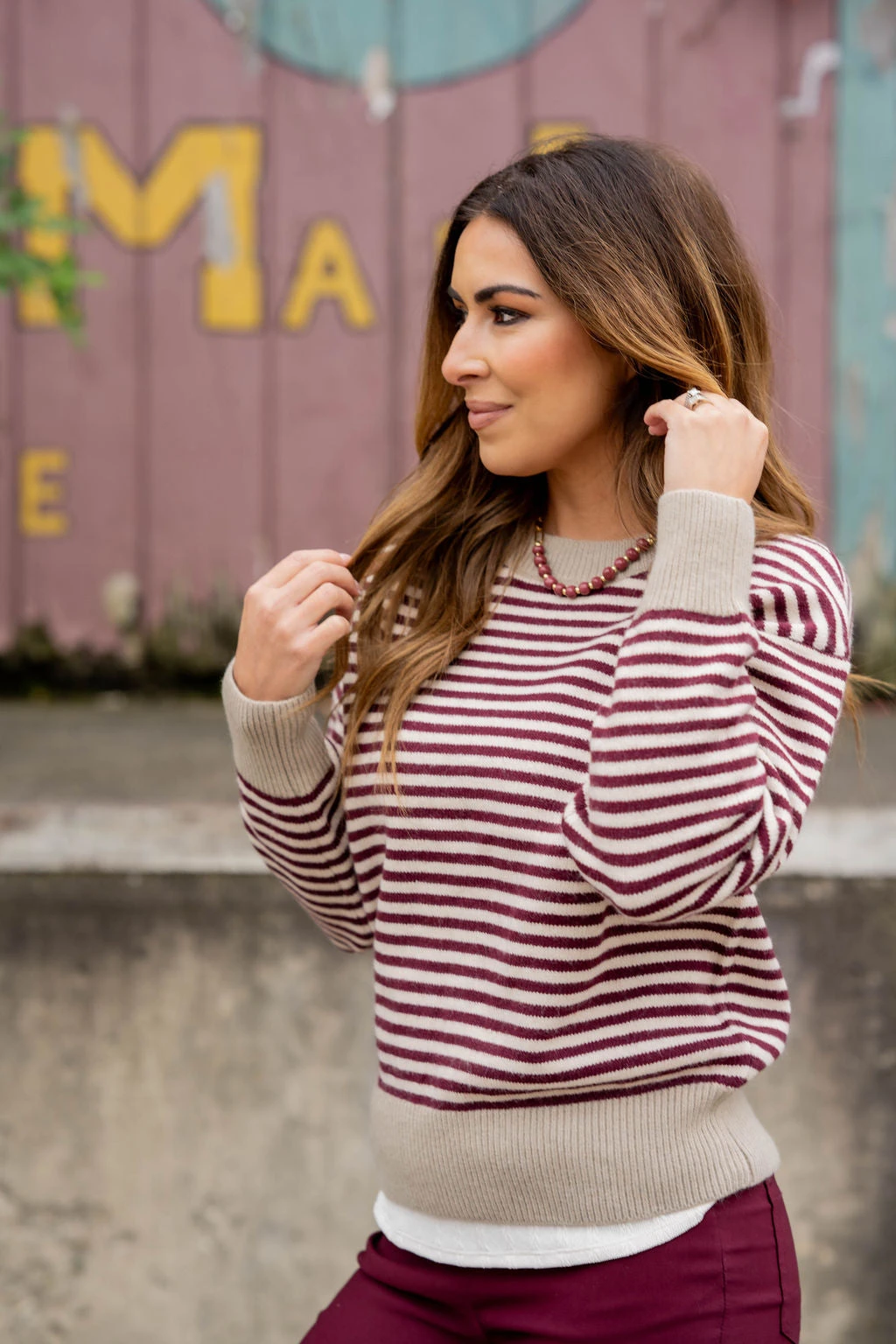 Sweater weather is upon us and we’re in love with this one! The stripes and the fun colors are so chic! Pair this sweater with jeans, accessorize and add your favorite pair of shoes for a quick, stylish look! Chilly? Add a vest or jacket with ease!!