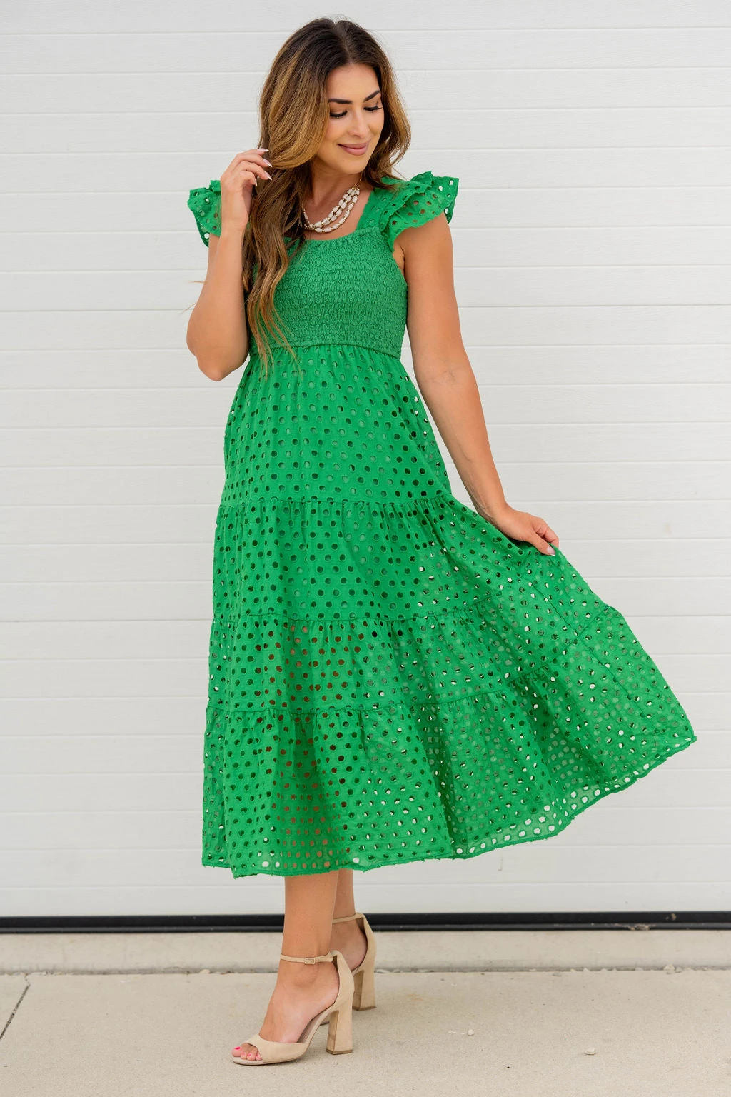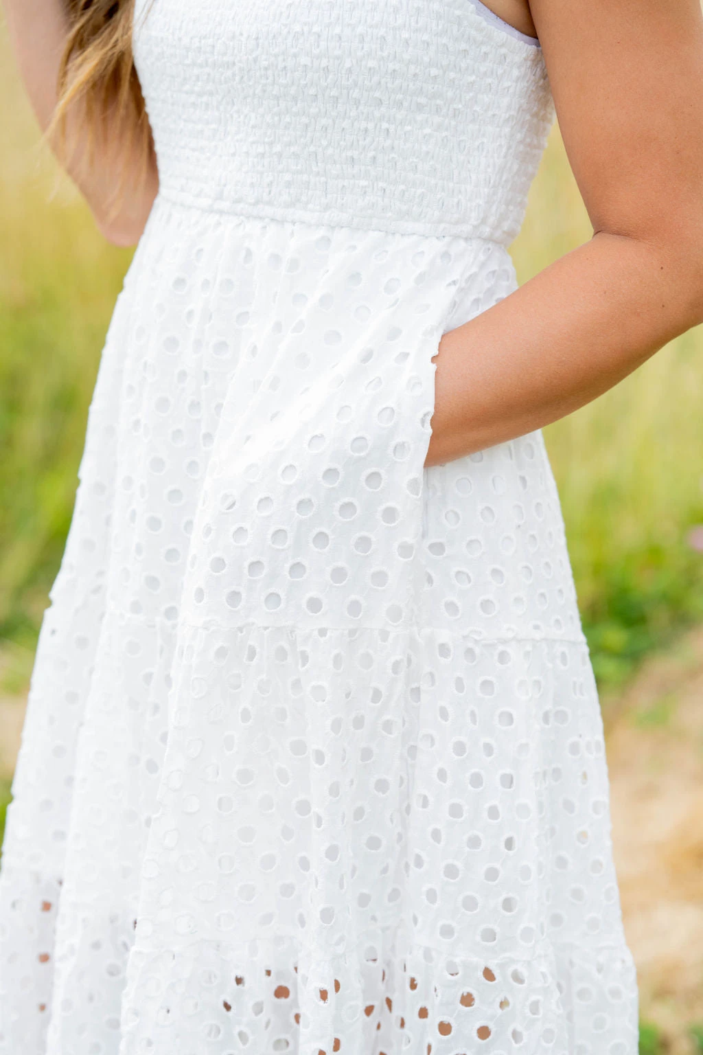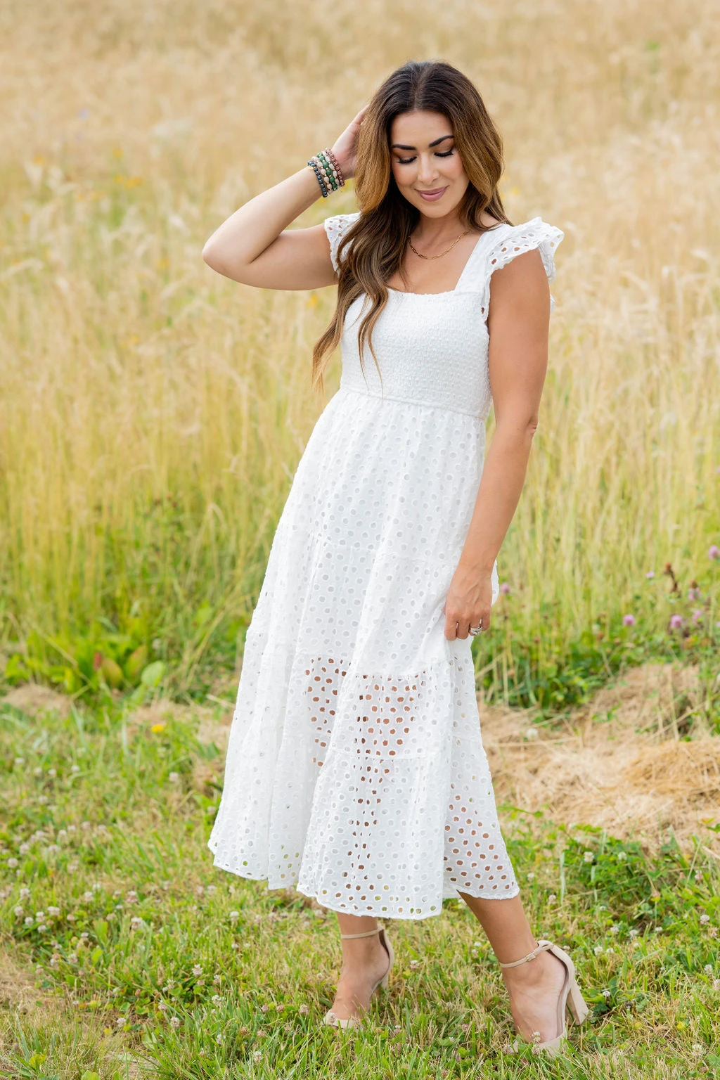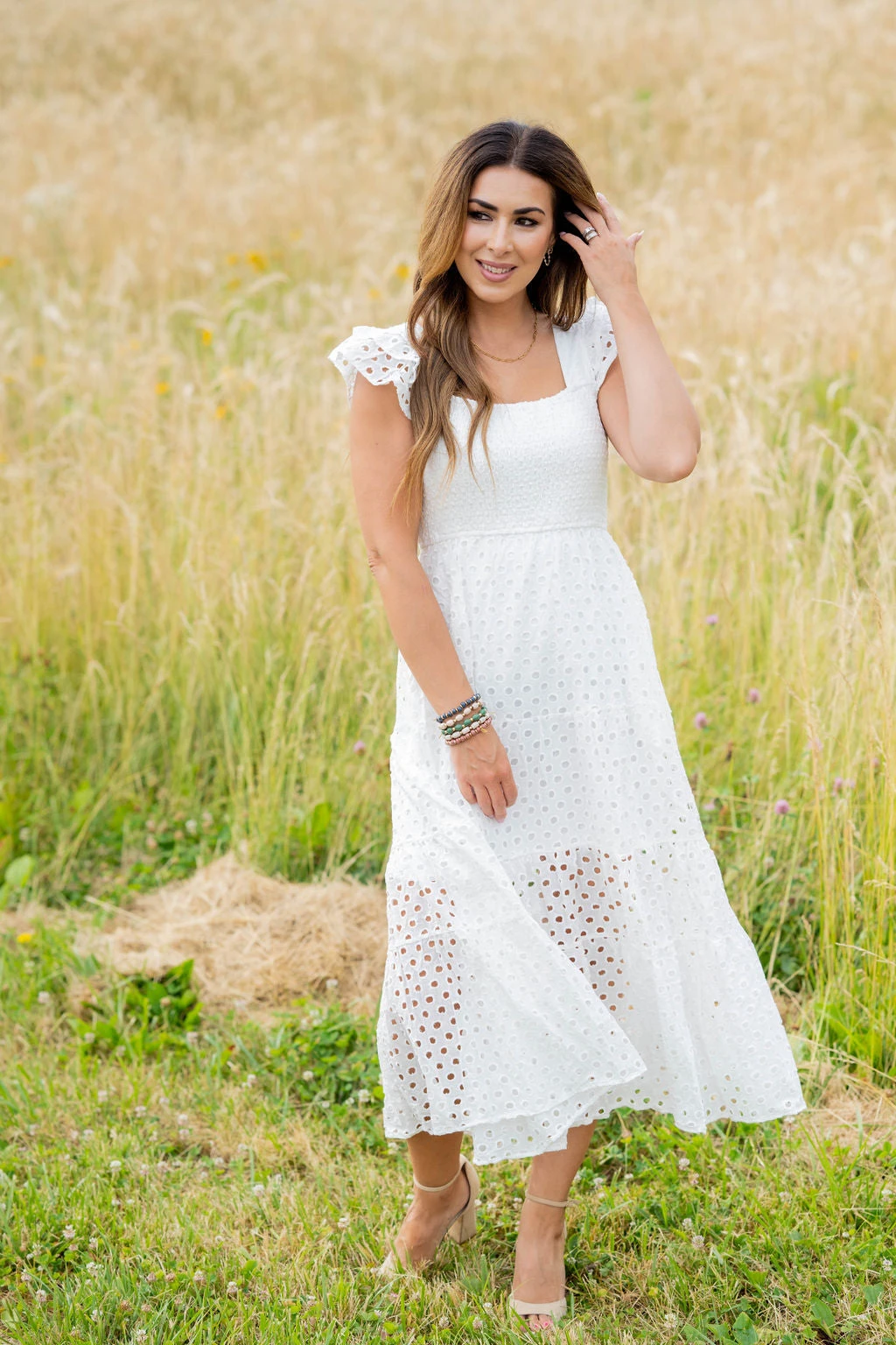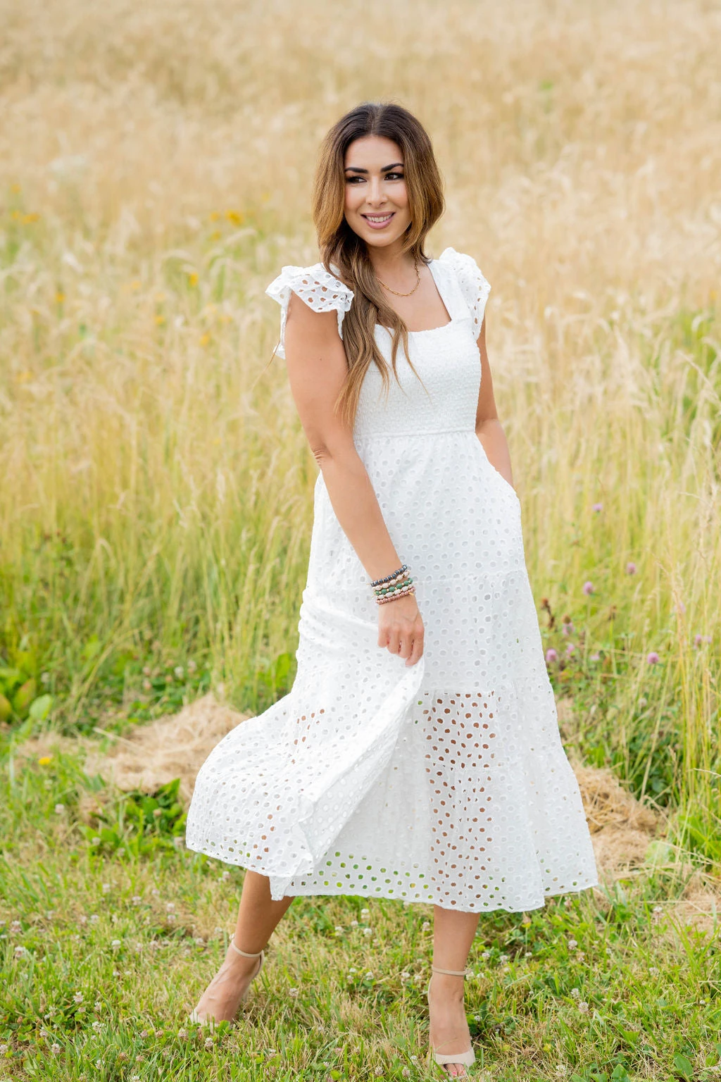 Are you looking for the perfect maxi? This one is it! With the eyelet lace, a flowy tiered style, a square neckline, and dual flutter accents, this maxi is great for day-to-day wear, but is also great for a night out! Add your favorite sandals and accessories for the warmer weather or with a cardigan, blazer, or jacket and booties for the cooler ones! This is a great staple piece for your wardrobe and easy to style your own way!